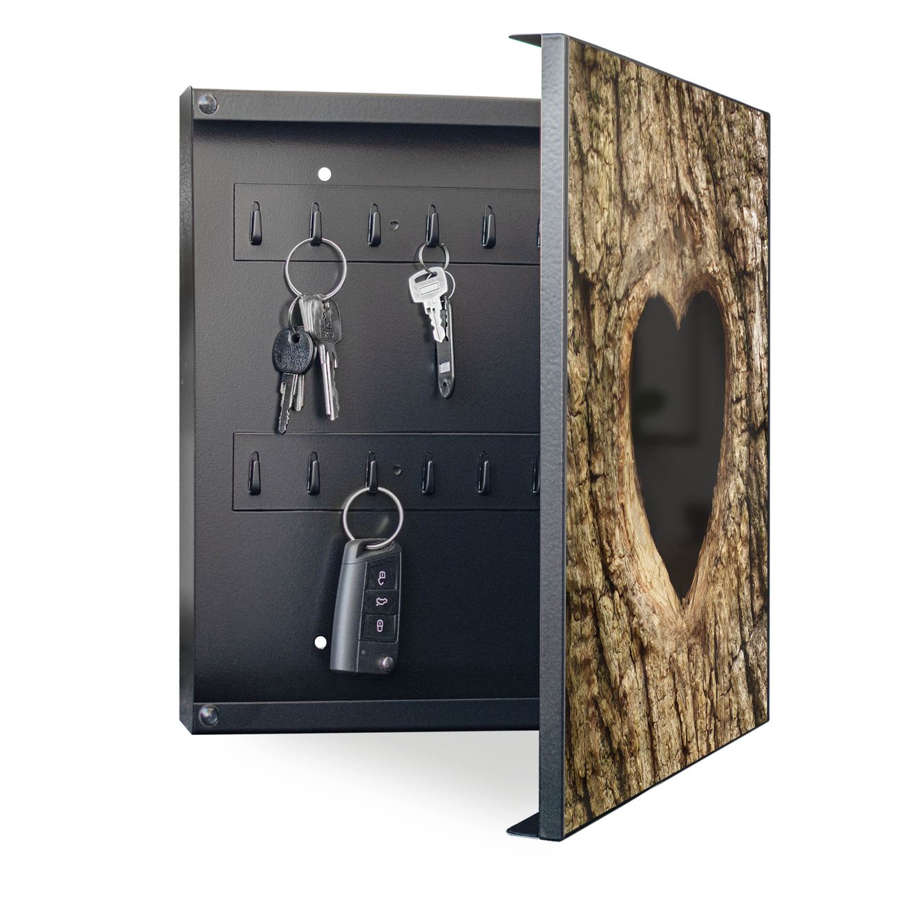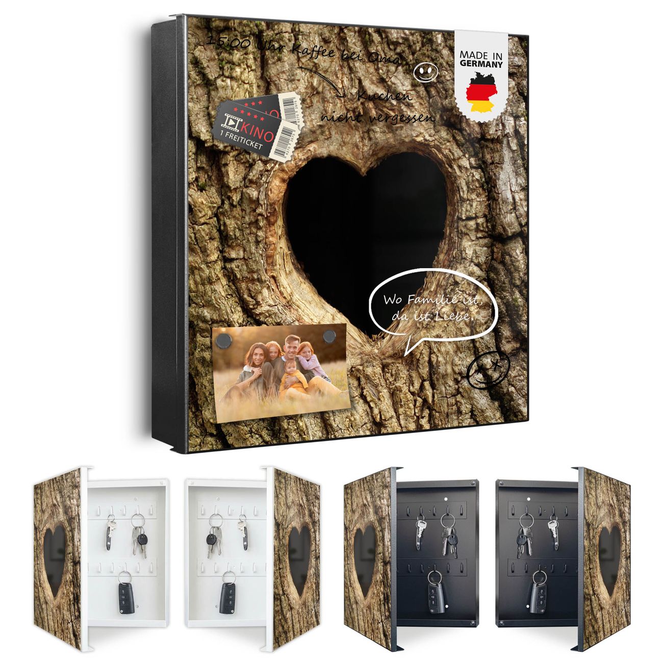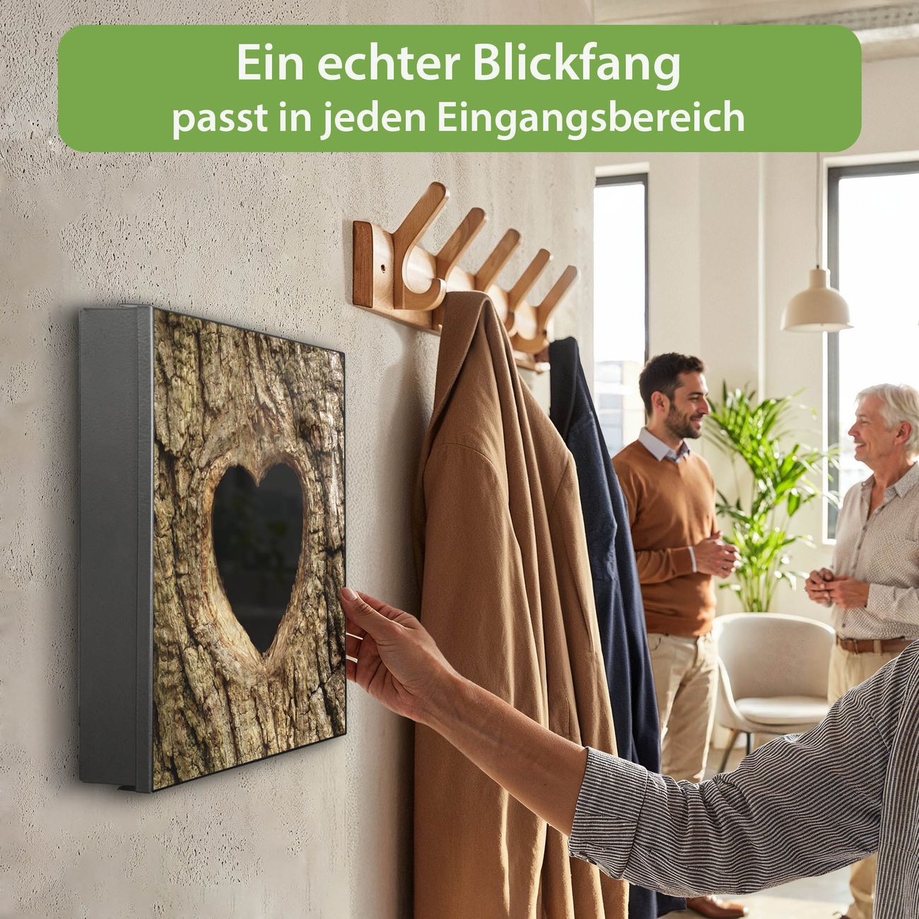 Bringe Ordnung und Eleganz in deinen Eingangsbereich mit dem banjado Schlüsselkasten Motiv Motiv Baumherz. Die moderne Schlüsselbox kombiniert funktionales Design mit hochwertiger Verarbeitung und wird so zu einem echten Hingucker in Flur, Büro oder Ferienwohnung. ✅ Stilvolle Schlüsselaufbewahrung mit Motiv Motiv Baumherz Der Design-Schlüsselkasten Motiv Motiv Baumherz bietet Platz für bis zu 32 Schlüssel, die auf 4 stabilen Reihen mit je 8 Haken übersichtlich verstaut werden. Mit seinen kompakten Maßen von 30 x 30 x 5 cm passt die Schlüsselbox perfekt auch in kleinere Räume. Der schwarz lackierte Stahlkorpus mit rechts angeschlagenem Türscharnier harmoniert mit gedruckten Folie auf der Front und fügt sich nahtlos in jedes Wohnambiente ein. Ob als Schlüsselorganizer für Zuhause oder als praktische Lösung für Büros, Praxen und Gewerbe, der banjado Schlüsselkasten sorgt für Ordnung und Übersicht. Dank der magnetischen, mit Kreidestiften beschreibbaren Folie auf der Front kannst du Notizen anheften oder Termine direkt auf der Oberfläche festhalten. Die Schlüsselbox Motiv Motiv Baumherz zur Wandmontage wird inklusive Befestigungsmaterial geliefert und ist schnell angebracht. So hast du deine Schlüssel jederzeit griffbereit und zugleich stilvoll verstaut. Mit diesem banjado Schlüsselkasten Motiv Motiv Baumherz kombinierst du praktische Aufbewahrung mit stilvollem Wohndesign. Ob privat oder geschäftlich, die Schlüsselbox sorgt für mehr Ordnung, Übersicht und ein wohnliches Ambiente.Vorteile im Überblick
