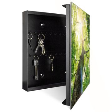 Bringe Ordnung und Eleganz in deinen Eingangsbereich mit dem banjado Schlüsselkasten Motiv Motiv Baumkrone. Die moderne Schlüsselbox kombiniert funktionales Design mit hochwertiger Verarbeitung und wird so zu einem echten Hingucker in Flur, Büro oder Ferienwohnung. ✅ Stilvolle Schlüsselaufbewahrung mit Glasfront im Motiv Motiv Baumkrone Der Design-Schlüsselkasten Motiv Motiv Baumkrone bietet Platz für bis zu 50 Schlüssel, die auf 5 stabilen Reihen mit je 10 Haken übersichtlich verstaut werden. Mit seinen kompakten Maßen von 30 x 30 x 5 cm passt die Schlüsselbox perfekt auch in kleinere Räume. Der schwarz lackierte Stahlkorpus mit rechts angeschlagenem Türscharnier harmoniert mit der Glasfront und fügt sich nahtlos in jedes Wohnambiente ein. Ob als Schlüsselorganizer für Zuhause oder als praktische Lösung für Büros, Praxen und Gewerbe, der banjado Schlüsselkasten sorgt für Ordnung und Übersicht. Dank der magnetischen, mit Kreidestiften beschreibbaren Glasfront kannst du Notizen anheften oder Termine direkt auf der Oberfläche festhalten. Die Schlüsselbox Motiv Motiv Baumkrone zur Wandmontage wird inklusive Befestigungsmaterial geliefert und ist schnell angebracht. So hast du deine Schlüssel jederzeit griffbereit und zugleich stilvoll verstaut. Mit diesem banjado Schlüsselkasten Motiv Motiv Baumkrone kombinierst du praktische Aufbewahrung mit stilvollem Wohndesign. Ob privat oder geschäftlich, die Schlüsselbox sorgt für mehr Ordnung, Übersicht und ein wohnliches Ambiente.Vorteile im Überblick