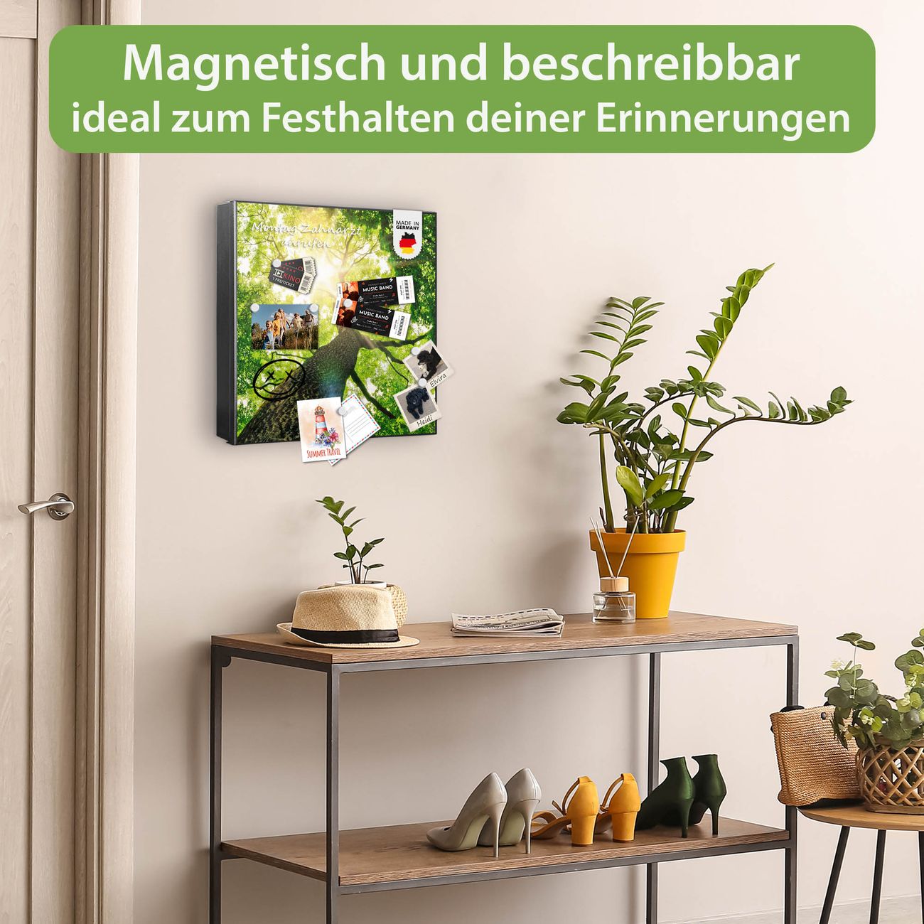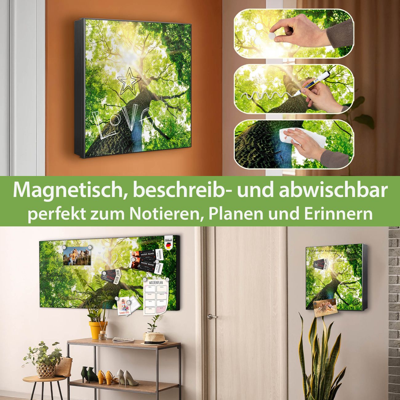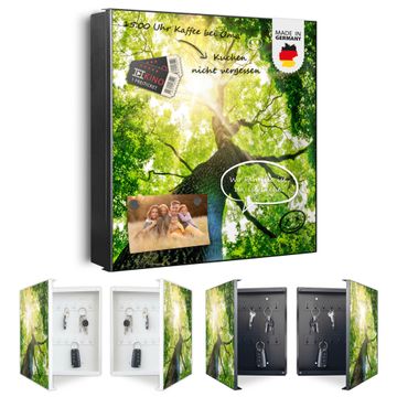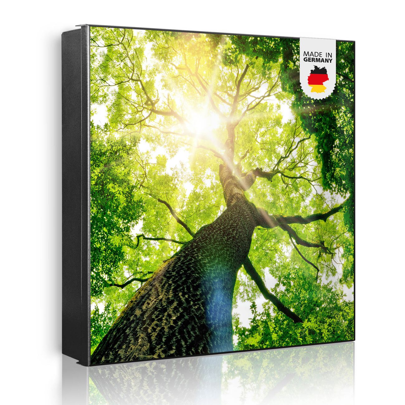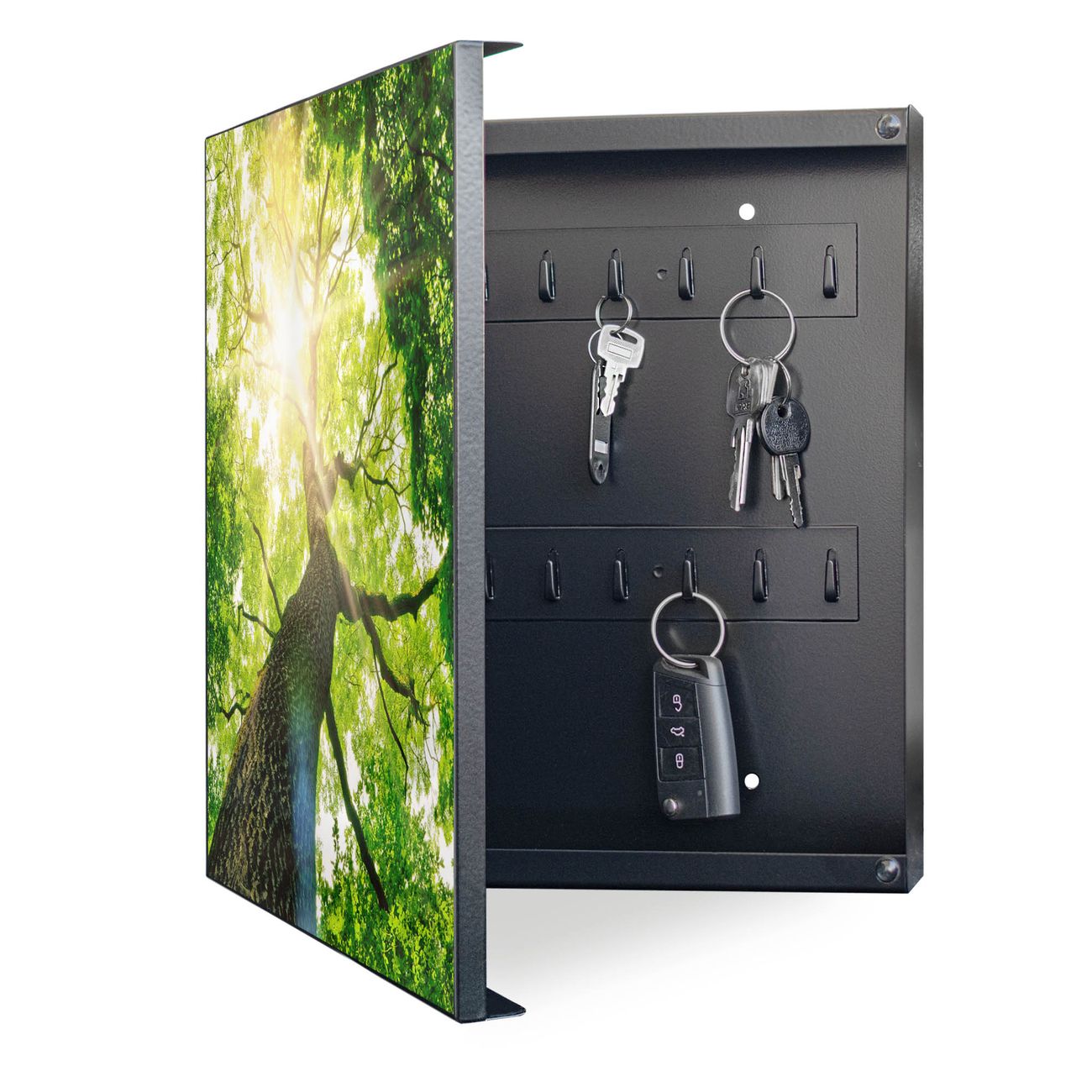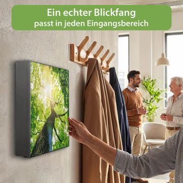 Bringe Ordnung und Eleganz in deinen Eingangsbereich mit dem banjado Schlüsselkasten Motiv Motiv Baumkrone. Die moderne Schlüsselbox kombiniert funktionales Design mit hochwertiger Verarbeitung und wird so zu einem echten Hingucker in Flur, Büro oder Ferienwohnung. ✅ Stilvolle Schlüsselaufbewahrung mit Motiv Motiv Baumkrone Der Design-Schlüsselkasten Motiv Motiv Baumkrone bietet Platz für bis zu 32 Schlüssel, die auf 4 stabilen Reihen mit je 8 Haken übersichtlich verstaut werden. Mit seinen kompakten Maßen von 30 x 30 x 5 cm passt die Schlüsselbox perfekt auch in kleinere Räume. Der schwarz lackierte Stahlkorpus mit links angeschlagenem Türscharnier harmoniert mit gedruckten Folie auf der Front und fügt sich nahtlos in jedes Wohnambiente ein. Ob als Schlüsselorganizer für Zuhause oder als praktische Lösung für Büros, Praxen und Gewerbe, der banjado Schlüsselkasten sorgt für Ordnung und Übersicht. Dank der magnetischen, mit Kreidestiften beschreibbaren Folie auf der Front kannst du Notizen anheften oder Termine direkt auf der Oberfläche festhalten. Die Schlüsselbox Motiv Motiv Baumkrone zur Wandmontage wird inklusive Befestigungsmaterial geliefert und ist schnell angebracht. So hast du deine Schlüssel jederzeit griffbereit und zugleich stilvoll verstaut. Mit diesem banjado Schlüsselkasten Motiv Motiv Baumkrone kombinierst du praktische Aufbewahrung mit stilvollem Wohndesign. Ob privat oder geschäftlich, die Schlüsselbox sorgt für mehr Ordnung, Übersicht und ein wohnliches Ambiente.Vorteile im Überblick