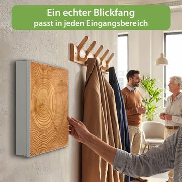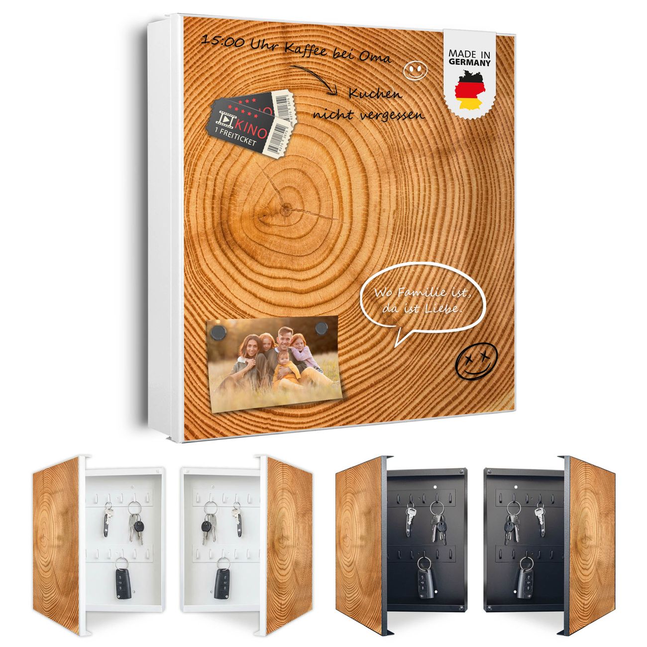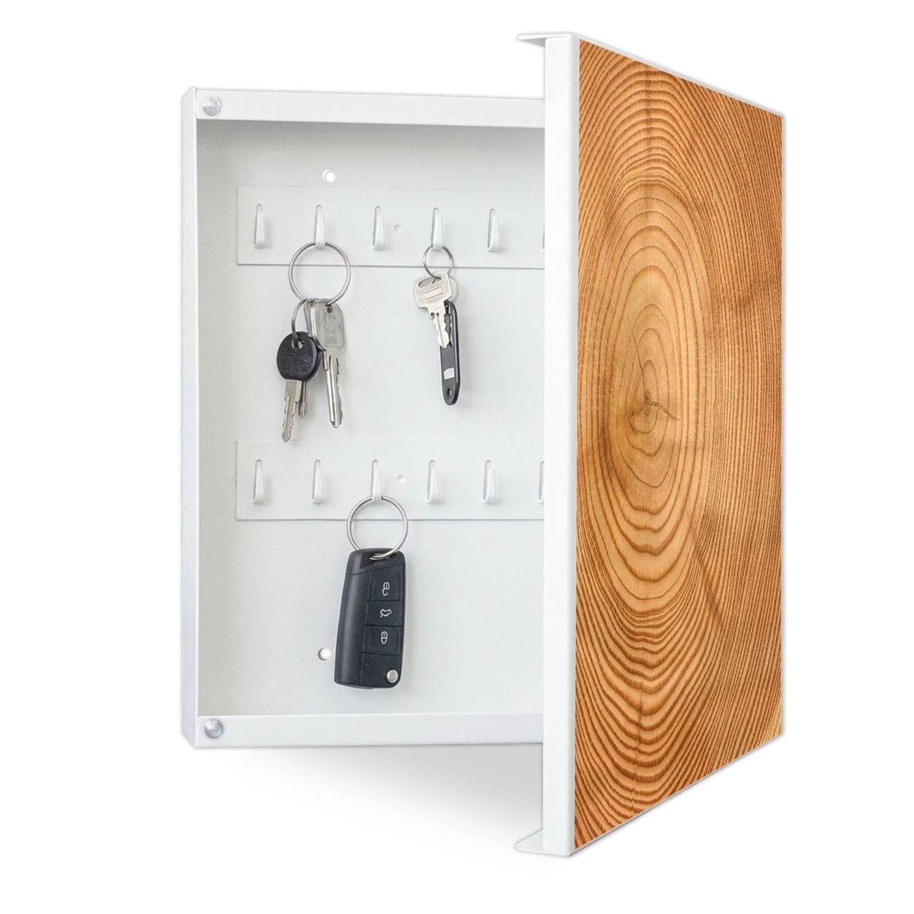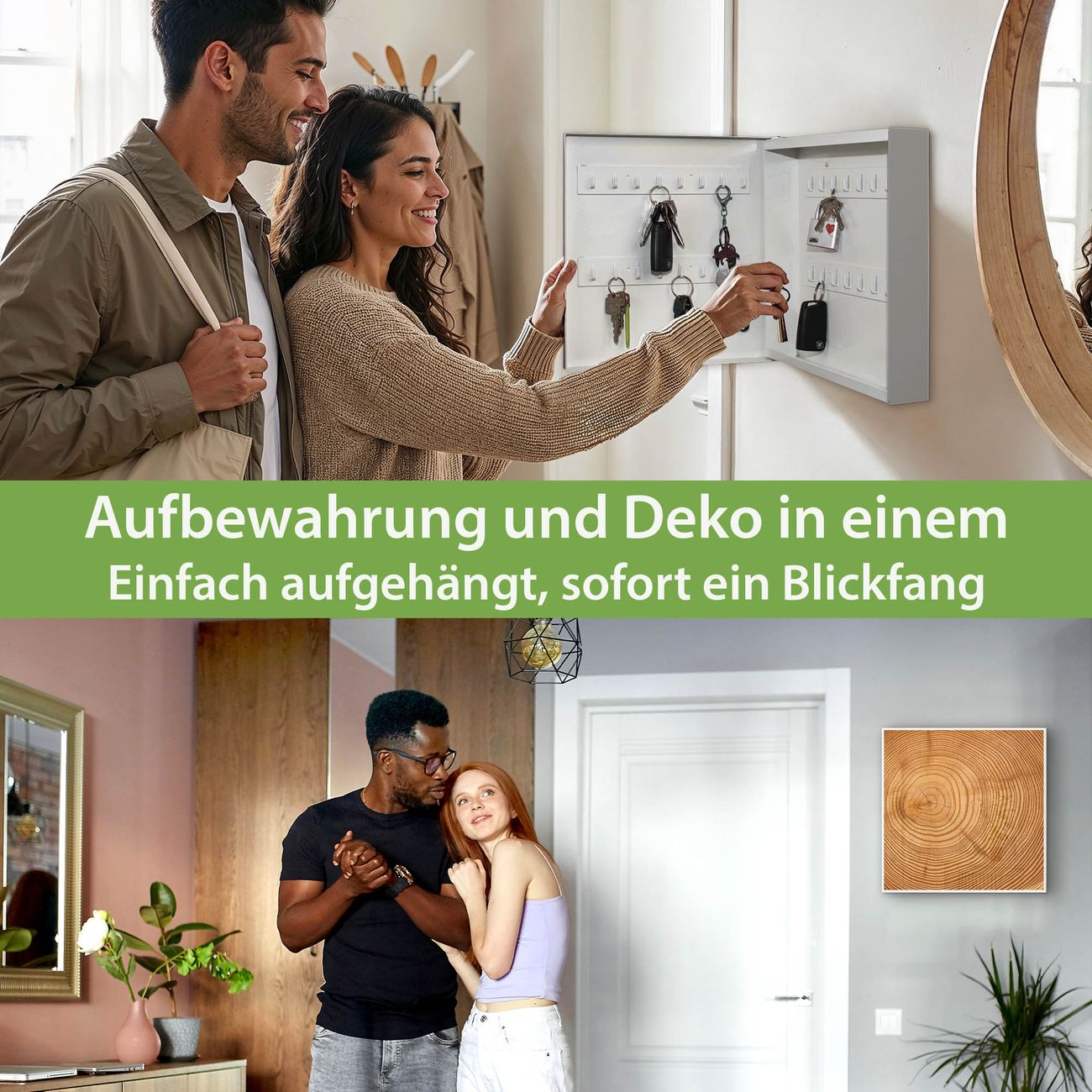 Bringe Ordnung und Eleganz in deinen Eingangsbereich mit dem banjado Schlüsselkasten Motiv Motiv Baumstamm. Die moderne Schlüsselbox kombiniert funktionales Design mit hochwertiger Verarbeitung und wird so zu einem echten Hingucker in Flur, Büro oder Ferienwohnung. ✅ Stilvolle Schlüsselaufbewahrung mit Motiv Motiv Baumstamm Der Design-Schlüsselkasten Motiv Motiv Baumstamm bietet Platz für bis zu 32 Schlüssel, die auf 4 stabilen Reihen mit je 8 Haken übersichtlich verstaut werden. Mit seinen kompakten Maßen von 30 x 30 x 5 cm passt die Schlüsselbox perfekt auch in kleinere Räume. Der weiß lackierte Stahlkorpus mit rechts angeschlagenem Türscharnier harmoniert mit gedruckten Folie auf der Front und fügt sich nahtlos in jedes Wohnambiente ein. Ob als Schlüsselorganizer für Zuhause oder als praktische Lösung für Büros, Praxen und Gewerbe, der banjado Schlüsselkasten sorgt für Ordnung und Übersicht. Dank der magnetischen, mit Kreidestiften beschreibbaren Folie auf der Front kannst du Notizen anheften oder Termine direkt auf der Oberfläche festhalten. Die Schlüsselbox Motiv Motiv Baumstamm zur Wandmontage wird inklusive Befestigungsmaterial geliefert und ist schnell angebracht. So hast du deine Schlüssel jederzeit griffbereit und zugleich stilvoll verstaut. Mit diesem banjado Schlüsselkasten Motiv Motiv Baumstamm kombinierst du praktische Aufbewahrung mit stilvollem Wohndesign. Ob privat oder geschäftlich, die Schlüsselbox sorgt für mehr Ordnung, Übersicht und ein wohnliches Ambiente.Vorteile im Überblick