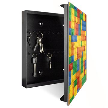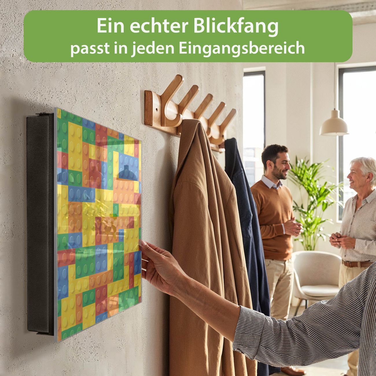 Bringe Ordnung und Eleganz in deinen Eingangsbereich mit dem banjado Schlüsselkasten Motiv Motiv Bausteine. Die moderne Schlüsselbox kombiniert funktionales Design mit hochwertiger Verarbeitung und wird so zu einem echten Hingucker in Flur, Büro oder Ferienwohnung. ✅ Stilvolle Schlüsselaufbewahrung mit Glasfront im Motiv Motiv Bausteine Der Design-Schlüsselkasten Motiv Motiv Bausteine bietet Platz für bis zu 50 Schlüssel, die auf 5 stabilen Reihen mit je 10 Haken übersichtlich verstaut werden. Mit seinen kompakten Maßen von 30 x 30 x 5 cm passt die Schlüsselbox perfekt auch in kleinere Räume. Der schwarz lackierte Stahlkorpus mit rechts angeschlagenem Türscharnier harmoniert mit der Glasfront und fügt sich nahtlos in jedes Wohnambiente ein. Ob als Schlüsselorganizer für Zuhause oder als praktische Lösung für Büros, Praxen und Gewerbe, der banjado Schlüsselkasten sorgt für Ordnung und Übersicht. Dank der magnetischen, mit Kreidestiften beschreibbaren Glasfront kannst du Notizen anheften oder Termine direkt auf der Oberfläche festhalten. Die Schlüsselbox Motiv Motiv Bausteine zur Wandmontage wird inklusive Befestigungsmaterial geliefert und ist schnell angebracht. So hast du deine Schlüssel jederzeit griffbereit und zugleich stilvoll verstaut. Mit diesem banjado Schlüsselkasten Motiv Motiv Bausteine kombinierst du praktische Aufbewahrung mit stilvollem Wohndesign. Ob privat oder geschäftlich, die Schlüsselbox sorgt für mehr Ordnung, Übersicht und ein wohnliches Ambiente.Vorteile im Überblick
