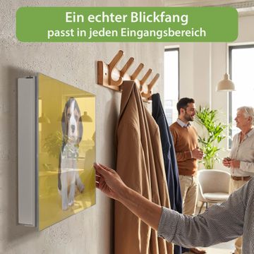Bringe Ordnung und Eleganz in deinen Eingangsbereich mit dem banjado Schlüsselkasten Motiv Motiv Beagle. Die moderne Schlüsselbox kombiniert funktionales Design mit hochwertiger Verarbeitung und wird so zu einem echten Hingucker in Flur, Büro oder Ferienwohnung. ✅ Stilvolle Schlüsselaufbewahrung mit Glasfront im Motiv Motiv Beagle Der Design-Schlüsselkasten Motiv Motiv Beagle bietet Platz für bis zu 50 Schlüssel, die auf 5 stabilen Reihen mit je 10 Haken übersichtlich verstaut werden. Mit seinen kompakten Maßen von 30 x 30 x 5 cm passt die Schlüsselbox perfekt auch in kleinere Räume. Der weiß lackierte Stahlkorpus mit rechts angeschlagenem Türscharnier harmoniert mit der Glasfront und fügt sich nahtlos in jedes Wohnambiente ein. Ob als Schlüsselorganizer für Zuhause oder als praktische Lösung für Büros, Praxen und Gewerbe, der banjado Schlüsselkasten sorgt für Ordnung und Übersicht. Dank der magnetischen, mit Kreidestiften beschreibbaren Glasfront kannst du Notizen anheften oder Termine direkt auf der Oberfläche festhalten. Die Schlüsselbox Motiv Motiv Beagle zur Wandmontage wird inklusive Befestigungsmaterial geliefert und ist schnell angebracht. So hast du deine Schlüssel jederzeit griffbereit und zugleich stilvoll verstaut. Mit diesem banjado Schlüsselkasten Motiv Motiv Beagle kombinierst du praktische Aufbewahrung mit stilvollem Wohndesign. Ob privat oder geschäftlich, die Schlüsselbox sorgt für mehr Ordnung, Übersicht und ein wohnliches Ambiente.Vorteile im Überblick