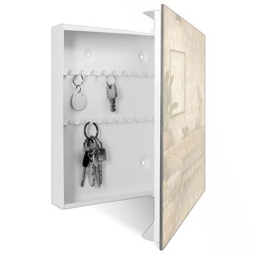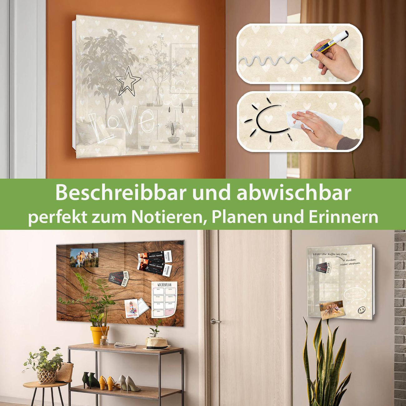 Bringe Ordnung und Eleganz in deinen Eingangsbereich mit dem banjado Schlüsselkasten Motiv Motiv Beige Herzen . Die moderne Schlüsselbox kombiniert funktionales Design mit hochwertiger Verarbeitung und wird so zu einem echten Hingucker in Flur, Büro oder Ferienwohnung. ✅ Stilvolle Schlüsselaufbewahrung mit Glasfront im Motiv Motiv Beige Herzen Der Design-Schlüsselkasten Motiv Motiv Beige Herzen bietet Platz für bis zu 50 Schlüssel, die auf 5 stabilen Reihen mit je 10 Haken übersichtlich verstaut werden. Mit seinen kompakten Maßen von 30 x 30 x 5 cm passt die Schlüsselbox perfekt auch in kleinere Räume. Der weiß lackierte Stahlkorpus mit rechts angeschlagenem Türscharnier harmoniert mit der Glasfront und fügt sich nahtlos in jedes Wohnambiente ein. Ob als Schlüsselorganizer für Zuhause oder als praktische Lösung für Büros, Praxen und Gewerbe, der banjado Schlüsselkasten sorgt für Ordnung und Übersicht. Dank der magnetischen, mit Kreidestiften beschreibbaren Glasfront kannst du Notizen anheften oder Termine direkt auf der Oberfläche festhalten. Die Schlüsselbox Motiv Motiv Beige Herzen zur Wandmontage wird inklusive Befestigungsmaterial geliefert und ist schnell angebracht. So hast du deine Schlüssel jederzeit griffbereit und zugleich stilvoll verstaut. Mit diesem banjado Schlüsselkasten Motiv Motiv Beige Herzen kombinierst du praktische Aufbewahrung mit stilvollem Wohndesign. Ob privat oder geschäftlich, die Schlüsselbox sorgt für mehr Ordnung, Übersicht und ein wohnliches Ambiente.Vorteile im Überblick