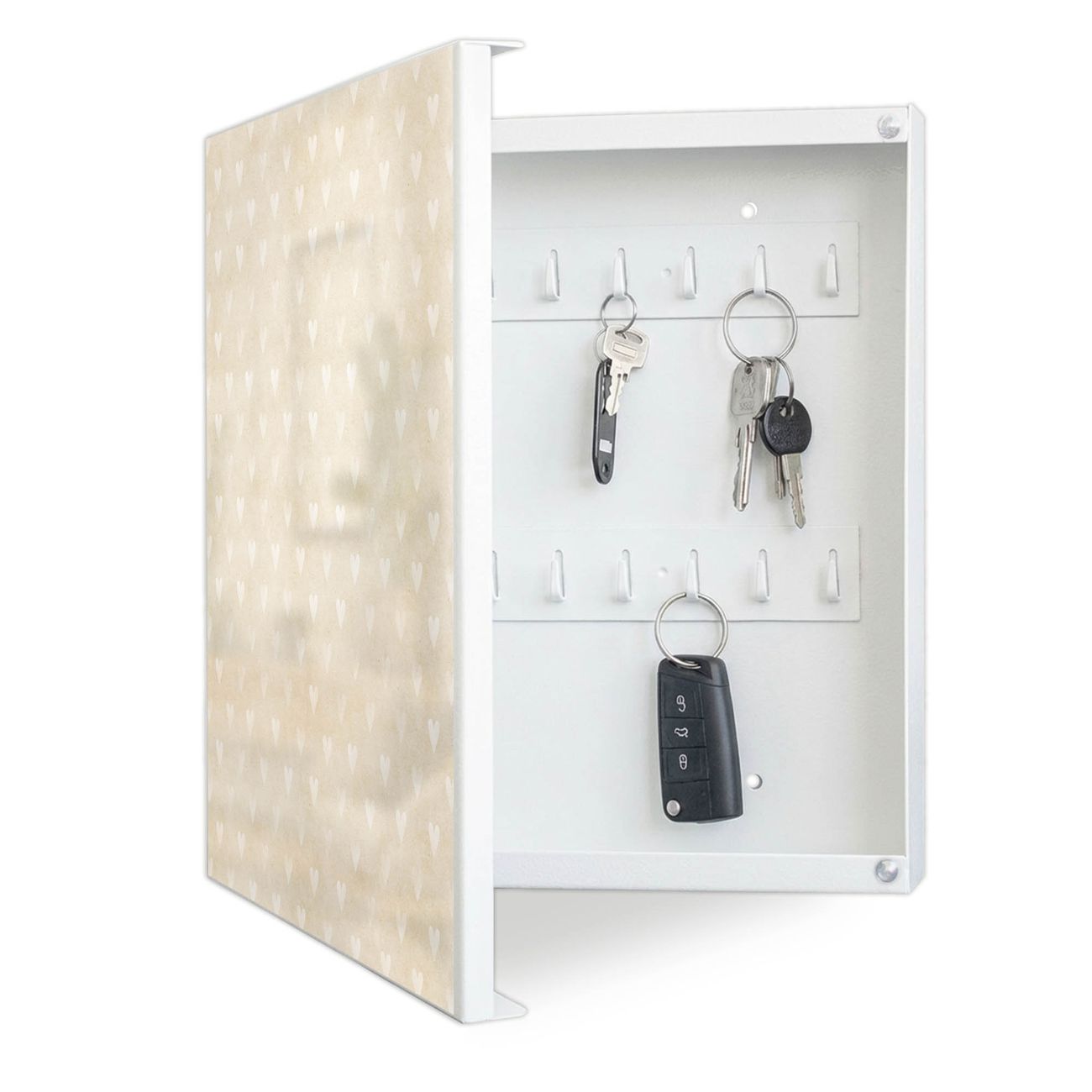 Bringe Ordnung und Eleganz in deinen Eingangsbereich mit dem banjado Schlüsselkasten Motiv Motiv Beige Herzen . Die moderne Schlüsselbox kombiniert funktionales Design mit hochwertiger Verarbeitung und wird so zu einem echten Hingucker in Flur, Büro oder Ferienwohnung. ✅ Stilvolle Schlüsselaufbewahrung mit Motiv Motiv Beige Herzen Der Design-Schlüsselkasten Motiv Motiv Beige Herzen bietet Platz für bis zu 32 Schlüssel, die auf 4 stabilen Reihen mit je 8 Haken übersichtlich verstaut werden. Mit seinen kompakten Maßen von 30 x 30 x 5 cm passt die Schlüsselbox perfekt auch in kleinere Räume. Der weiß lackierte Stahlkorpus mit links angeschlagenem Türscharnier harmoniert mit gedruckten Folie auf der Front und fügt sich nahtlos in jedes Wohnambiente ein. Ob als Schlüsselorganizer für Zuhause oder als praktische Lösung für Büros, Praxen und Gewerbe, der banjado Schlüsselkasten sorgt für Ordnung und Übersicht. Dank der magnetischen, mit Kreidestiften beschreibbaren Folie auf der Front kannst du Notizen anheften oder Termine direkt auf der Oberfläche festhalten. Die Schlüsselbox Motiv Motiv Beige Herzen zur Wandmontage wird inklusive Befestigungsmaterial geliefert und ist schnell angebracht. So hast du deine Schlüssel jederzeit griffbereit und zugleich stilvoll verstaut. Mit diesem banjado Schlüsselkasten Motiv Motiv Beige Herzen kombinierst du praktische Aufbewahrung mit stilvollem Wohndesign. Ob privat oder geschäftlich, die Schlüsselbox sorgt für mehr Ordnung, Übersicht und ein wohnliches Ambiente.Vorteile im Überblick