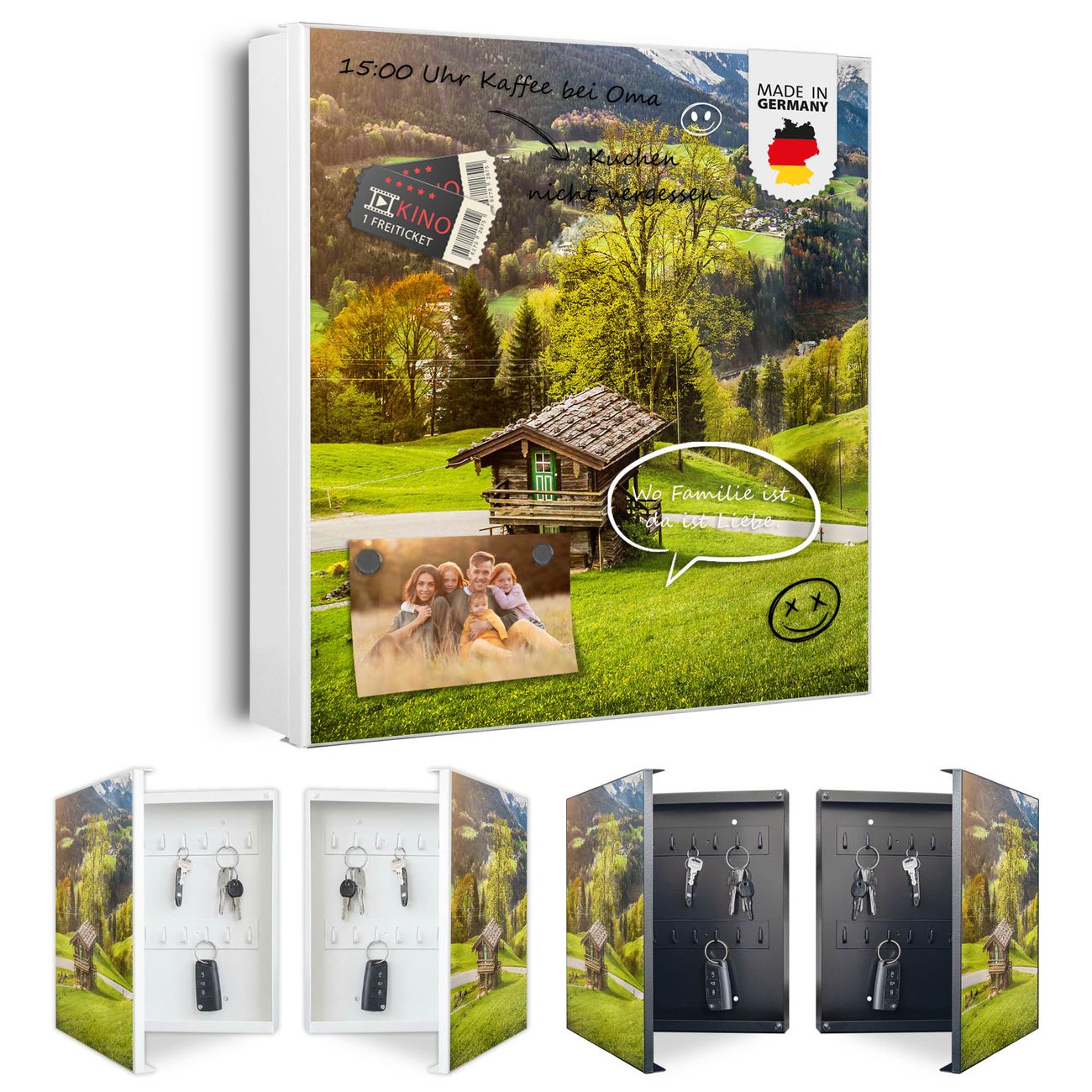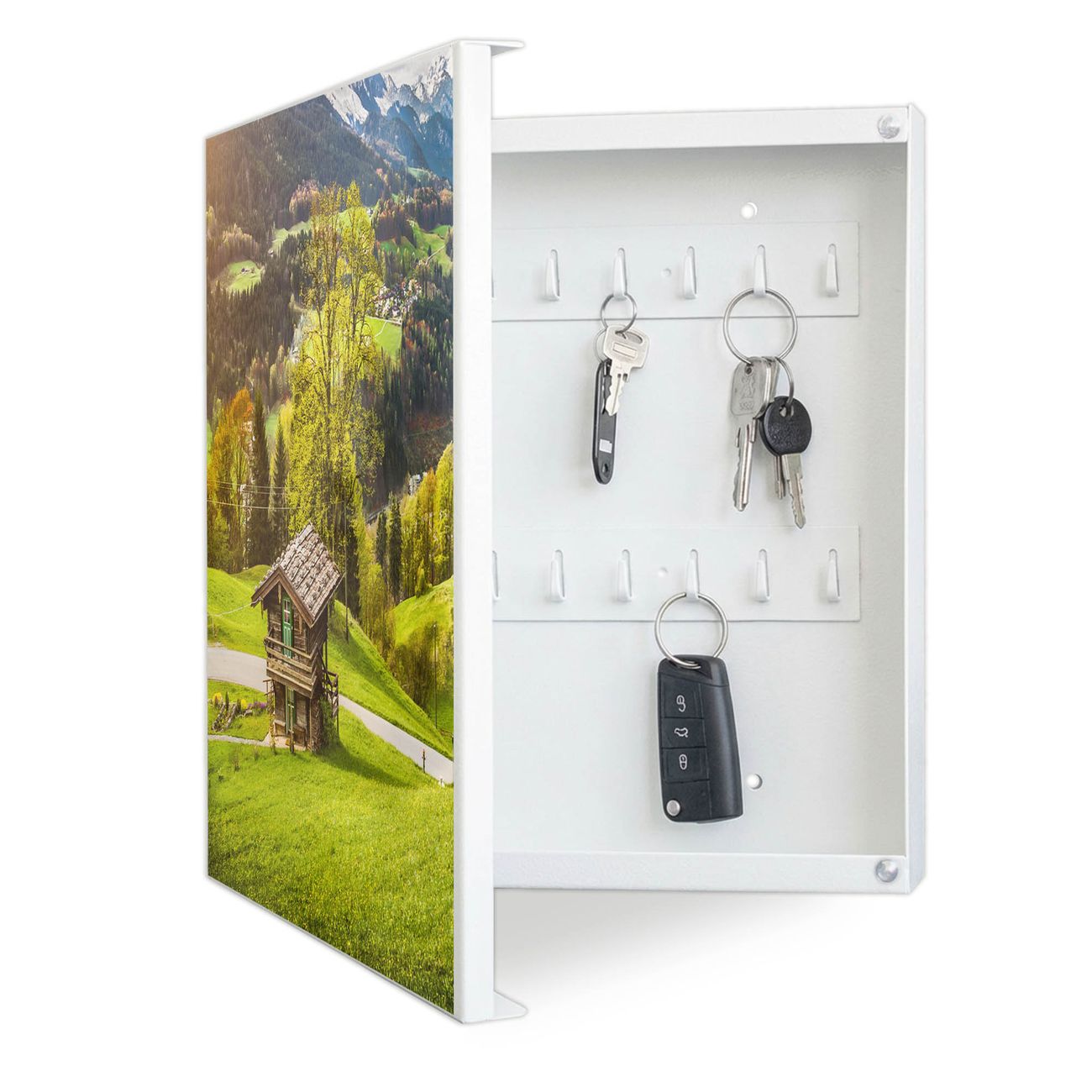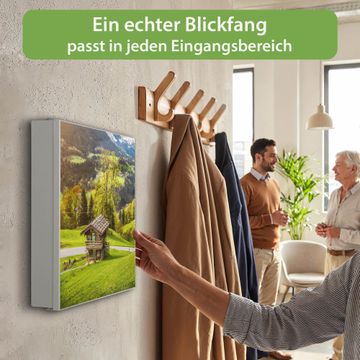 Bringe Ordnung und Eleganz in deinen Eingangsbereich mit dem banjado Schlüsselkasten Motiv Motiv Berchtesgadener Land. Die moderne Schlüsselbox kombiniert funktionales Design mit hochwertiger Verarbeitung und wird so zu einem echten Hingucker in Flur, Büro oder Ferienwohnung. ✅ Stilvolle Schlüsselaufbewahrung mit Motiv Motiv Berchtesgadener Land Der Design-Schlüsselkasten Motiv Motiv Berchtesgadener Land bietet Platz für bis zu 32 Schlüssel, die auf 4 stabilen Reihen mit je 8 Haken übersichtlich verstaut werden. Mit seinen kompakten Maßen von 30 x 30 x 5 cm passt die Schlüsselbox perfekt auch in kleinere Räume. Der weiß lackierte Stahlkorpus mit links angeschlagenem Türscharnier harmoniert mit gedruckten Folie auf der Front und fügt sich nahtlos in jedes Wohnambiente ein. Ob als Schlüsselorganizer für Zuhause oder als praktische Lösung für Büros, Praxen und Gewerbe, der banjado Schlüsselkasten sorgt für Ordnung und Übersicht. Dank der magnetischen, mit Kreidestiften beschreibbaren Folie auf der Front kannst du Notizen anheften oder Termine direkt auf der Oberfläche festhalten. Die Schlüsselbox Motiv Motiv Berchtesgadener Land zur Wandmontage wird inklusive Befestigungsmaterial geliefert und ist schnell angebracht. So hast du deine Schlüssel jederzeit griffbereit und zugleich stilvoll verstaut. Mit diesem banjado Schlüsselkasten Motiv Motiv Berchtesgadener Land kombinierst du praktische Aufbewahrung mit stilvollem Wohndesign. Ob privat oder geschäftlich, die Schlüsselbox sorgt für mehr Ordnung, Übersicht und ein wohnliches Ambiente.Vorteile im Überblick
