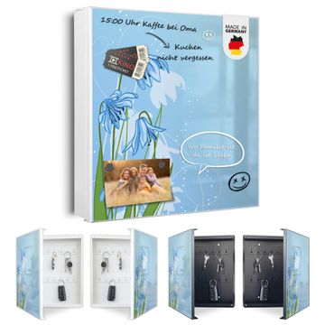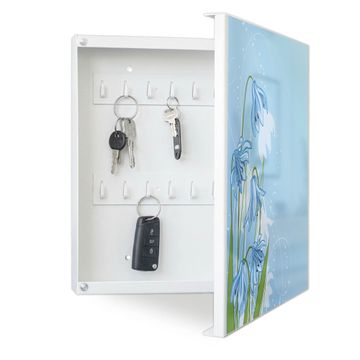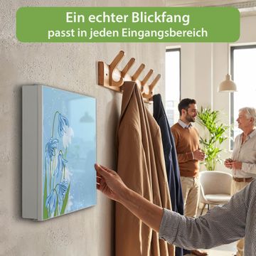 Bringe Ordnung und Eleganz in deinen Eingangsbereich mit dem banjado Schlüsselkasten Motiv Motiv Bergblaulilie. Die moderne Schlüsselbox kombiniert funktionales Design mit hochwertiger Verarbeitung und wird so zu einem echten Hingucker in Flur, Büro oder Ferienwohnung. ✅ Stilvolle Schlüsselaufbewahrung mit Motiv Motiv Bergblaulilie Der Design-Schlüsselkasten Motiv Motiv Bergblaulilie bietet Platz für bis zu 32 Schlüssel, die auf 4 stabilen Reihen mit je 8 Haken übersichtlich verstaut werden. Mit seinen kompakten Maßen von 30 x 30 x 5 cm passt die Schlüsselbox perfekt auch in kleinere Räume. Der weiß lackierte Stahlkorpus mit rechts angeschlagenem Türscharnier harmoniert mit gedruckten Folie auf der Front und fügt sich nahtlos in jedes Wohnambiente ein. Ob als Schlüsselorganizer für Zuhause oder als praktische Lösung für Büros, Praxen und Gewerbe, der banjado Schlüsselkasten sorgt für Ordnung und Übersicht. Dank der magnetischen, mit Kreidestiften beschreibbaren Folie auf der Front kannst du Notizen anheften oder Termine direkt auf der Oberfläche festhalten. Die Schlüsselbox Motiv Motiv Bergblaulilie zur Wandmontage wird inklusive Befestigungsmaterial geliefert und ist schnell angebracht. So hast du deine Schlüssel jederzeit griffbereit und zugleich stilvoll verstaut. Mit diesem banjado Schlüsselkasten Motiv Motiv Bergblaulilie kombinierst du praktische Aufbewahrung mit stilvollem Wohndesign. Ob privat oder geschäftlich, die Schlüsselbox sorgt für mehr Ordnung, Übersicht und ein wohnliches Ambiente.Vorteile im Überblick