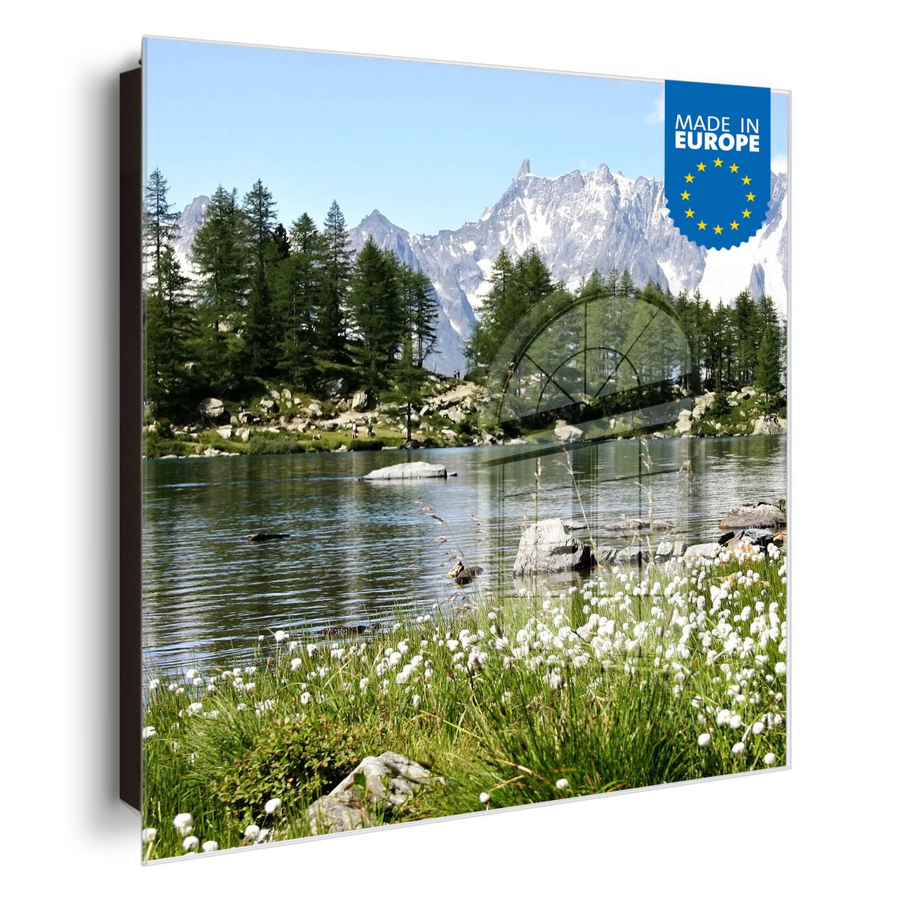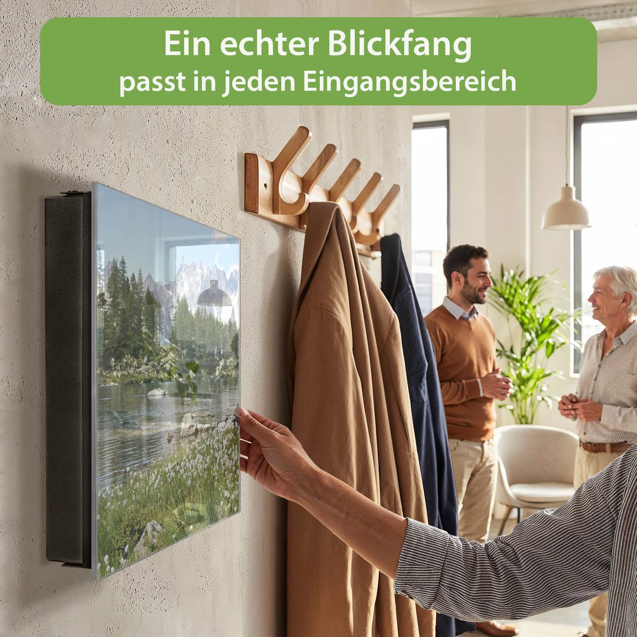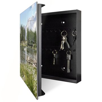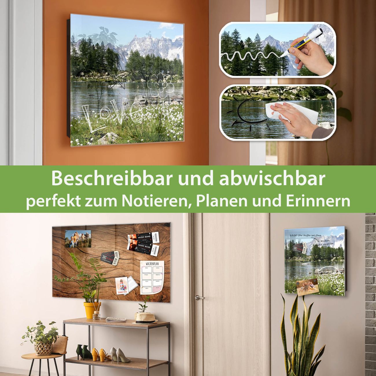 Bringe Ordnung und Eleganz in deinen Eingangsbereich mit dem banjado Schlüsselkasten Motiv Motiv Bergidylle. Die moderne Schlüsselbox kombiniert funktionales Design mit hochwertiger Verarbeitung und wird so zu einem echten Hingucker in Flur, Büro oder Ferienwohnung. ✅ Stilvolle Schlüsselaufbewahrung mit Glasfront im Motiv Motiv Bergidylle Der Design-Schlüsselkasten Motiv Motiv Bergidylle bietet Platz für bis zu 50 Schlüssel, die auf 5 stabilen Reihen mit je 10 Haken übersichtlich verstaut werden. Mit seinen kompakten Maßen von 30 x 30 x 5 cm passt die Schlüsselbox perfekt auch in kleinere Räume. Der schwarz lackierte Stahlkorpus mit rechts angeschlagenem Türscharnier harmoniert mit der Glasfront und fügt sich nahtlos in jedes Wohnambiente ein. Ob als Schlüsselorganizer für Zuhause oder als praktische Lösung für Büros, Praxen und Gewerbe, der banjado Schlüsselkasten sorgt für Ordnung und Übersicht. Dank der magnetischen, mit Kreidestiften beschreibbaren Glasfront kannst du Notizen anheften oder Termine direkt auf der Oberfläche festhalten. Die Schlüsselbox Motiv Motiv Bergidylle zur Wandmontage wird inklusive Befestigungsmaterial geliefert und ist schnell angebracht. So hast du deine Schlüssel jederzeit griffbereit und zugleich stilvoll verstaut. Mit diesem banjado Schlüsselkasten Motiv Motiv Bergidylle kombinierst du praktische Aufbewahrung mit stilvollem Wohndesign. Ob privat oder geschäftlich, die Schlüsselbox sorgt für mehr Ordnung, Übersicht und ein wohnliches Ambiente.Vorteile im Überblick