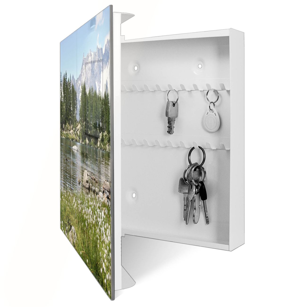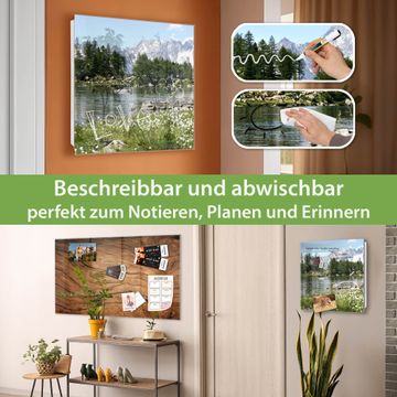 Bringe Ordnung und Eleganz in deinen Eingangsbereich mit dem banjado Schlüsselkasten Motiv Motiv Bergidylle. Die moderne Schlüsselbox kombiniert funktionales Design mit hochwertiger Verarbeitung und wird so zu einem echten Hingucker in Flur, Büro oder Ferienwohnung. ✅ Stilvolle Schlüsselaufbewahrung mit Glasfront im Motiv Motiv Bergidylle Der Design-Schlüsselkasten Motiv Motiv Bergidylle bietet Platz für bis zu 50 Schlüssel, die auf 5 stabilen Reihen mit je 10 Haken übersichtlich verstaut werden. Mit seinen kompakten Maßen von 30 x 30 x 5 cm passt die Schlüsselbox perfekt auch in kleinere Räume. Der weiß lackierte Stahlkorpus mit rechts angeschlagenem Türscharnier harmoniert mit der Glasfront und fügt sich nahtlos in jedes Wohnambiente ein. Ob als Schlüsselorganizer für Zuhause oder als praktische Lösung für Büros, Praxen und Gewerbe, der banjado Schlüsselkasten sorgt für Ordnung und Übersicht. Dank der magnetischen, mit Kreidestiften beschreibbaren Glasfront kannst du Notizen anheften oder Termine direkt auf der Oberfläche festhalten. Die Schlüsselbox Motiv Motiv Bergidylle zur Wandmontage wird inklusive Befestigungsmaterial geliefert und ist schnell angebracht. So hast du deine Schlüssel jederzeit griffbereit und zugleich stilvoll verstaut. Mit diesem banjado Schlüsselkasten Motiv Motiv Bergidylle kombinierst du praktische Aufbewahrung mit stilvollem Wohndesign. Ob privat oder geschäftlich, die Schlüsselbox sorgt für mehr Ordnung, Übersicht und ein wohnliches Ambiente.Vorteile im Überblick