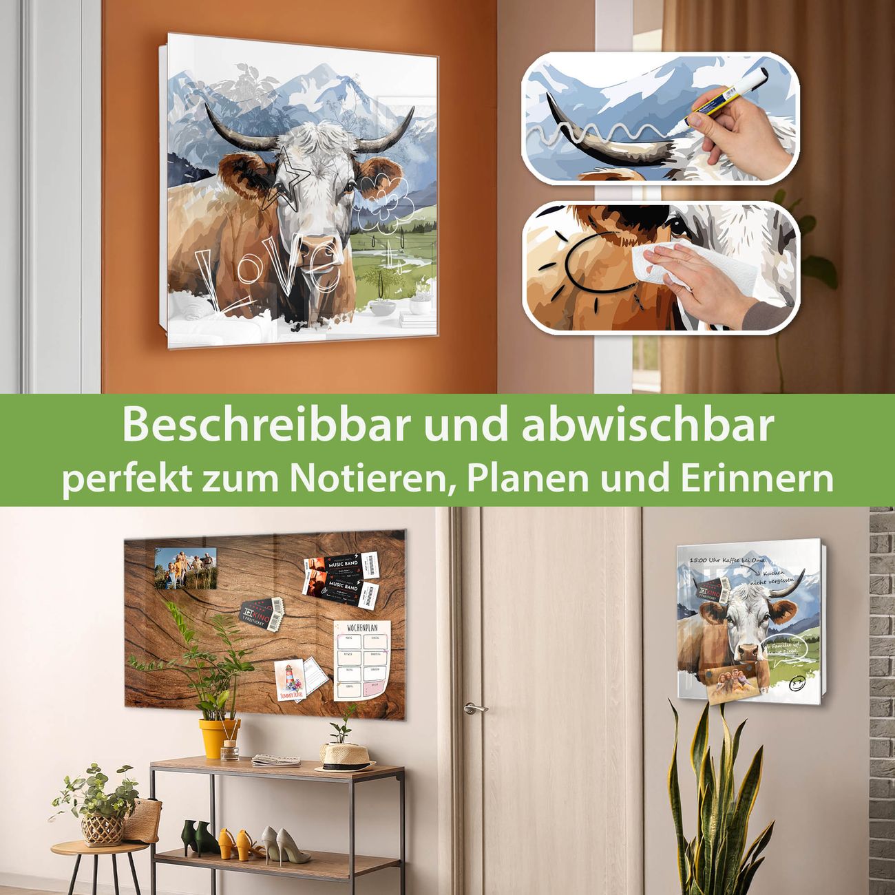 Bringe Ordnung und Eleganz in deinen Eingangsbereich mit dem banjado Schlüsselkasten Motiv Motiv Bergkuh in der Landschaft. Die moderne Schlüsselbox kombiniert funktionales Design mit hochwertiger Verarbeitung und wird so zu einem echten Hingucker in Flur, Büro oder Ferienwohnung. ✅ Stilvolle Schlüsselaufbewahrung mit Glasfront im Motiv Motiv Bergkuh in der Landschaft Der Design-Schlüsselkasten Motiv Motiv Bergkuh in der Landschaft bietet Platz für bis zu 50 Schlüssel, die auf 5 stabilen Reihen mit je 10 Haken übersichtlich verstaut werden. Mit seinen kompakten Maßen von 30 x 30 x 5 cm passt die Schlüsselbox perfekt auch in kleinere Räume. Der weiß lackierte Stahlkorpus mit rechts angeschlagenem Türscharnier harmoniert mit der Glasfront und fügt sich nahtlos in jedes Wohnambiente ein. Ob als Schlüsselorganizer für Zuhause oder als praktische Lösung für Büros, Praxen und Gewerbe, der banjado Schlüsselkasten sorgt für Ordnung und Übersicht. Dank der magnetischen, mit Kreidestiften beschreibbaren Glasfront kannst du Notizen anheften oder Termine direkt auf der Oberfläche festhalten. Die Schlüsselbox Motiv Motiv Bergkuh in der Landschaft zur Wandmontage wird inklusive Befestigungsmaterial geliefert und ist schnell angebracht. So hast du deine Schlüssel jederzeit griffbereit und zugleich stilvoll verstaut. Mit diesem banjado Schlüsselkasten Motiv Motiv Bergkuh in der Landschaft kombinierst du praktische Aufbewahrung mit stilvollem Wohndesign. Ob privat oder geschäftlich, die Schlüsselbox sorgt für mehr Ordnung, Übersicht und ein wohnliches Ambiente.Vorteile im Überblick