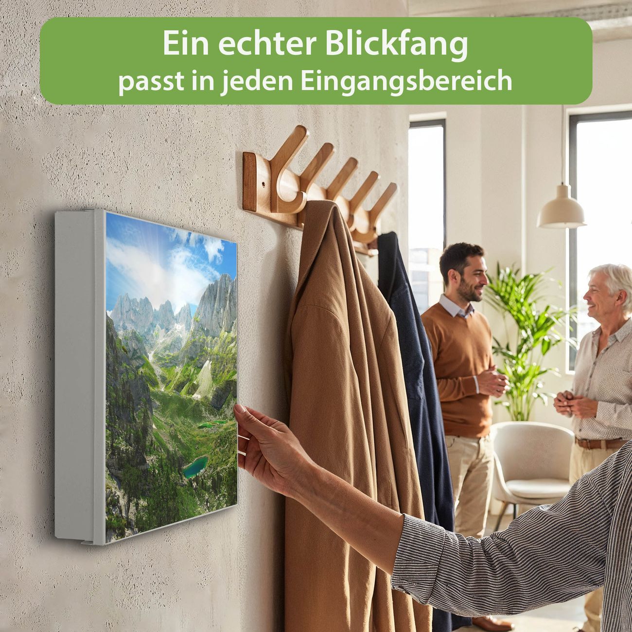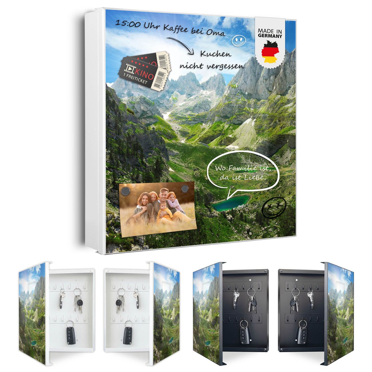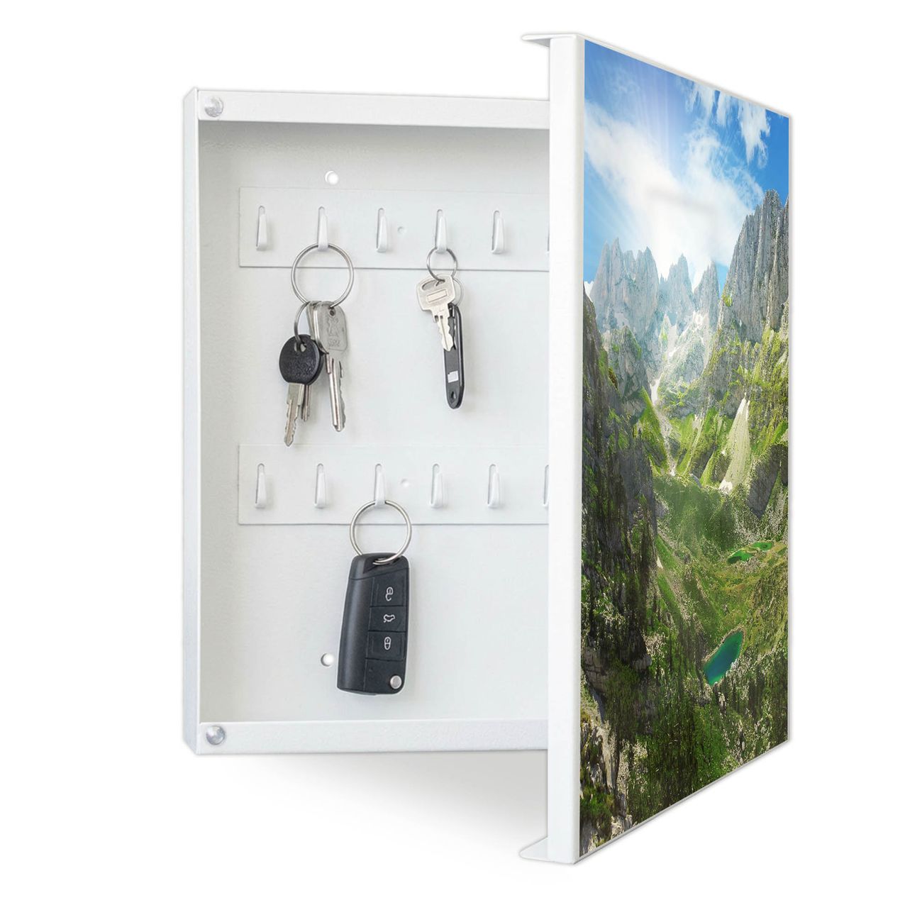 Bringe Ordnung und Eleganz in deinen Eingangsbereich mit dem banjado Schlüsselkasten Motiv Motiv Bergsee Alpen. Die moderne Schlüsselbox kombiniert funktionales Design mit hochwertiger Verarbeitung und wird so zu einem echten Hingucker in Flur, Büro oder Ferienwohnung. ✅ Stilvolle Schlüsselaufbewahrung mit Motiv Motiv Bergsee Alpen Der Design-Schlüsselkasten Motiv Motiv Bergsee Alpen bietet Platz für bis zu 32 Schlüssel, die auf 4 stabilen Reihen mit je 8 Haken übersichtlich verstaut werden. Mit seinen kompakten Maßen von 30 x 30 x 5 cm passt die Schlüsselbox perfekt auch in kleinere Räume. Der weiß lackierte Stahlkorpus mit rechts angeschlagenem Türscharnier harmoniert mit gedruckten Folie auf der Front und fügt sich nahtlos in jedes Wohnambiente ein. Ob als Schlüsselorganizer für Zuhause oder als praktische Lösung für Büros, Praxen und Gewerbe, der banjado Schlüsselkasten sorgt für Ordnung und Übersicht. Dank der magnetischen, mit Kreidestiften beschreibbaren Folie auf der Front kannst du Notizen anheften oder Termine direkt auf der Oberfläche festhalten. Die Schlüsselbox Motiv Motiv Bergsee Alpen zur Wandmontage wird inklusive Befestigungsmaterial geliefert und ist schnell angebracht. So hast du deine Schlüssel jederzeit griffbereit und zugleich stilvoll verstaut. Mit diesem banjado Schlüsselkasten Motiv Motiv Bergsee Alpen kombinierst du praktische Aufbewahrung mit stilvollem Wohndesign. Ob privat oder geschäftlich, die Schlüsselbox sorgt für mehr Ordnung, Übersicht und ein wohnliches Ambiente.Vorteile im Überblick