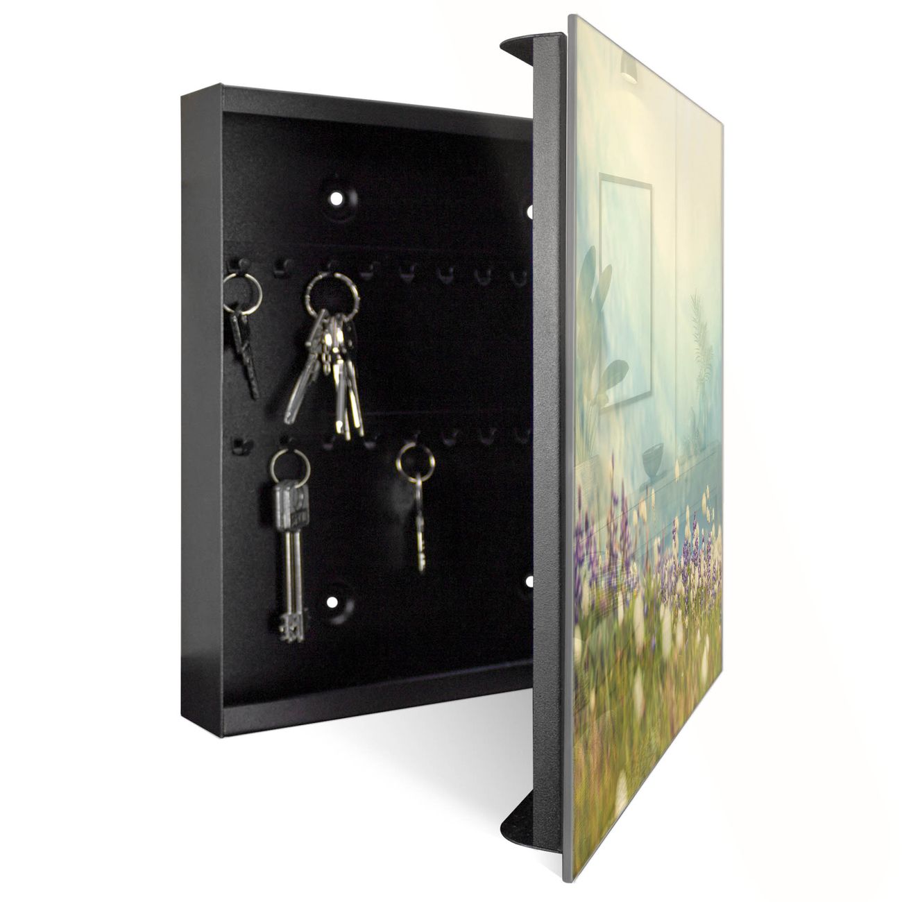Bringe Ordnung und Eleganz in deinen Eingangsbereich mit dem banjado Schlüsselkasten Motiv Motiv Bergwiese. Die moderne Schlüsselbox kombiniert funktionales Design mit hochwertiger Verarbeitung und wird so zu einem echten Hingucker in Flur, Büro oder Ferienwohnung. ✅ Stilvolle Schlüsselaufbewahrung mit Glasfront im Motiv Motiv Bergwiese Der Design-Schlüsselkasten Motiv Motiv Bergwiese bietet Platz für bis zu 50 Schlüssel, die auf 5 stabilen Reihen mit je 10 Haken übersichtlich verstaut werden. Mit seinen kompakten Maßen von 30 x 30 x 5 cm passt die Schlüsselbox perfekt auch in kleinere Räume. Der schwarz lackierte Stahlkorpus mit rechts angeschlagenem Türscharnier harmoniert mit der Glasfront und fügt sich nahtlos in jedes Wohnambiente ein. Ob als Schlüsselorganizer für Zuhause oder als praktische Lösung für Büros, Praxen und Gewerbe, der banjado Schlüsselkasten sorgt für Ordnung und Übersicht. Dank der magnetischen, mit Kreidestiften beschreibbaren Glasfront kannst du Notizen anheften oder Termine direkt auf der Oberfläche festhalten. Die Schlüsselbox Motiv Motiv Bergwiese zur Wandmontage wird inklusive Befestigungsmaterial geliefert und ist schnell angebracht. So hast du deine Schlüssel jederzeit griffbereit und zugleich stilvoll verstaut. Mit diesem banjado Schlüsselkasten Motiv Motiv Bergwiese kombinierst du praktische Aufbewahrung mit stilvollem Wohndesign. Ob privat oder geschäftlich, die Schlüsselbox sorgt für mehr Ordnung, Übersicht und ein wohnliches Ambiente.Vorteile im Überblick