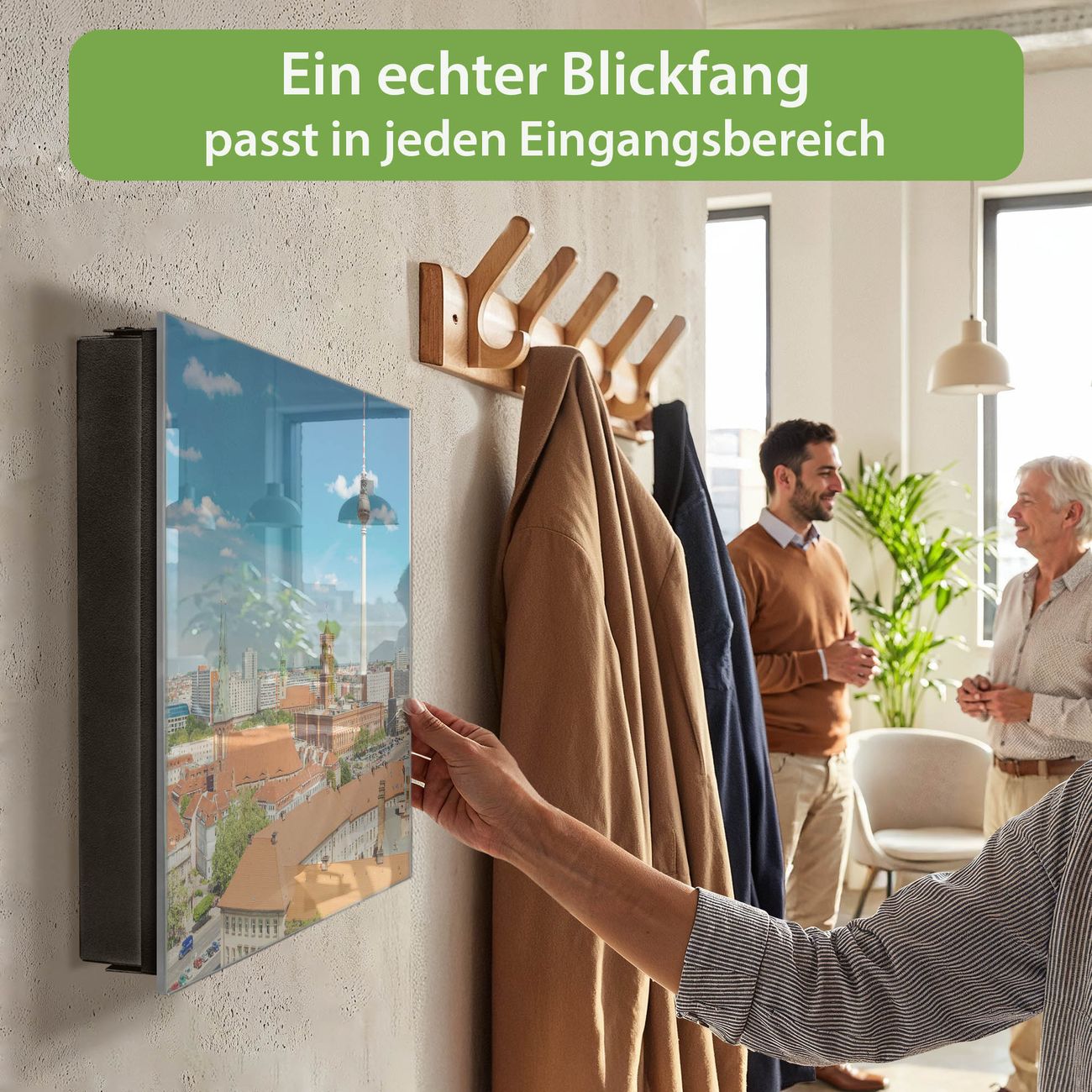 Bringe Ordnung und Eleganz in deinen Eingangsbereich mit dem banjado Schlüsselkasten Motiv Motiv Berlin Mitte. Die moderne Schlüsselbox kombiniert funktionales Design mit hochwertiger Verarbeitung und wird so zu einem echten Hingucker in Flur, Büro oder Ferienwohnung. ✅ Stilvolle Schlüsselaufbewahrung mit Glasfront im Motiv Motiv Berlin Mitte Der Design-Schlüsselkasten Motiv Motiv Berlin Mitte bietet Platz für bis zu 50 Schlüssel, die auf 5 stabilen Reihen mit je 10 Haken übersichtlich verstaut werden. Mit seinen kompakten Maßen von 30 x 30 x 5 cm passt die Schlüsselbox perfekt auch in kleinere Räume. Der schwarz lackierte Stahlkorpus mit rechts angeschlagenem Türscharnier harmoniert mit der Glasfront und fügt sich nahtlos in jedes Wohnambiente ein. Ob als Schlüsselorganizer für Zuhause oder als praktische Lösung für Büros, Praxen und Gewerbe, der banjado Schlüsselkasten sorgt für Ordnung und Übersicht. Dank der magnetischen, mit Kreidestiften beschreibbaren Glasfront kannst du Notizen anheften oder Termine direkt auf der Oberfläche festhalten. Die Schlüsselbox Motiv Motiv Berlin Mitte zur Wandmontage wird inklusive Befestigungsmaterial geliefert und ist schnell angebracht. So hast du deine Schlüssel jederzeit griffbereit und zugleich stilvoll verstaut. Mit diesem banjado Schlüsselkasten Motiv Motiv Berlin Mitte kombinierst du praktische Aufbewahrung mit stilvollem Wohndesign. Ob privat oder geschäftlich, die Schlüsselbox sorgt für mehr Ordnung, Übersicht und ein wohnliches Ambiente.Vorteile im Überblick
