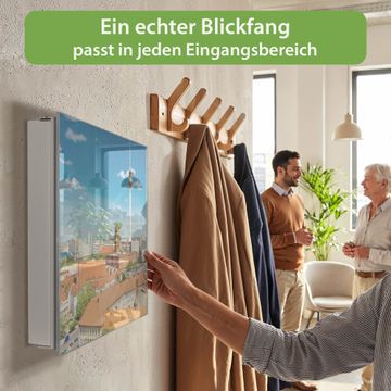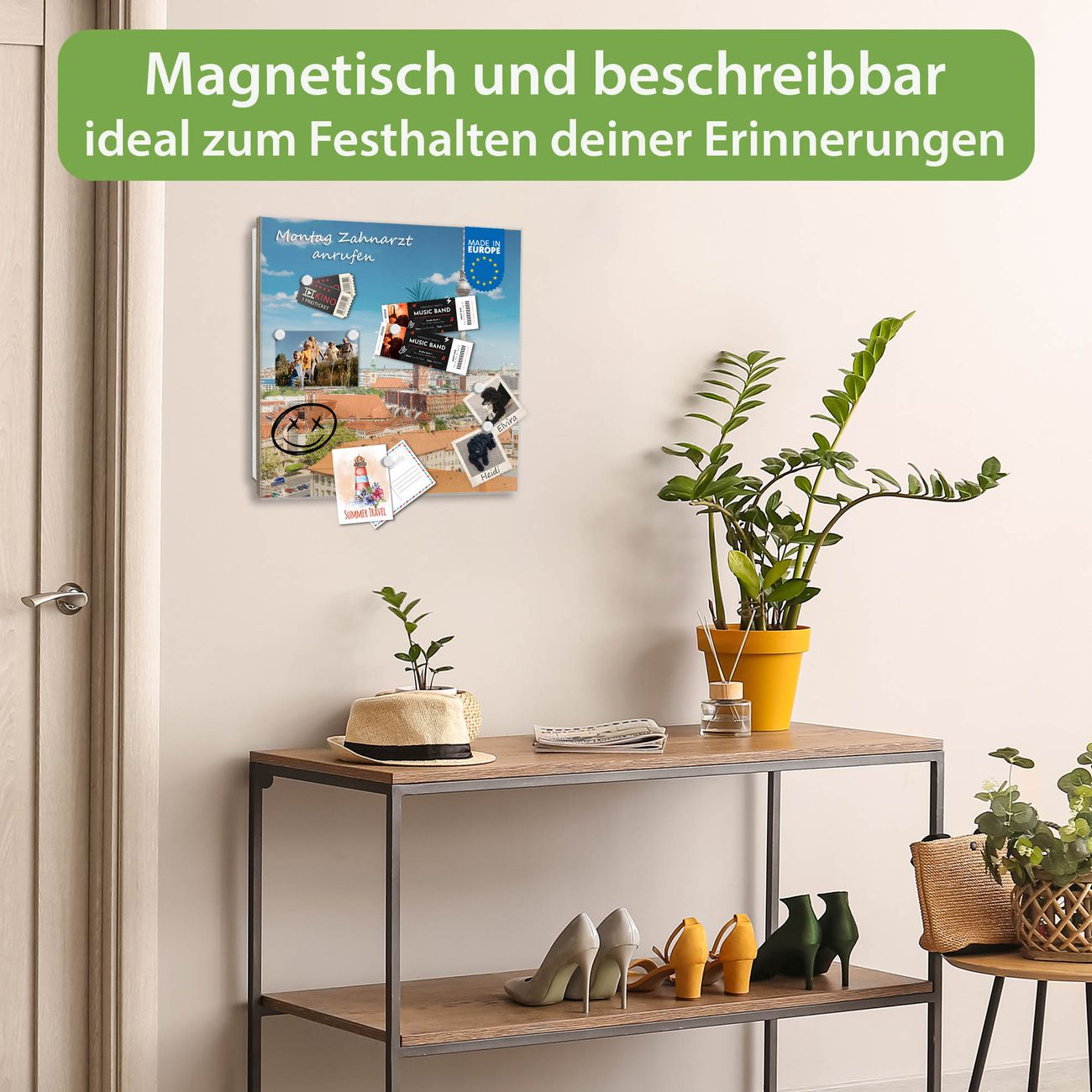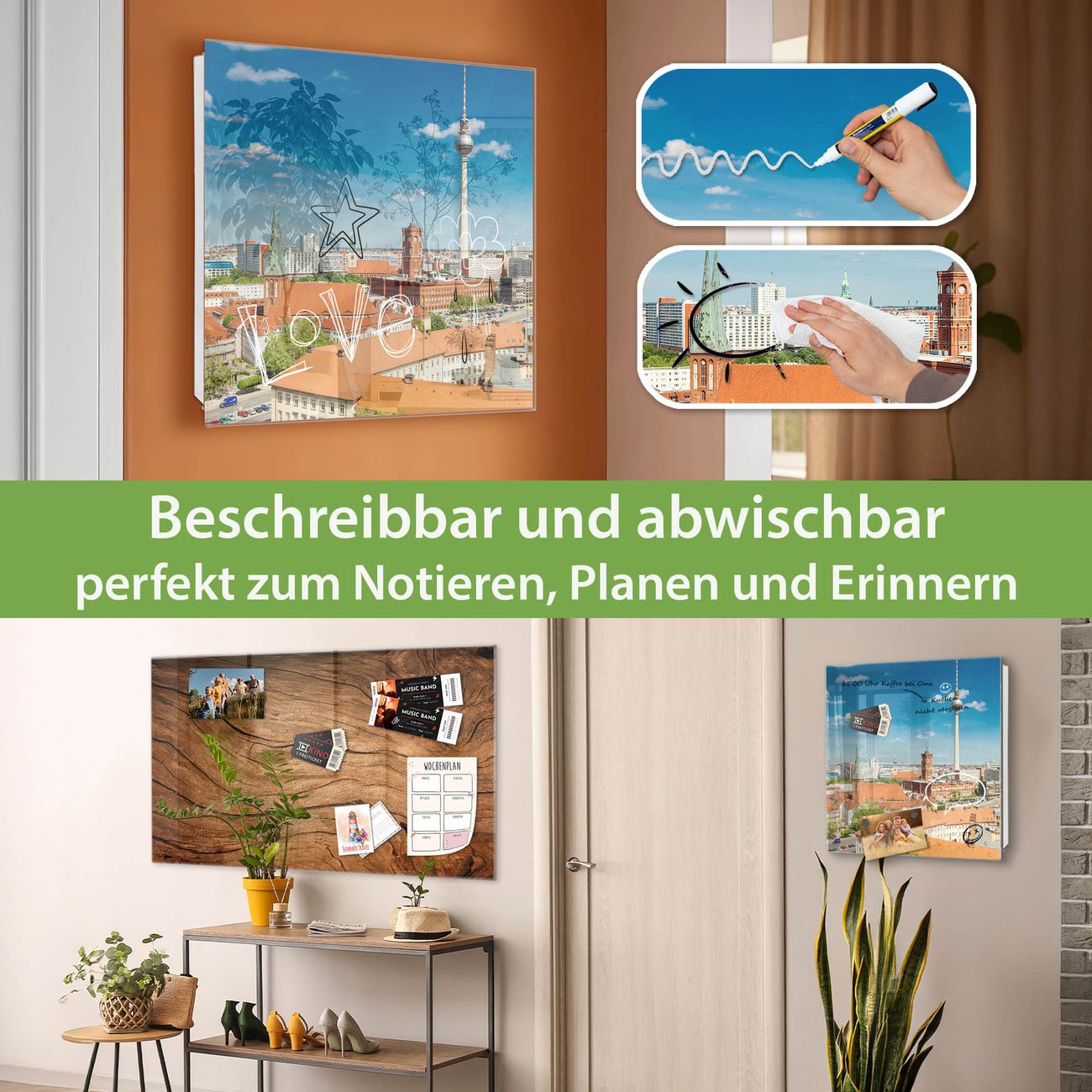Bringe Ordnung und Eleganz in deinen Eingangsbereich mit dem banjado Schlüsselkasten Motiv Motiv Berlin Mitte. Die moderne Schlüsselbox kombiniert funktionales Design mit hochwertiger Verarbeitung und wird so zu einem echten Hingucker in Flur, Büro oder Ferienwohnung. ✅ Stilvolle Schlüsselaufbewahrung mit Glasfront im Motiv Motiv Berlin Mitte Der Design-Schlüsselkasten Motiv Motiv Berlin Mitte bietet Platz für bis zu 50 Schlüssel, die auf 5 stabilen Reihen mit je 10 Haken übersichtlich verstaut werden. Mit seinen kompakten Maßen von 30 x 30 x 5 cm passt die Schlüsselbox perfekt auch in kleinere Räume. Der weiß lackierte Stahlkorpus mit rechts angeschlagenem Türscharnier harmoniert mit der Glasfront und fügt sich nahtlos in jedes Wohnambiente ein. Ob als Schlüsselorganizer für Zuhause oder als praktische Lösung für Büros, Praxen und Gewerbe, der banjado Schlüsselkasten sorgt für Ordnung und Übersicht. Dank der magnetischen, mit Kreidestiften beschreibbaren Glasfront kannst du Notizen anheften oder Termine direkt auf der Oberfläche festhalten. Die Schlüsselbox Motiv Motiv Berlin Mitte zur Wandmontage wird inklusive Befestigungsmaterial geliefert und ist schnell angebracht. So hast du deine Schlüssel jederzeit griffbereit und zugleich stilvoll verstaut. Mit diesem banjado Schlüsselkasten Motiv Motiv Berlin Mitte kombinierst du praktische Aufbewahrung mit stilvollem Wohndesign. Ob privat oder geschäftlich, die Schlüsselbox sorgt für mehr Ordnung, Übersicht und ein wohnliches Ambiente.Vorteile im Überblick