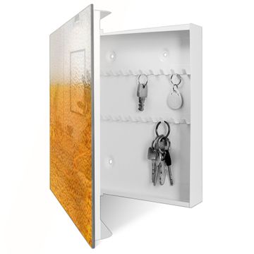 Bringe Ordnung und Eleganz in deinen Eingangsbereich mit dem banjado Schlüsselkasten Motiv Motiv Bier. Die moderne Schlüsselbox kombiniert funktionales Design mit hochwertiger Verarbeitung und wird so zu einem echten Hingucker in Flur, Büro oder Ferienwohnung. ✅ Stilvolle Schlüsselaufbewahrung mit Glasfront im Motiv Motiv Bier Der Design-Schlüsselkasten Motiv Motiv Bier bietet Platz für bis zu 50 Schlüssel, die auf 5 stabilen Reihen mit je 10 Haken übersichtlich verstaut werden. Mit seinen kompakten Maßen von 30 x 30 x 5 cm passt die Schlüsselbox perfekt auch in kleinere Räume. Der weiß lackierte Stahlkorpus mit rechts angeschlagenem Türscharnier harmoniert mit der Glasfront und fügt sich nahtlos in jedes Wohnambiente ein. Ob als Schlüsselorganizer für Zuhause oder als praktische Lösung für Büros, Praxen und Gewerbe, der banjado Schlüsselkasten sorgt für Ordnung und Übersicht. Dank der magnetischen, mit Kreidestiften beschreibbaren Glasfront kannst du Notizen anheften oder Termine direkt auf der Oberfläche festhalten. Die Schlüsselbox Motiv Motiv Bier zur Wandmontage wird inklusive Befestigungsmaterial geliefert und ist schnell angebracht. So hast du deine Schlüssel jederzeit griffbereit und zugleich stilvoll verstaut. Mit diesem banjado Schlüsselkasten Motiv Motiv Bier kombinierst du praktische Aufbewahrung mit stilvollem Wohndesign. Ob privat oder geschäftlich, die Schlüsselbox sorgt für mehr Ordnung, Übersicht und ein wohnliches Ambiente.Vorteile im Überblick
