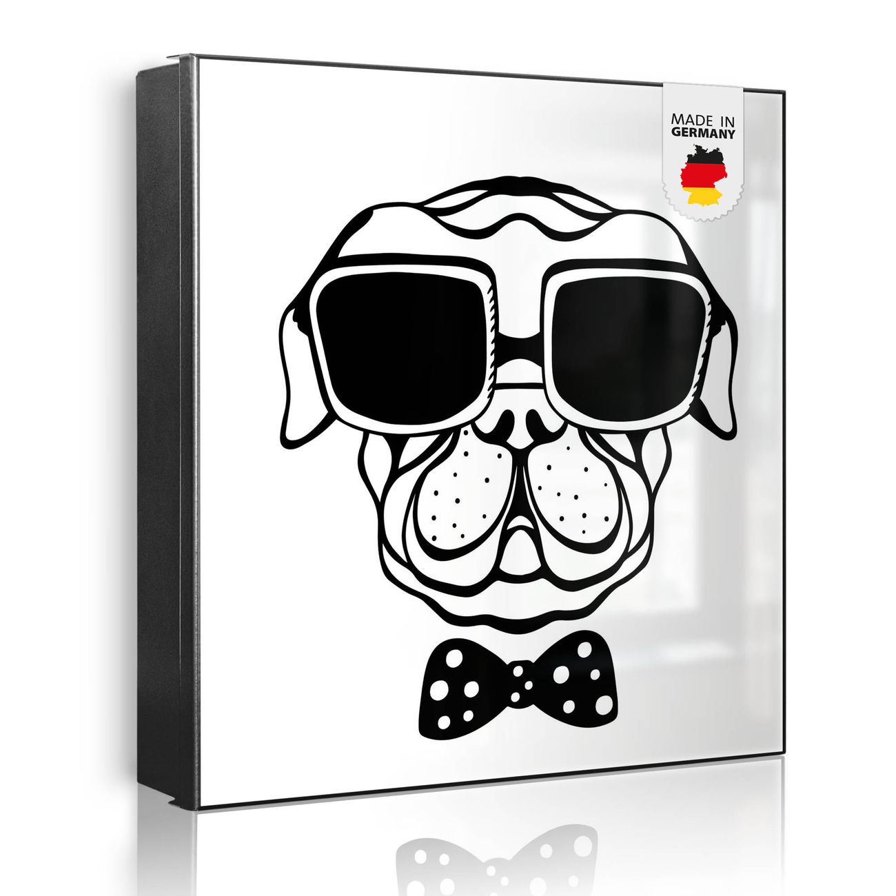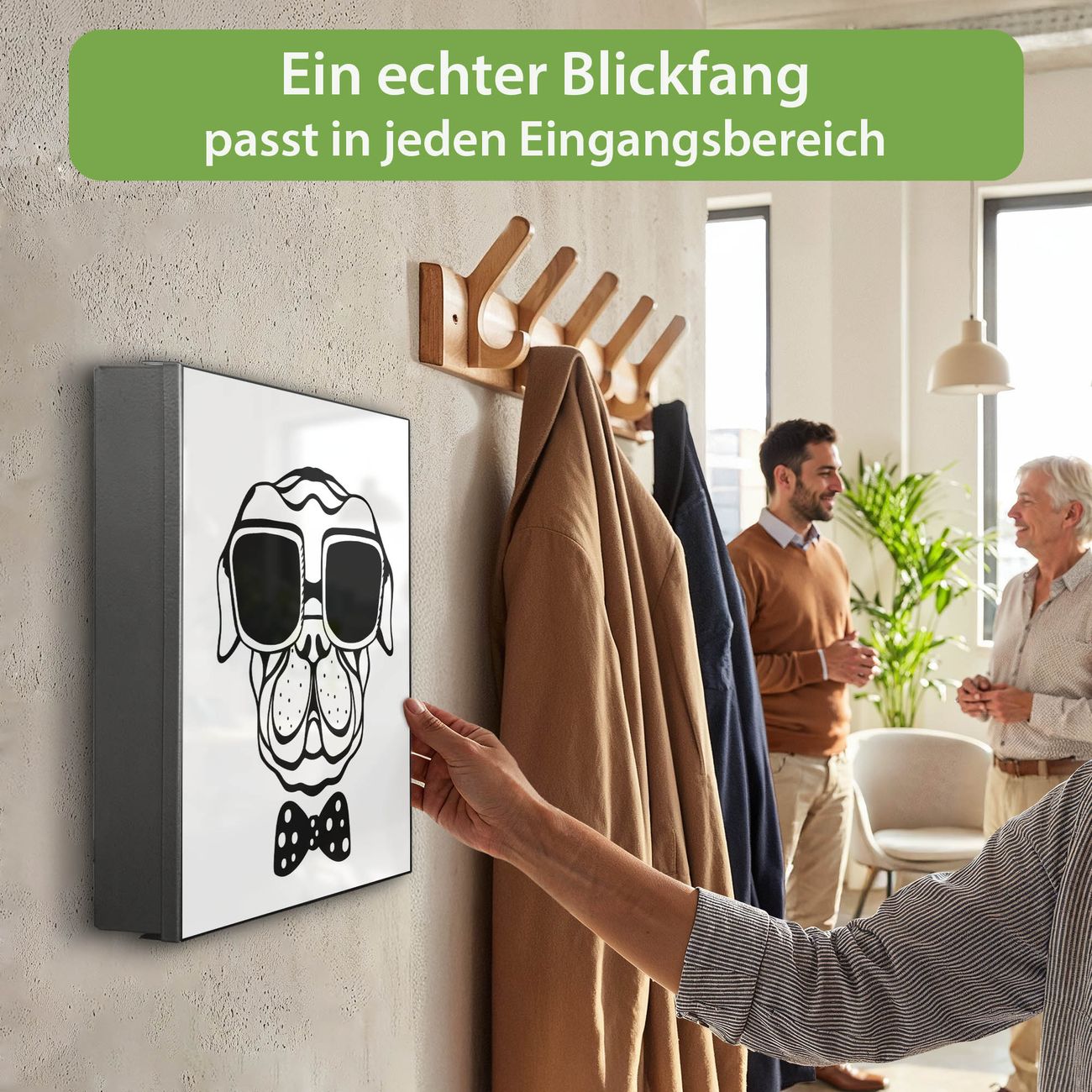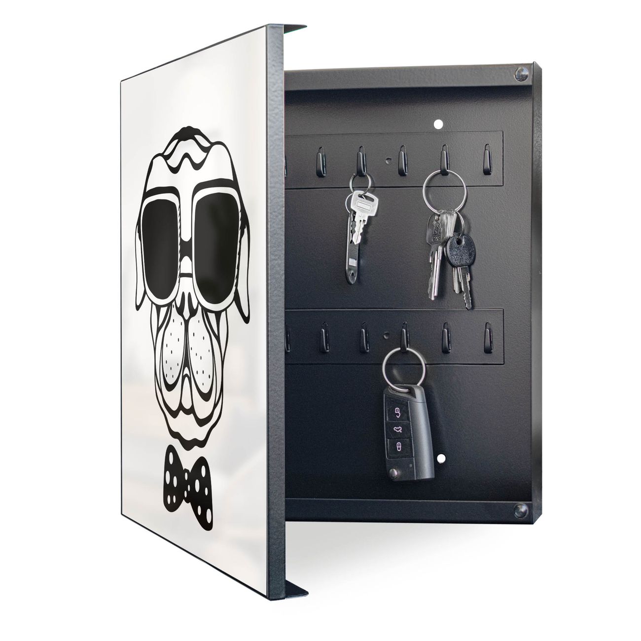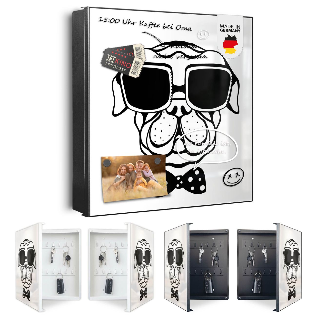 Bringe Ordnung und Eleganz in deinen Eingangsbereich mit dem banjado Schlüsselkasten Motiv Motiv Big Boss. Die moderne Schlüsselbox kombiniert funktionales Design mit hochwertiger Verarbeitung und wird so zu einem echten Hingucker in Flur, Büro oder Ferienwohnung. ✅ Stilvolle Schlüsselaufbewahrung mit Motiv Motiv Big Boss Der Design-Schlüsselkasten Motiv Motiv Big Boss bietet Platz für bis zu 32 Schlüssel, die auf 4 stabilen Reihen mit je 8 Haken übersichtlich verstaut werden. Mit seinen kompakten Maßen von 30 x 30 x 5 cm passt die Schlüsselbox perfekt auch in kleinere Räume. Der schwarz lackierte Stahlkorpus mit links angeschlagenem Türscharnier harmoniert mit gedruckten Folie auf der Front und fügt sich nahtlos in jedes Wohnambiente ein. Ob als Schlüsselorganizer für Zuhause oder als praktische Lösung für Büros, Praxen und Gewerbe, der banjado Schlüsselkasten sorgt für Ordnung und Übersicht. Dank der magnetischen, mit Kreidestiften beschreibbaren Folie auf der Front kannst du Notizen anheften oder Termine direkt auf der Oberfläche festhalten. Die Schlüsselbox Motiv Motiv Big Boss zur Wandmontage wird inklusive Befestigungsmaterial geliefert und ist schnell angebracht. So hast du deine Schlüssel jederzeit griffbereit und zugleich stilvoll verstaut. Mit diesem banjado Schlüsselkasten Motiv Motiv Big Boss kombinierst du praktische Aufbewahrung mit stilvollem Wohndesign. Ob privat oder geschäftlich, die Schlüsselbox sorgt für mehr Ordnung, Übersicht und ein wohnliches Ambiente.Vorteile im Überblick