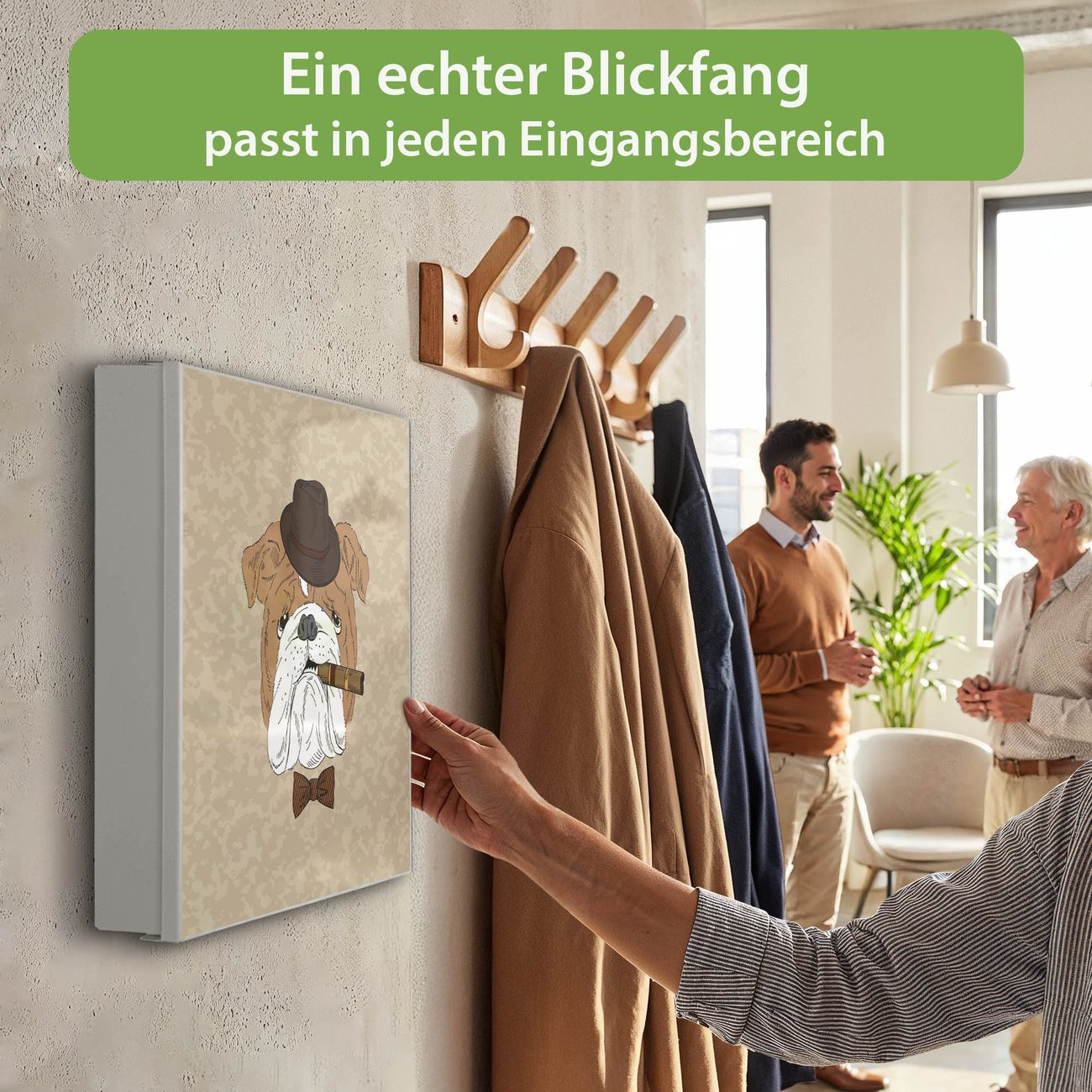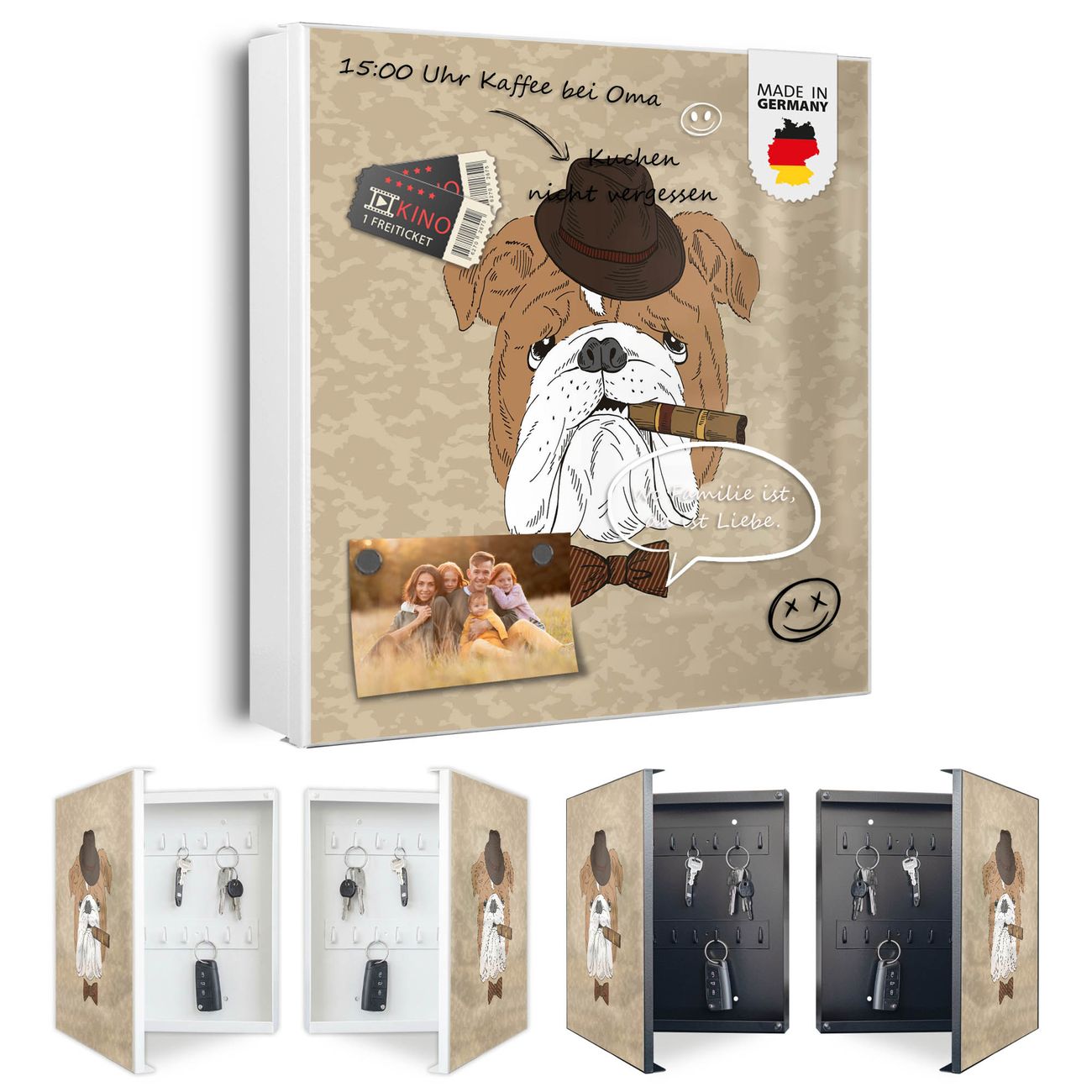 Bringe Ordnung und Eleganz in deinen Eingangsbereich mit dem banjado Schlüsselkasten Motiv Motiv Big Daddy. Die moderne Schlüsselbox kombiniert funktionales Design mit hochwertiger Verarbeitung und wird so zu einem echten Hingucker in Flur, Büro oder Ferienwohnung. ✅ Stilvolle Schlüsselaufbewahrung mit Motiv Motiv Big Daddy Der Design-Schlüsselkasten Motiv Motiv Big Daddy bietet Platz für bis zu 32 Schlüssel, die auf 4 stabilen Reihen mit je 8 Haken übersichtlich verstaut werden. Mit seinen kompakten Maßen von 30 x 30 x 5 cm passt die Schlüsselbox perfekt auch in kleinere Räume. Der weiß lackierte Stahlkorpus mit rechts angeschlagenem Türscharnier harmoniert mit gedruckten Folie auf der Front und fügt sich nahtlos in jedes Wohnambiente ein. Ob als Schlüsselorganizer für Zuhause oder als praktische Lösung für Büros, Praxen und Gewerbe, der banjado Schlüsselkasten sorgt für Ordnung und Übersicht. Dank der magnetischen, mit Kreidestiften beschreibbaren Folie auf der Front kannst du Notizen anheften oder Termine direkt auf der Oberfläche festhalten. Die Schlüsselbox Motiv Motiv Big Daddy zur Wandmontage wird inklusive Befestigungsmaterial geliefert und ist schnell angebracht. So hast du deine Schlüssel jederzeit griffbereit und zugleich stilvoll verstaut. Mit diesem banjado Schlüsselkasten Motiv Motiv Big Daddy kombinierst du praktische Aufbewahrung mit stilvollem Wohndesign. Ob privat oder geschäftlich, die Schlüsselbox sorgt für mehr Ordnung, Übersicht und ein wohnliches Ambiente.Vorteile im Überblick