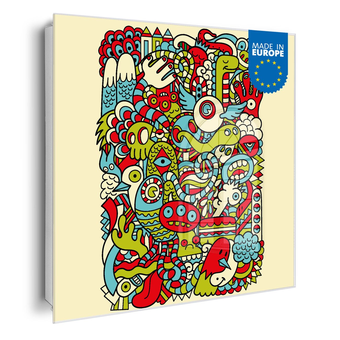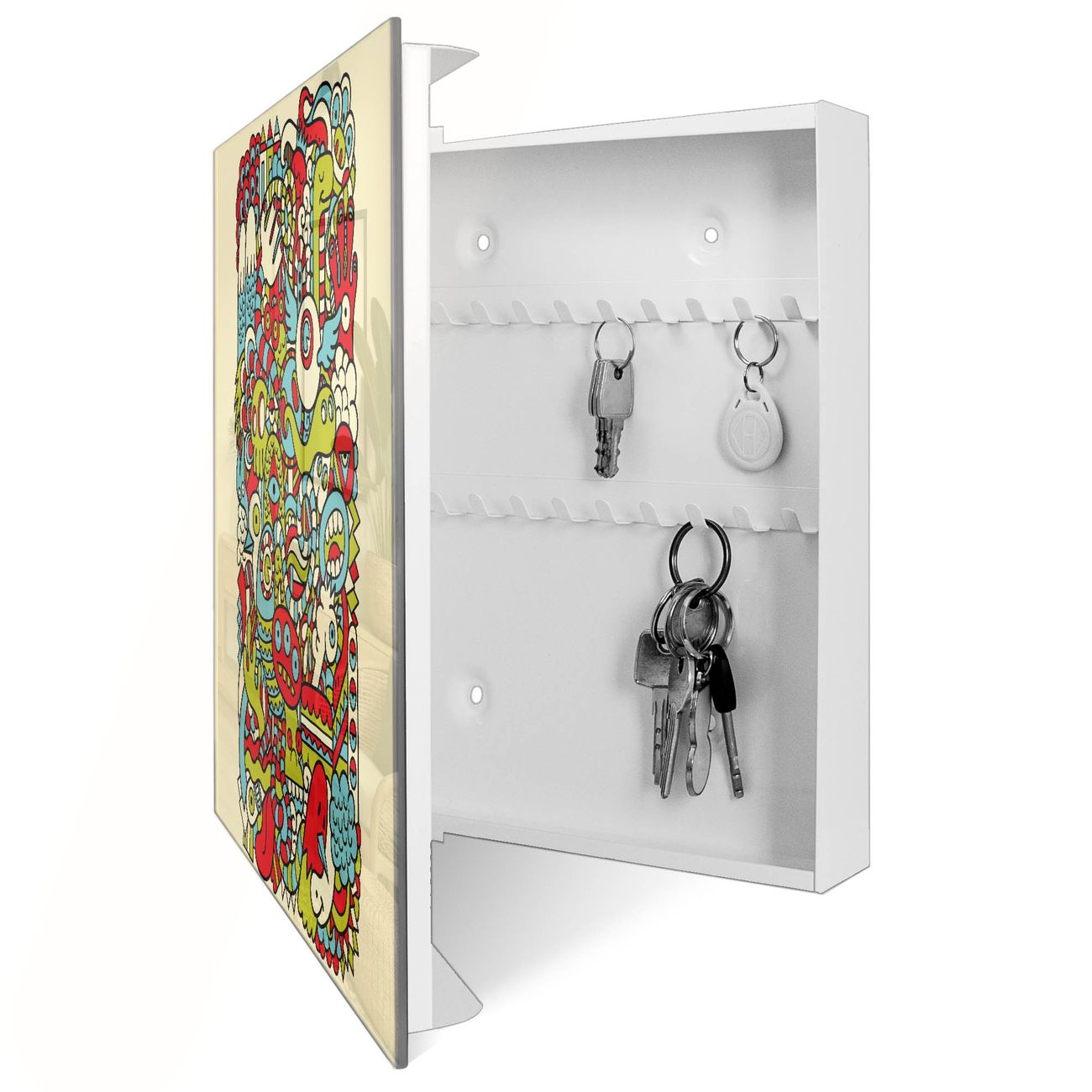 Bringe Ordnung und Eleganz in deinen Eingangsbereich mit dem banjado Schlüsselkasten Motiv Motiv Birds Worms Freaks. Die moderne Schlüsselbox kombiniert funktionales Design mit hochwertiger Verarbeitung und wird so zu einem echten Hingucker in Flur, Büro oder Ferienwohnung. ✅ Stilvolle Schlüsselaufbewahrung mit Glasfront im Motiv Motiv Birds Worms Freaks Der Design-Schlüsselkasten Motiv Motiv Birds Worms Freaks bietet Platz für bis zu 50 Schlüssel, die auf 5 stabilen Reihen mit je 10 Haken übersichtlich verstaut werden. Mit seinen kompakten Maßen von 30 x 30 x 5 cm passt die Schlüsselbox perfekt auch in kleinere Räume. Der weiß lackierte Stahlkorpus mit rechts angeschlagenem Türscharnier harmoniert mit der Glasfront und fügt sich nahtlos in jedes Wohnambiente ein. Ob als Schlüsselorganizer für Zuhause oder als praktische Lösung für Büros, Praxen und Gewerbe, der banjado Schlüsselkasten sorgt für Ordnung und Übersicht. Dank der magnetischen, mit Kreidestiften beschreibbaren Glasfront kannst du Notizen anheften oder Termine direkt auf der Oberfläche festhalten. Die Schlüsselbox Motiv Motiv Birds Worms Freaks zur Wandmontage wird inklusive Befestigungsmaterial geliefert und ist schnell angebracht. So hast du deine Schlüssel jederzeit griffbereit und zugleich stilvoll verstaut. Mit diesem banjado Schlüsselkasten Motiv Motiv Birds Worms Freaks kombinierst du praktische Aufbewahrung mit stilvollem Wohndesign. Ob privat oder geschäftlich, die Schlüsselbox sorgt für mehr Ordnung, Übersicht und ein wohnliches Ambiente.Vorteile im Überblick
