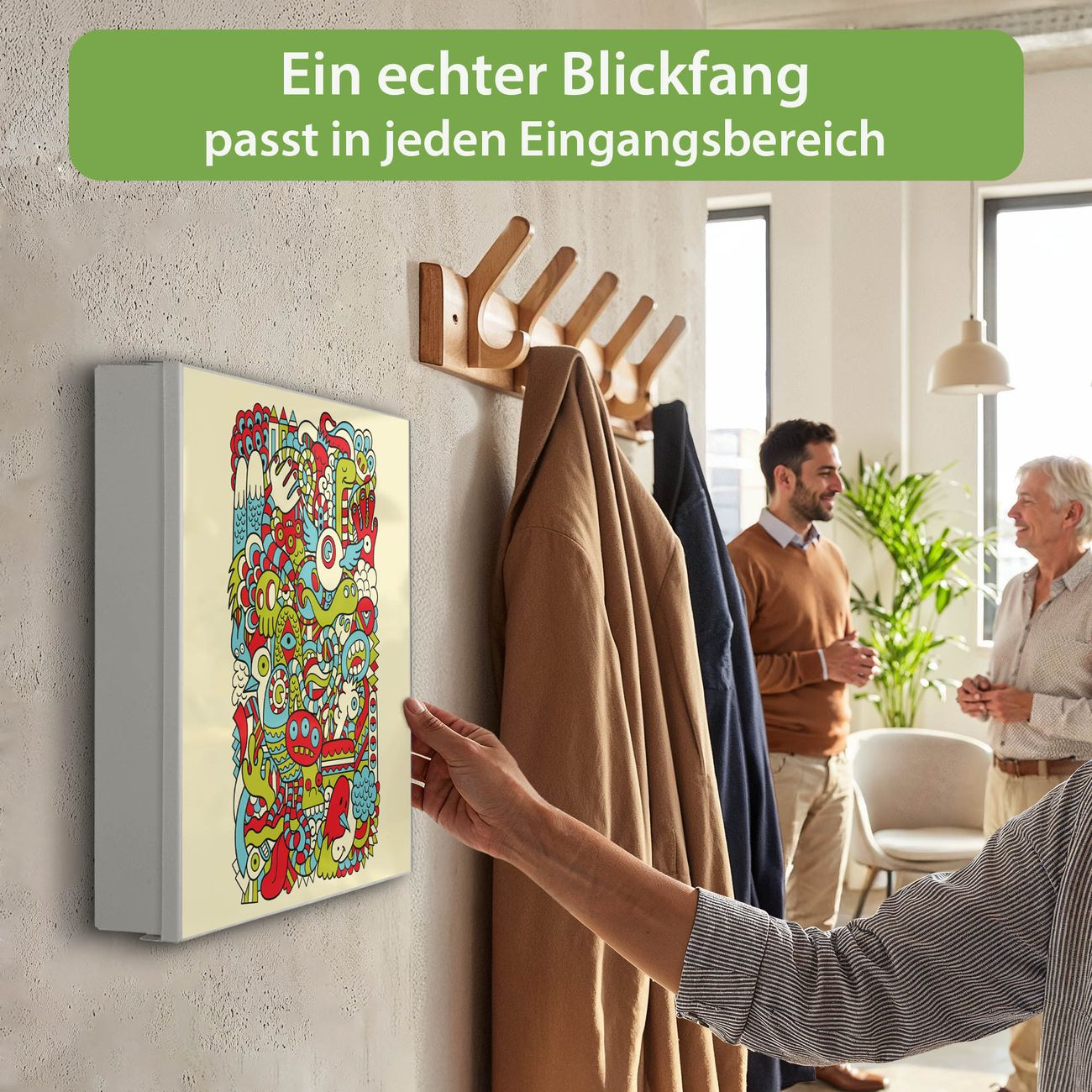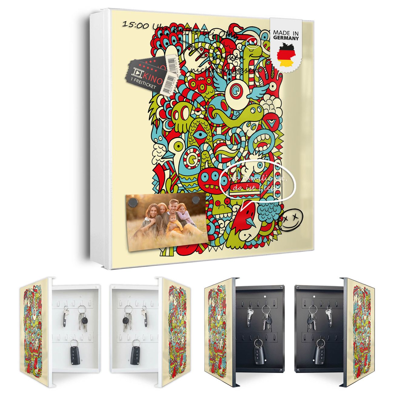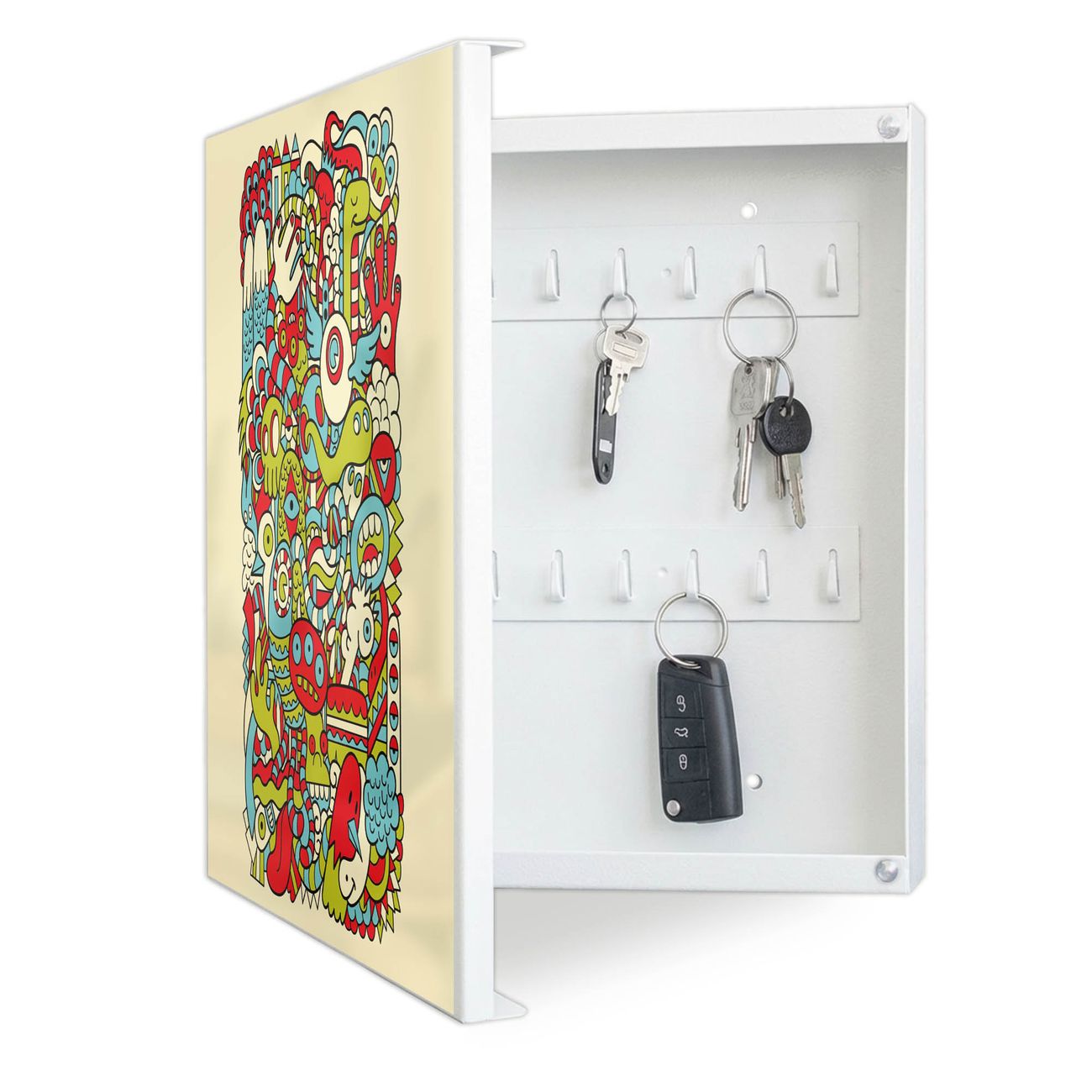 Bringe Ordnung und Eleganz in deinen Eingangsbereich mit dem banjado Schlüsselkasten Motiv Motiv Birds Worms Freaks. Die moderne Schlüsselbox kombiniert funktionales Design mit hochwertiger Verarbeitung und wird so zu einem echten Hingucker in Flur, Büro oder Ferienwohnung. ✅ Stilvolle Schlüsselaufbewahrung mit Motiv Motiv Birds Worms Freaks Der Design-Schlüsselkasten Motiv Motiv Birds Worms Freaks bietet Platz für bis zu 32 Schlüssel, die auf 4 stabilen Reihen mit je 8 Haken übersichtlich verstaut werden. Mit seinen kompakten Maßen von 30 x 30 x 5 cm passt die Schlüsselbox perfekt auch in kleinere Räume. Der weiß lackierte Stahlkorpus mit links angeschlagenem Türscharnier harmoniert mit gedruckten Folie auf der Front und fügt sich nahtlos in jedes Wohnambiente ein. Ob als Schlüsselorganizer für Zuhause oder als praktische Lösung für Büros, Praxen und Gewerbe, der banjado Schlüsselkasten sorgt für Ordnung und Übersicht. Dank der magnetischen, mit Kreidestiften beschreibbaren Folie auf der Front kannst du Notizen anheften oder Termine direkt auf der Oberfläche festhalten. Die Schlüsselbox Motiv Motiv Birds Worms Freaks zur Wandmontage wird inklusive Befestigungsmaterial geliefert und ist schnell angebracht. So hast du deine Schlüssel jederzeit griffbereit und zugleich stilvoll verstaut. Mit diesem banjado Schlüsselkasten Motiv Motiv Birds Worms Freaks kombinierst du praktische Aufbewahrung mit stilvollem Wohndesign. Ob privat oder geschäftlich, die Schlüsselbox sorgt für mehr Ordnung, Übersicht und ein wohnliches Ambiente.Vorteile im Überblick