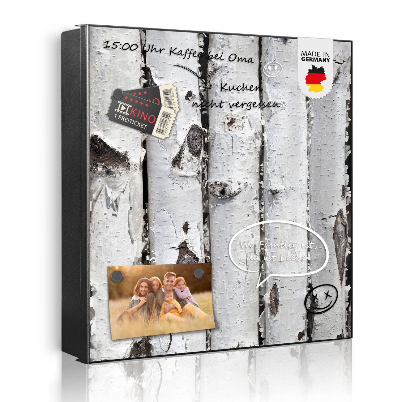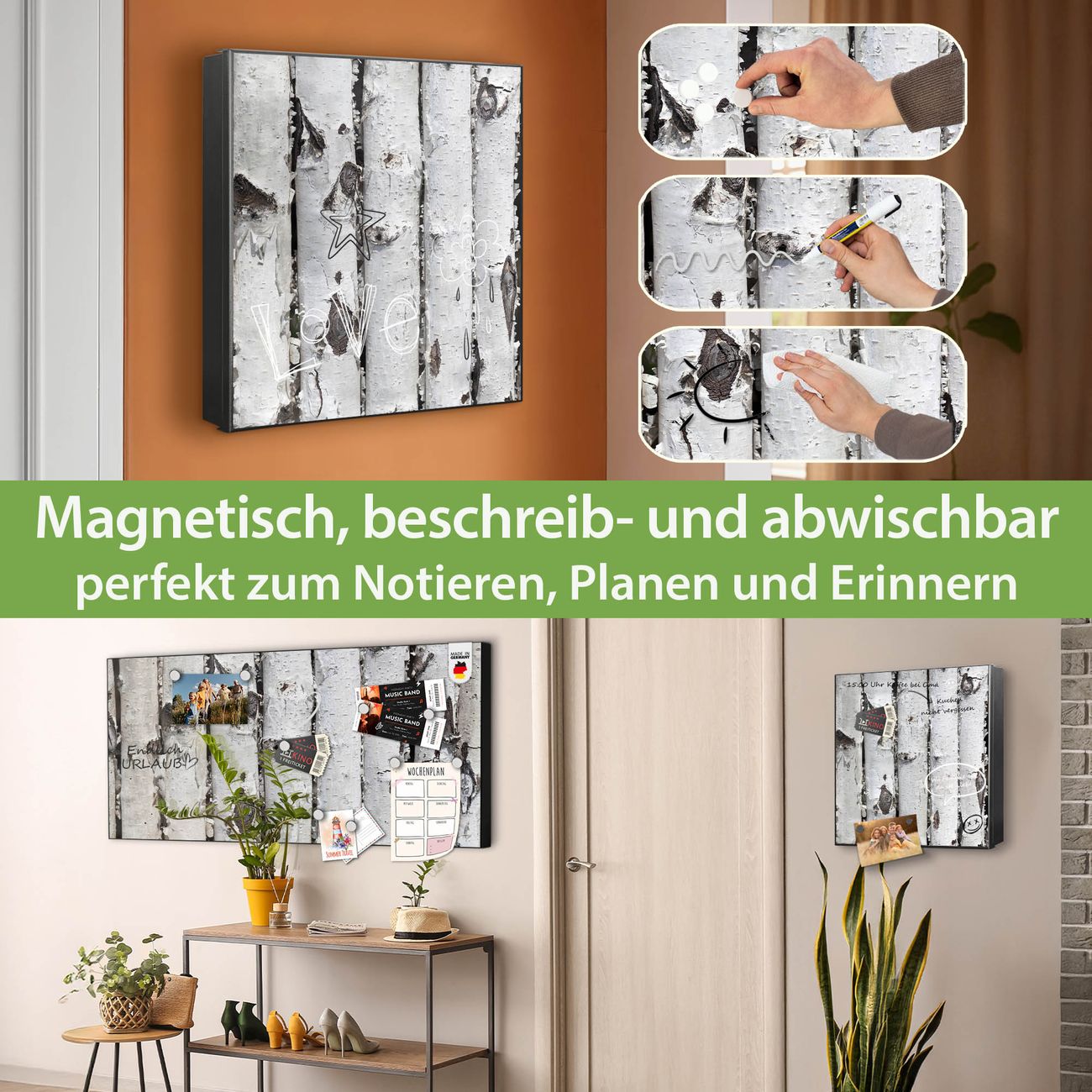 Bringe Ordnung und Eleganz in deinen Eingangsbereich mit dem banjado Schlüsselkasten Motiv Motiv Birkenrinde. Die moderne Schlüsselbox kombiniert funktionales Design mit hochwertiger Verarbeitung und wird so zu einem echten Hingucker in Flur, Büro oder Ferienwohnung. ✅ Stilvolle Schlüsselaufbewahrung mit Motiv Motiv Birkenrinde Der Design-Schlüsselkasten Motiv Motiv Birkenrinde bietet Platz für bis zu 32 Schlüssel, die auf 4 stabilen Reihen mit je 8 Haken übersichtlich verstaut werden. Mit seinen kompakten Maßen von 30 x 30 x 5 cm passt die Schlüsselbox perfekt auch in kleinere Räume. Der schwarz lackierte Stahlkorpus mit links angeschlagenem Türscharnier harmoniert mit gedruckten Folie auf der Front und fügt sich nahtlos in jedes Wohnambiente ein. Ob als Schlüsselorganizer für Zuhause oder als praktische Lösung für Büros, Praxen und Gewerbe, der banjado Schlüsselkasten sorgt für Ordnung und Übersicht. Dank der magnetischen, mit Kreidestiften beschreibbaren Folie auf der Front kannst du Notizen anheften oder Termine direkt auf der Oberfläche festhalten. Die Schlüsselbox Motiv Motiv Birkenrinde zur Wandmontage wird inklusive Befestigungsmaterial geliefert und ist schnell angebracht. So hast du deine Schlüssel jederzeit griffbereit und zugleich stilvoll verstaut. Mit diesem banjado Schlüsselkasten Motiv Motiv Birkenrinde kombinierst du praktische Aufbewahrung mit stilvollem Wohndesign. Ob privat oder geschäftlich, die Schlüsselbox sorgt für mehr Ordnung, Übersicht und ein wohnliches Ambiente.Vorteile im Überblick