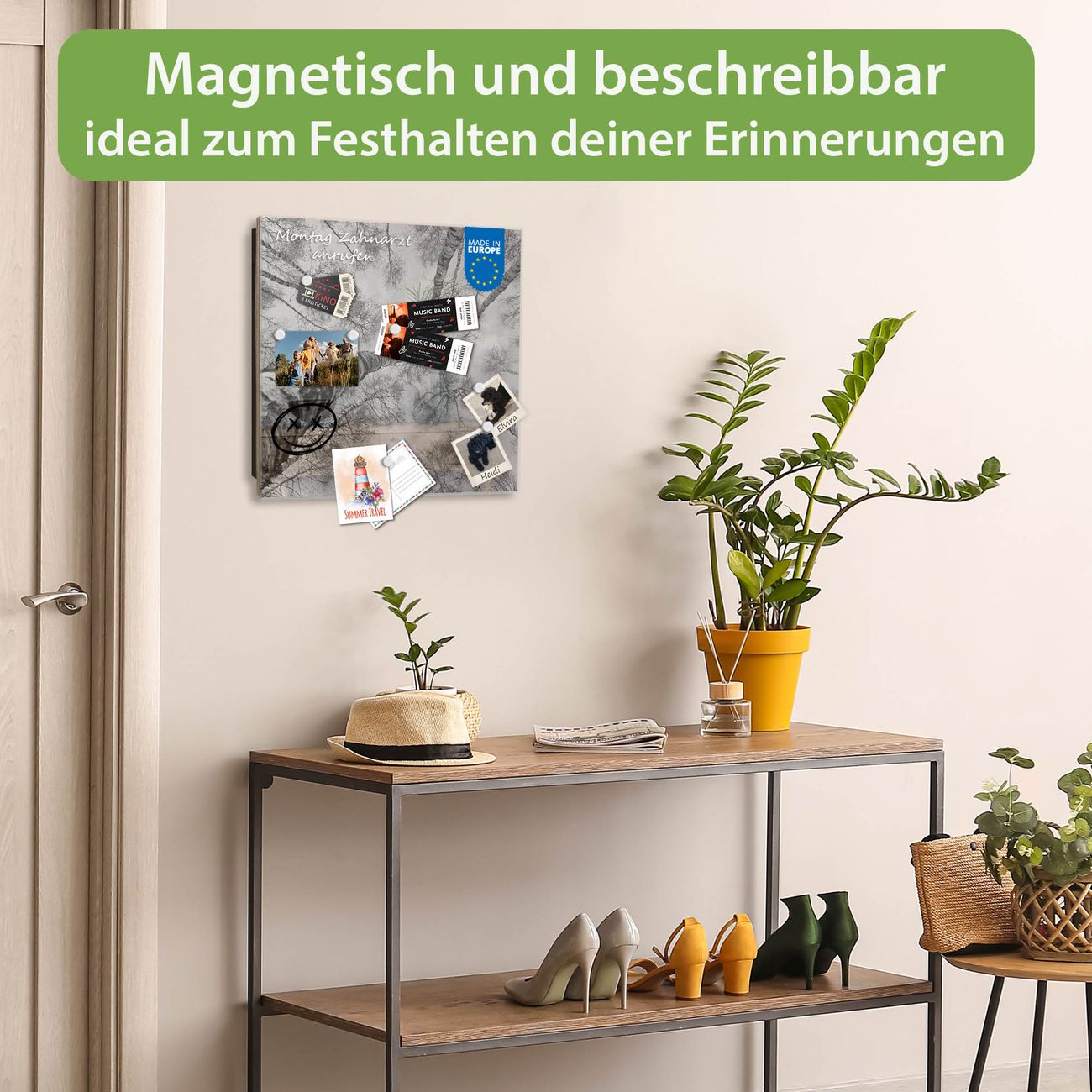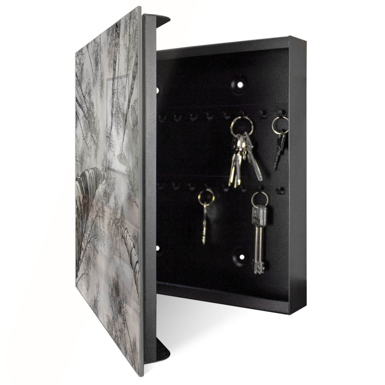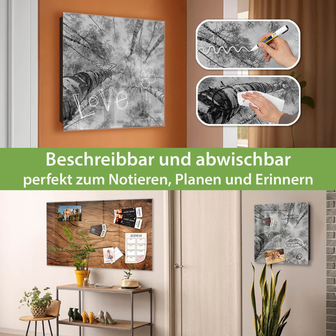 Bringe Ordnung und Eleganz in deinen Eingangsbereich mit dem banjado Schlüsselkasten Motiv Motiv Birkenwald. Die moderne Schlüsselbox kombiniert funktionales Design mit hochwertiger Verarbeitung und wird so zu einem echten Hingucker in Flur, Büro oder Ferienwohnung. ✅ Stilvolle Schlüsselaufbewahrung mit Glasfront im Motiv Motiv Birkenwald Der Design-Schlüsselkasten Motiv Motiv Birkenwald bietet Platz für bis zu 50 Schlüssel, die auf 5 stabilen Reihen mit je 10 Haken übersichtlich verstaut werden. Mit seinen kompakten Maßen von 30 x 30 x 5 cm passt die Schlüsselbox perfekt auch in kleinere Räume. Der schwarz lackierte Stahlkorpus mit rechts angeschlagenem Türscharnier harmoniert mit der Glasfront und fügt sich nahtlos in jedes Wohnambiente ein. Ob als Schlüsselorganizer für Zuhause oder als praktische Lösung für Büros, Praxen und Gewerbe, der banjado Schlüsselkasten sorgt für Ordnung und Übersicht. Dank der magnetischen, mit Kreidestiften beschreibbaren Glasfront kannst du Notizen anheften oder Termine direkt auf der Oberfläche festhalten. Die Schlüsselbox Motiv Motiv Birkenwald zur Wandmontage wird inklusive Befestigungsmaterial geliefert und ist schnell angebracht. So hast du deine Schlüssel jederzeit griffbereit und zugleich stilvoll verstaut. Mit diesem banjado Schlüsselkasten Motiv Motiv Birkenwald kombinierst du praktische Aufbewahrung mit stilvollem Wohndesign. Ob privat oder geschäftlich, die Schlüsselbox sorgt für mehr Ordnung, Übersicht und ein wohnliches Ambiente.Vorteile im Überblick