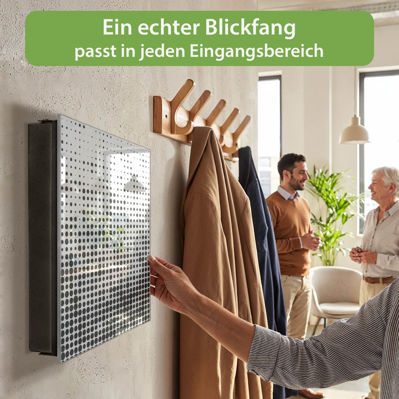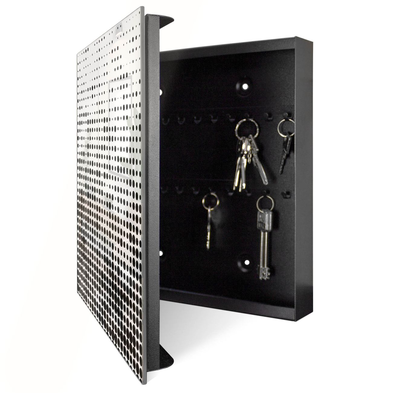 Bringe Ordnung und Eleganz in deinen Eingangsbereich mit dem banjado Schlüsselkasten Motiv Motiv Black or White. Die moderne Schlüsselbox kombiniert funktionales Design mit hochwertiger Verarbeitung und wird so zu einem echten Hingucker in Flur, Büro oder Ferienwohnung. ✅ Stilvolle Schlüsselaufbewahrung mit Glasfront im Motiv Motiv Black or White Der Design-Schlüsselkasten Motiv Motiv Black or White bietet Platz für bis zu 50 Schlüssel, die auf 5 stabilen Reihen mit je 10 Haken übersichtlich verstaut werden. Mit seinen kompakten Maßen von 30 x 30 x 5 cm passt die Schlüsselbox perfekt auch in kleinere Räume. Der schwarz lackierte Stahlkorpus mit rechts angeschlagenem Türscharnier harmoniert mit der Glasfront und fügt sich nahtlos in jedes Wohnambiente ein. Ob als Schlüsselorganizer für Zuhause oder als praktische Lösung für Büros, Praxen und Gewerbe, der banjado Schlüsselkasten sorgt für Ordnung und Übersicht. Dank der magnetischen, mit Kreidestiften beschreibbaren Glasfront kannst du Notizen anheften oder Termine direkt auf der Oberfläche festhalten. Die Schlüsselbox Motiv Motiv Black or White zur Wandmontage wird inklusive Befestigungsmaterial geliefert und ist schnell angebracht. So hast du deine Schlüssel jederzeit griffbereit und zugleich stilvoll verstaut. Mit diesem banjado Schlüsselkasten Motiv Motiv Black or White kombinierst du praktische Aufbewahrung mit stilvollem Wohndesign. Ob privat oder geschäftlich, die Schlüsselbox sorgt für mehr Ordnung, Übersicht und ein wohnliches Ambiente.Vorteile im Überblick
