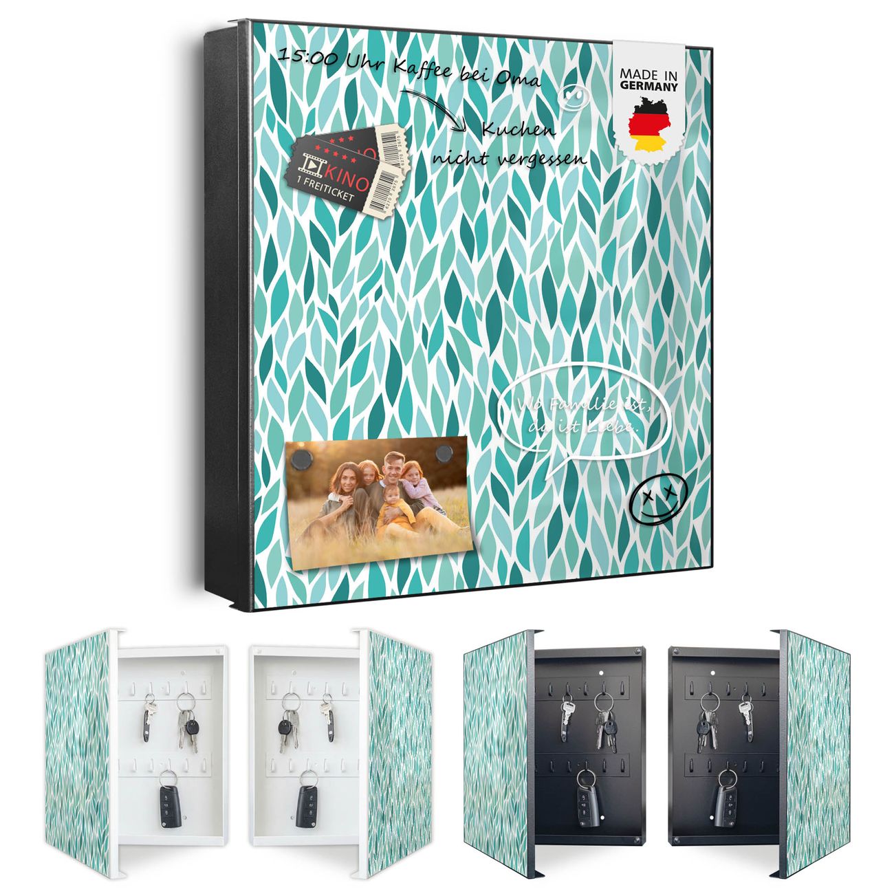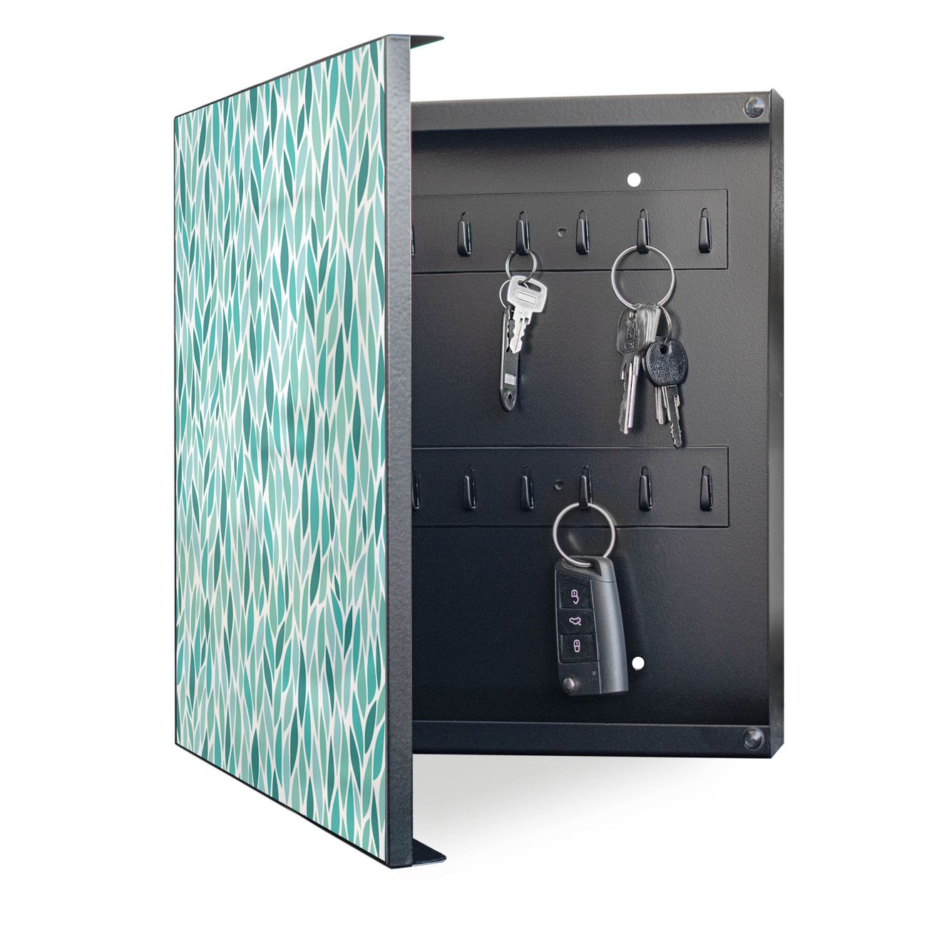 Bringe Ordnung und Eleganz in deinen Eingangsbereich mit dem banjado Schlüsselkasten Motiv Motiv Blätter Mint. Die moderne Schlüsselbox kombiniert funktionales Design mit hochwertiger Verarbeitung und wird so zu einem echten Hingucker in Flur, Büro oder Ferienwohnung. ✅ Stilvolle Schlüsselaufbewahrung mit Motiv Motiv Blätter Mint Der Design-Schlüsselkasten Motiv Motiv Blätter Mint bietet Platz für bis zu 32 Schlüssel, die auf 4 stabilen Reihen mit je 8 Haken übersichtlich verstaut werden. Mit seinen kompakten Maßen von 30 x 30 x 5 cm passt die Schlüsselbox perfekt auch in kleinere Räume. Der schwarz lackierte Stahlkorpus mit links angeschlagenem Türscharnier harmoniert mit gedruckten Folie auf der Front und fügt sich nahtlos in jedes Wohnambiente ein. Ob als Schlüsselorganizer für Zuhause oder als praktische Lösung für Büros, Praxen und Gewerbe, der banjado Schlüsselkasten sorgt für Ordnung und Übersicht. Dank der magnetischen, mit Kreidestiften beschreibbaren Folie auf der Front kannst du Notizen anheften oder Termine direkt auf der Oberfläche festhalten. Die Schlüsselbox Motiv Motiv Blätter Mint zur Wandmontage wird inklusive Befestigungsmaterial geliefert und ist schnell angebracht. So hast du deine Schlüssel jederzeit griffbereit und zugleich stilvoll verstaut. Mit diesem banjado Schlüsselkasten Motiv Motiv Blätter Mint kombinierst du praktische Aufbewahrung mit stilvollem Wohndesign. Ob privat oder geschäftlich, die Schlüsselbox sorgt für mehr Ordnung, Übersicht und ein wohnliches Ambiente.Vorteile im Überblick
