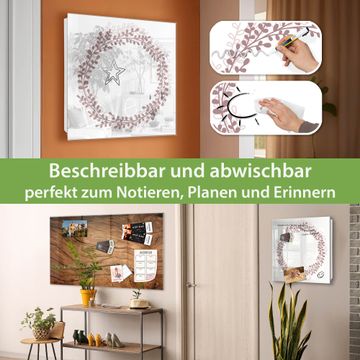 Bringe Ordnung und Eleganz in deinen Eingangsbereich mit dem banjado Schlüsselkasten Motiv Motiv Blätterkranz. Die moderne Schlüsselbox kombiniert funktionales Design mit hochwertiger Verarbeitung und wird so zu einem echten Hingucker in Flur, Büro oder Ferienwohnung. ✅ Stilvolle Schlüsselaufbewahrung mit Glasfront im Motiv Motiv Blätterkranz Der Design-Schlüsselkasten Motiv Motiv Blätterkranz bietet Platz für bis zu 50 Schlüssel, die auf 5 stabilen Reihen mit je 10 Haken übersichtlich verstaut werden. Mit seinen kompakten Maßen von 30 x 30 x 5 cm passt die Schlüsselbox perfekt auch in kleinere Räume. Der weiß lackierte Stahlkorpus mit rechts angeschlagenem Türscharnier harmoniert mit der Glasfront und fügt sich nahtlos in jedes Wohnambiente ein. Ob als Schlüsselorganizer für Zuhause oder als praktische Lösung für Büros, Praxen und Gewerbe, der banjado Schlüsselkasten sorgt für Ordnung und Übersicht. Dank der magnetischen, mit Kreidestiften beschreibbaren Glasfront kannst du Notizen anheften oder Termine direkt auf der Oberfläche festhalten. Die Schlüsselbox Motiv Motiv Blätterkranz zur Wandmontage wird inklusive Befestigungsmaterial geliefert und ist schnell angebracht. So hast du deine Schlüssel jederzeit griffbereit und zugleich stilvoll verstaut. Mit diesem banjado Schlüsselkasten Motiv Motiv Blätterkranz kombinierst du praktische Aufbewahrung mit stilvollem Wohndesign. Ob privat oder geschäftlich, die Schlüsselbox sorgt für mehr Ordnung, Übersicht und ein wohnliches Ambiente.Vorteile im Überblick