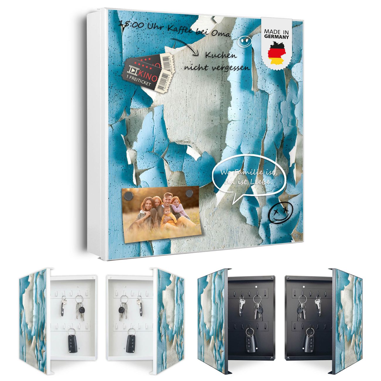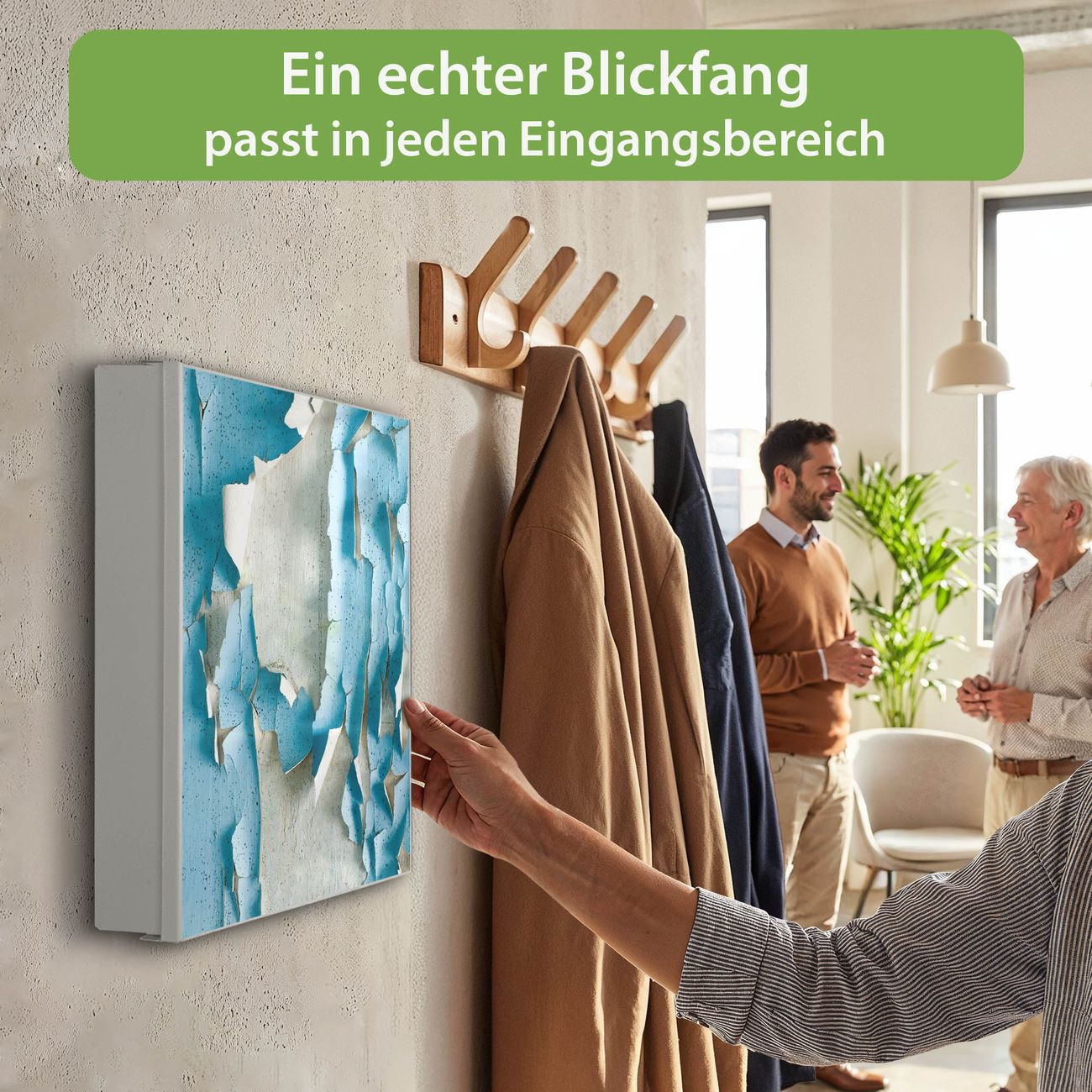 Bringe Ordnung und Eleganz in deinen Eingangsbereich mit dem banjado Schlüsselkasten Motiv Motiv Blätternde Farbe. Die moderne Schlüsselbox kombiniert funktionales Design mit hochwertiger Verarbeitung und wird so zu einem echten Hingucker in Flur, Büro oder Ferienwohnung. ✅ Stilvolle Schlüsselaufbewahrung mit Motiv Motiv Blätternde Farbe Der Design-Schlüsselkasten Motiv Motiv Blätternde Farbe bietet Platz für bis zu 32 Schlüssel, die auf 4 stabilen Reihen mit je 8 Haken übersichtlich verstaut werden. Mit seinen kompakten Maßen von 30 x 30 x 5 cm passt die Schlüsselbox perfekt auch in kleinere Räume. Der weiß lackierte Stahlkorpus mit links angeschlagenem Türscharnier harmoniert mit gedruckten Folie auf der Front und fügt sich nahtlos in jedes Wohnambiente ein. Ob als Schlüsselorganizer für Zuhause oder als praktische Lösung für Büros, Praxen und Gewerbe, der banjado Schlüsselkasten sorgt für Ordnung und Übersicht. Dank der magnetischen, mit Kreidestiften beschreibbaren Folie auf der Front kannst du Notizen anheften oder Termine direkt auf der Oberfläche festhalten. Die Schlüsselbox Motiv Motiv Blätternde Farbe zur Wandmontage wird inklusive Befestigungsmaterial geliefert und ist schnell angebracht. So hast du deine Schlüssel jederzeit griffbereit und zugleich stilvoll verstaut. Mit diesem banjado Schlüsselkasten Motiv Motiv Blätternde Farbe kombinierst du praktische Aufbewahrung mit stilvollem Wohndesign. Ob privat oder geschäftlich, die Schlüsselbox sorgt für mehr Ordnung, Übersicht und ein wohnliches Ambiente.Vorteile im Überblick