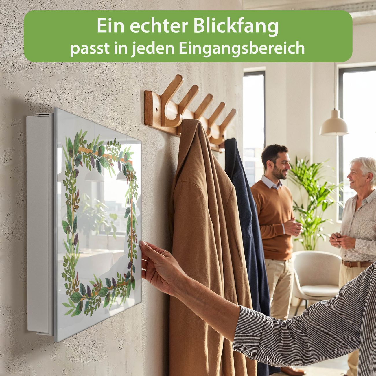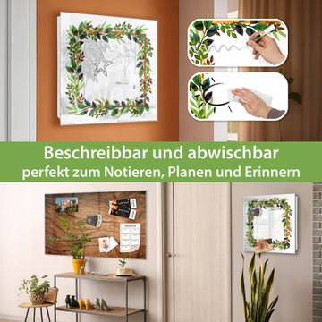 Bringe Ordnung und Eleganz in deinen Eingangsbereich mit dem banjado Schlüsselkasten Motiv Motiv Blätterrahmen 2. Die moderne Schlüsselbox kombiniert funktionales Design mit hochwertiger Verarbeitung und wird so zu einem echten Hingucker in Flur, Büro oder Ferienwohnung. ✅ Stilvolle Schlüsselaufbewahrung mit Glasfront im Motiv Motiv Blätterrahmen 2 Der Design-Schlüsselkasten Motiv Motiv Blätterrahmen 2 bietet Platz für bis zu 50 Schlüssel, die auf 5 stabilen Reihen mit je 10 Haken übersichtlich verstaut werden. Mit seinen kompakten Maßen von 30 x 30 x 5 cm passt die Schlüsselbox perfekt auch in kleinere Räume. Der weiß lackierte Stahlkorpus mit rechts angeschlagenem Türscharnier harmoniert mit der Glasfront und fügt sich nahtlos in jedes Wohnambiente ein. Ob als Schlüsselorganizer für Zuhause oder als praktische Lösung für Büros, Praxen und Gewerbe, der banjado Schlüsselkasten sorgt für Ordnung und Übersicht. Dank der magnetischen, mit Kreidestiften beschreibbaren Glasfront kannst du Notizen anheften oder Termine direkt auf der Oberfläche festhalten. Die Schlüsselbox Motiv Motiv Blätterrahmen 2 zur Wandmontage wird inklusive Befestigungsmaterial geliefert und ist schnell angebracht. So hast du deine Schlüssel jederzeit griffbereit und zugleich stilvoll verstaut. Mit diesem banjado Schlüsselkasten Motiv Motiv Blätterrahmen 2 kombinierst du praktische Aufbewahrung mit stilvollem Wohndesign. Ob privat oder geschäftlich, die Schlüsselbox sorgt für mehr Ordnung, Übersicht und ein wohnliches Ambiente.Vorteile im Überblick