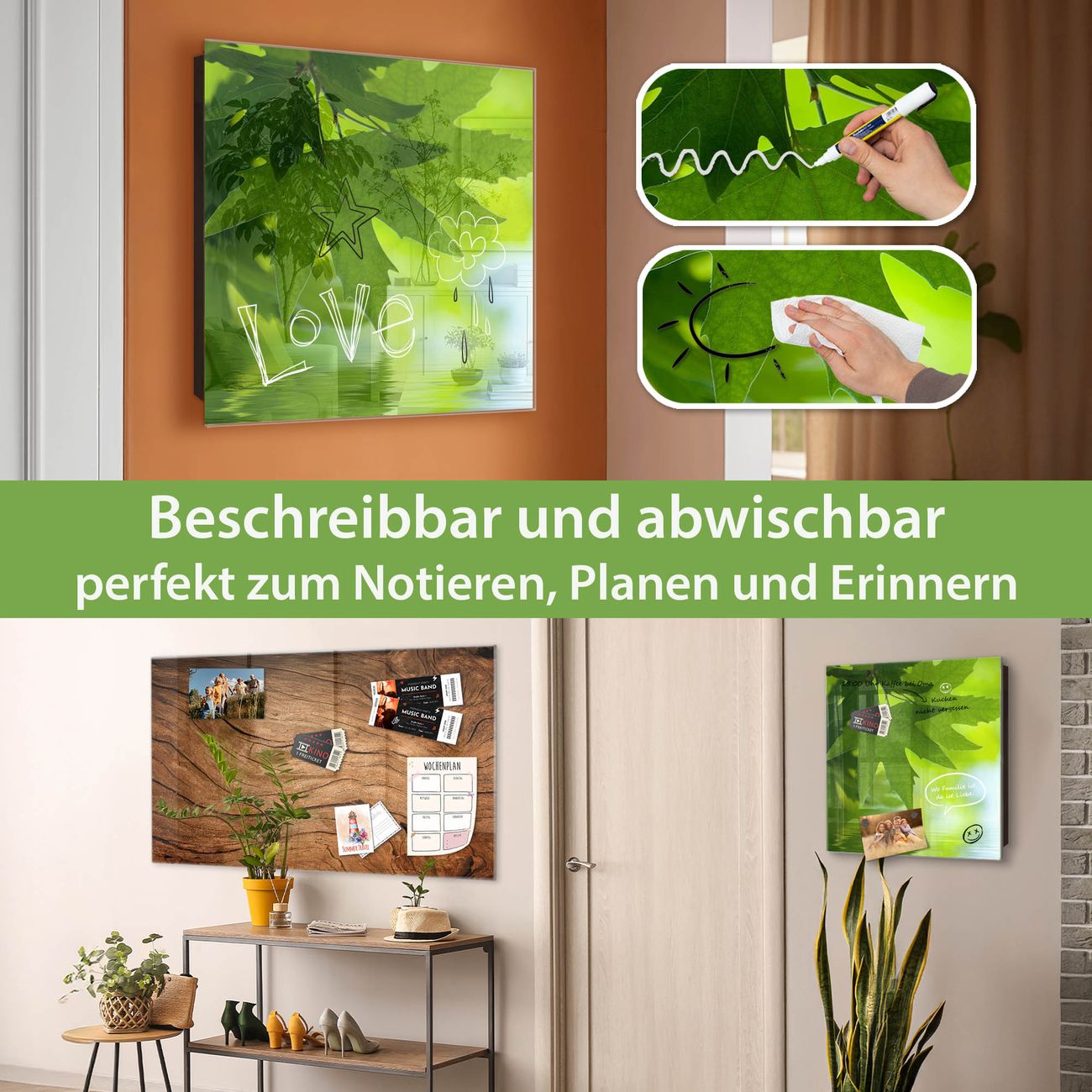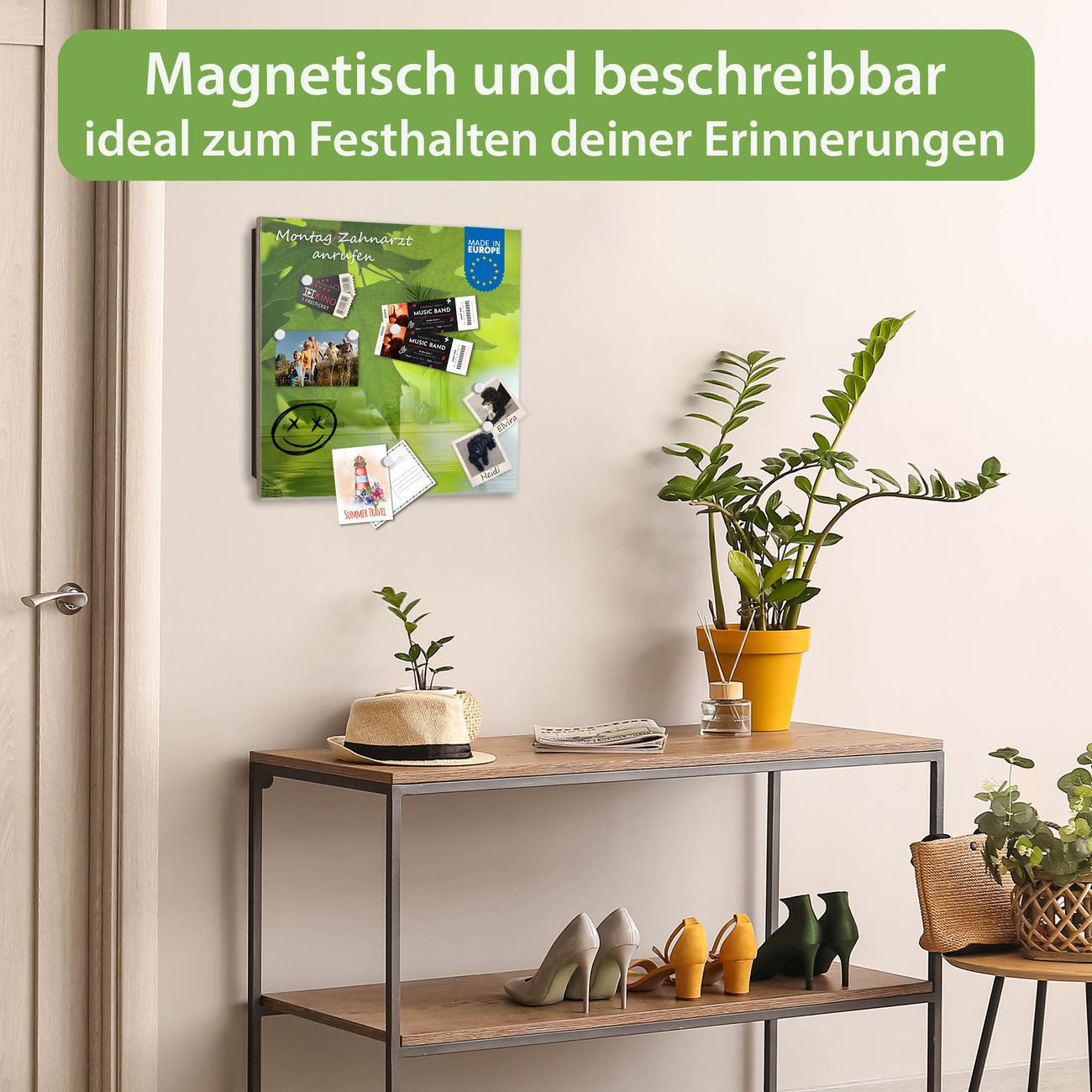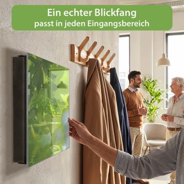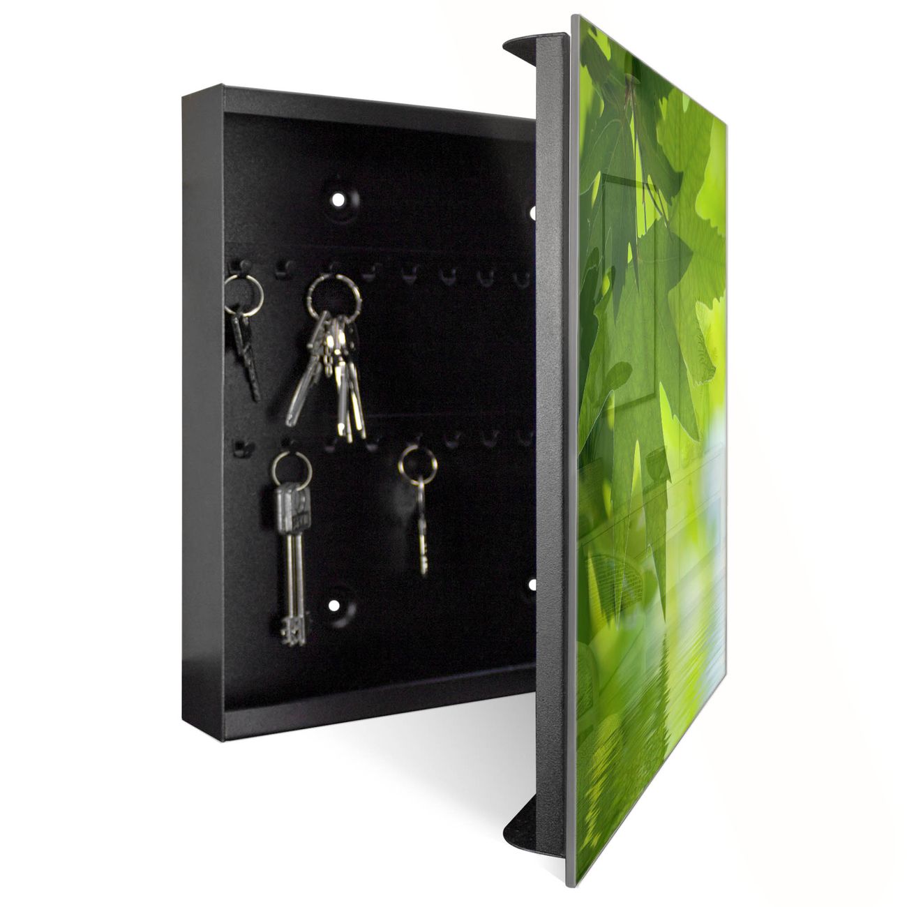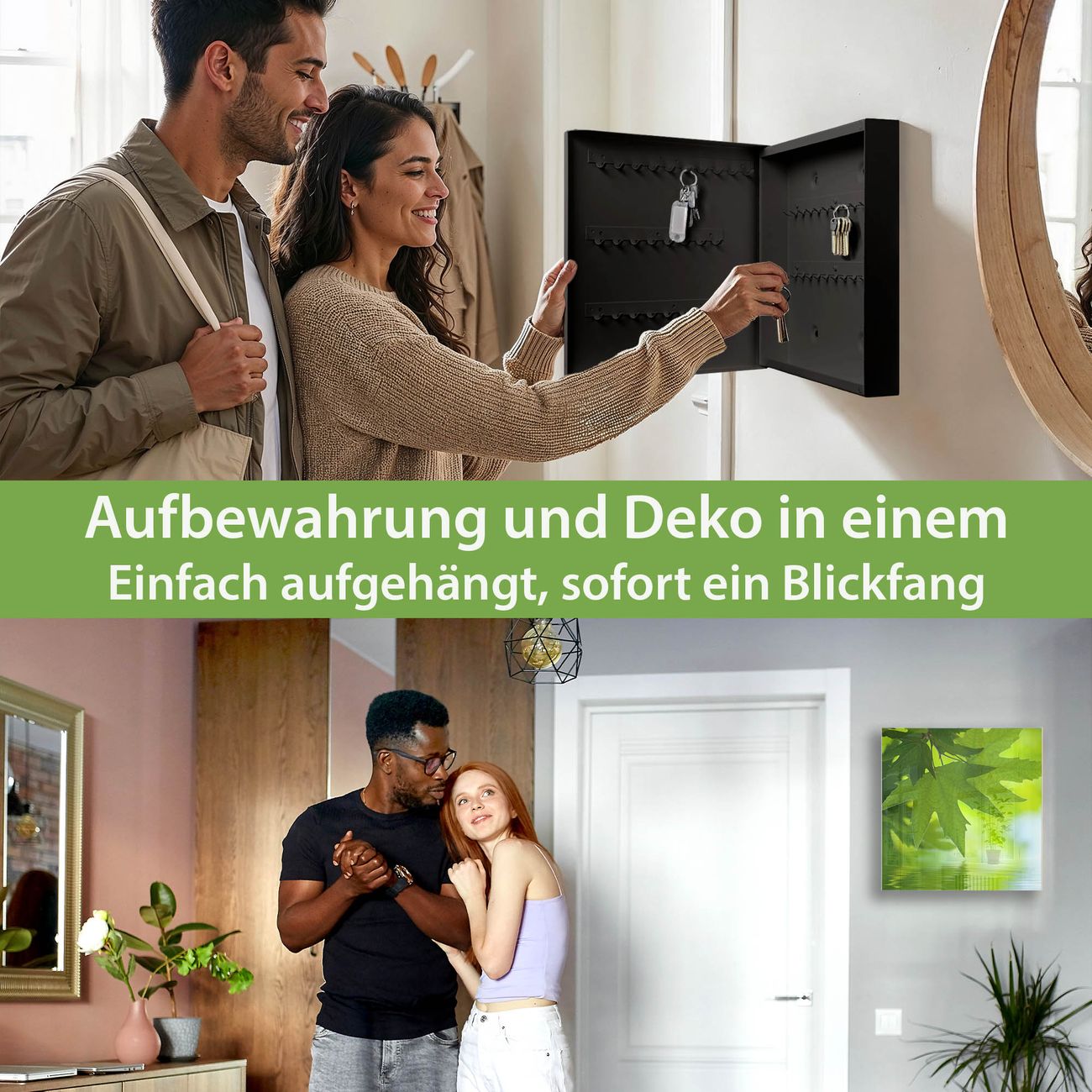 Bringe Ordnung und Eleganz in deinen Eingangsbereich mit dem banjado Schlüsselkasten Motiv Motiv Blättertraum. Die moderne Schlüsselbox kombiniert funktionales Design mit hochwertiger Verarbeitung und wird so zu einem echten Hingucker in Flur, Büro oder Ferienwohnung. ✅ Stilvolle Schlüsselaufbewahrung mit Glasfront im Motiv Motiv Blättertraum Der Design-Schlüsselkasten Motiv Motiv Blättertraum bietet Platz für bis zu 50 Schlüssel, die auf 5 stabilen Reihen mit je 10 Haken übersichtlich verstaut werden. Mit seinen kompakten Maßen von 30 x 30 x 5 cm passt die Schlüsselbox perfekt auch in kleinere Räume. Der schwarz lackierte Stahlkorpus mit rechts angeschlagenem Türscharnier harmoniert mit der Glasfront und fügt sich nahtlos in jedes Wohnambiente ein. Ob als Schlüsselorganizer für Zuhause oder als praktische Lösung für Büros, Praxen und Gewerbe, der banjado Schlüsselkasten sorgt für Ordnung und Übersicht. Dank der magnetischen, mit Kreidestiften beschreibbaren Glasfront kannst du Notizen anheften oder Termine direkt auf der Oberfläche festhalten. Die Schlüsselbox Motiv Motiv Blättertraum zur Wandmontage wird inklusive Befestigungsmaterial geliefert und ist schnell angebracht. So hast du deine Schlüssel jederzeit griffbereit und zugleich stilvoll verstaut. Mit diesem banjado Schlüsselkasten Motiv Motiv Blättertraum kombinierst du praktische Aufbewahrung mit stilvollem Wohndesign. Ob privat oder geschäftlich, die Schlüsselbox sorgt für mehr Ordnung, Übersicht und ein wohnliches Ambiente.Vorteile im Überblick