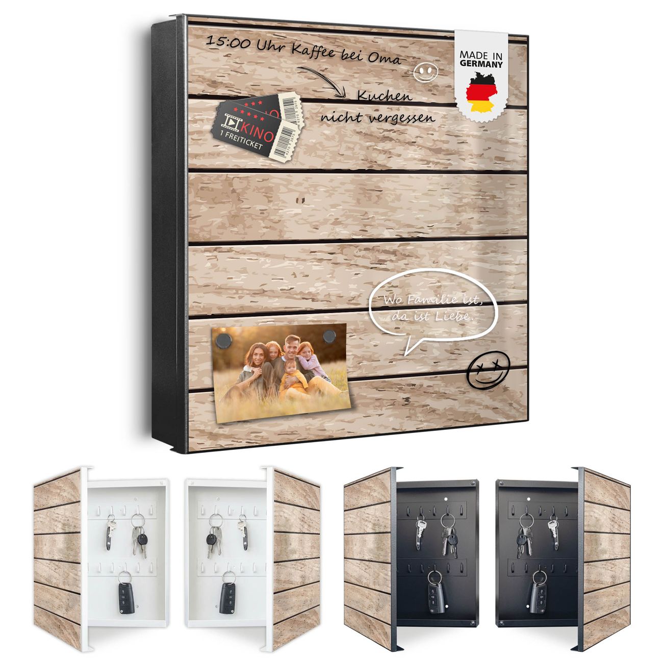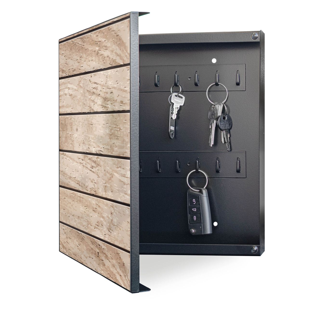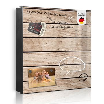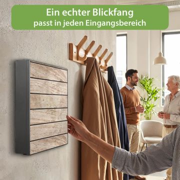 Bringe Ordnung und Eleganz in deinen Eingangsbereich mit dem banjado Schlüsselkasten Motiv Motiv Blasse Holzlatten. Die moderne Schlüsselbox kombiniert funktionales Design mit hochwertiger Verarbeitung und wird so zu einem echten Hingucker in Flur, Büro oder Ferienwohnung. ✅ Stilvolle Schlüsselaufbewahrung mit Motiv Motiv Blasse Holzlatten Der Design-Schlüsselkasten Motiv Motiv Blasse Holzlatten bietet Platz für bis zu 32 Schlüssel, die auf 4 stabilen Reihen mit je 8 Haken übersichtlich verstaut werden. Mit seinen kompakten Maßen von 30 x 30 x 5 cm passt die Schlüsselbox perfekt auch in kleinere Räume. Der schwarz lackierte Stahlkorpus mit links angeschlagenem Türscharnier harmoniert mit gedruckten Folie auf der Front und fügt sich nahtlos in jedes Wohnambiente ein. Ob als Schlüsselorganizer für Zuhause oder als praktische Lösung für Büros, Praxen und Gewerbe, der banjado Schlüsselkasten sorgt für Ordnung und Übersicht. Dank der magnetischen, mit Kreidestiften beschreibbaren Folie auf der Front kannst du Notizen anheften oder Termine direkt auf der Oberfläche festhalten. Die Schlüsselbox Motiv Motiv Blasse Holzlatten zur Wandmontage wird inklusive Befestigungsmaterial geliefert und ist schnell angebracht. So hast du deine Schlüssel jederzeit griffbereit und zugleich stilvoll verstaut. Mit diesem banjado Schlüsselkasten Motiv Motiv Blasse Holzlatten kombinierst du praktische Aufbewahrung mit stilvollem Wohndesign. Ob privat oder geschäftlich, die Schlüsselbox sorgt für mehr Ordnung, Übersicht und ein wohnliches Ambiente.Vorteile im Überblick