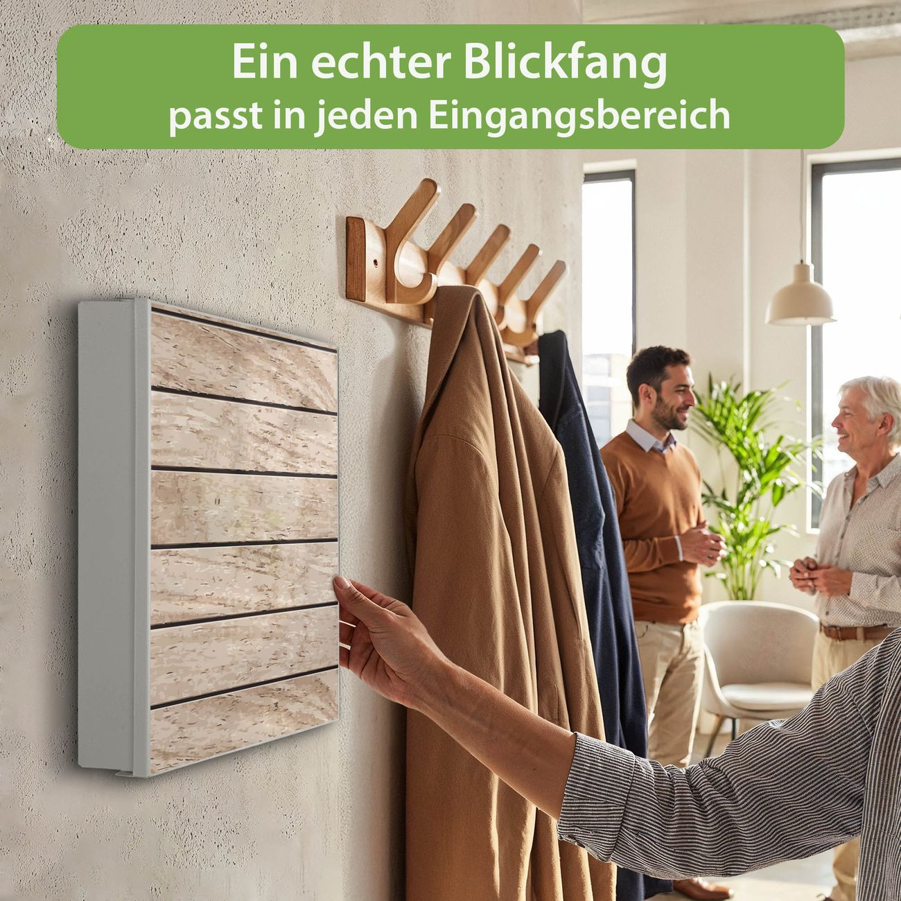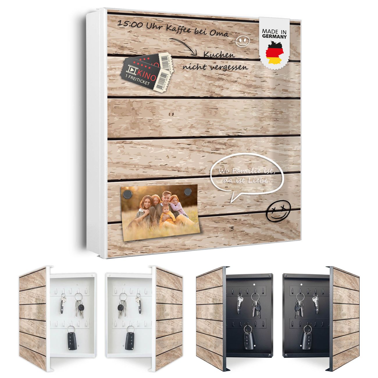 Bringe Ordnung und Eleganz in deinen Eingangsbereich mit dem banjado Schlüsselkasten Motiv Motiv Blasse Holzlatten. Die moderne Schlüsselbox kombiniert funktionales Design mit hochwertiger Verarbeitung und wird so zu einem echten Hingucker in Flur, Büro oder Ferienwohnung. ✅ Stilvolle Schlüsselaufbewahrung mit Motiv Motiv Blasse Holzlatten Der Design-Schlüsselkasten Motiv Motiv Blasse Holzlatten bietet Platz für bis zu 32 Schlüssel, die auf 4 stabilen Reihen mit je 8 Haken übersichtlich verstaut werden. Mit seinen kompakten Maßen von 30 x 30 x 5 cm passt die Schlüsselbox perfekt auch in kleinere Räume. Der weiß lackierte Stahlkorpus mit rechts angeschlagenem Türscharnier harmoniert mit gedruckten Folie auf der Front und fügt sich nahtlos in jedes Wohnambiente ein. Ob als Schlüsselorganizer für Zuhause oder als praktische Lösung für Büros, Praxen und Gewerbe, der banjado Schlüsselkasten sorgt für Ordnung und Übersicht. Dank der magnetischen, mit Kreidestiften beschreibbaren Folie auf der Front kannst du Notizen anheften oder Termine direkt auf der Oberfläche festhalten. Die Schlüsselbox Motiv Motiv Blasse Holzlatten zur Wandmontage wird inklusive Befestigungsmaterial geliefert und ist schnell angebracht. So hast du deine Schlüssel jederzeit griffbereit und zugleich stilvoll verstaut. Mit diesem banjado Schlüsselkasten Motiv Motiv Blasse Holzlatten kombinierst du praktische Aufbewahrung mit stilvollem Wohndesign. Ob privat oder geschäftlich, die Schlüsselbox sorgt für mehr Ordnung, Übersicht und ein wohnliches Ambiente.Vorteile im Überblick