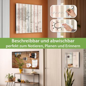 Bringe Ordnung und Eleganz in deinen Eingangsbereich mit dem banjado Schlüsselkasten Motiv Motiv Blasse Streifen. Die moderne Schlüsselbox kombiniert funktionales Design mit hochwertiger Verarbeitung und wird so zu einem echten Hingucker in Flur, Büro oder Ferienwohnung. ✅ Stilvolle Schlüsselaufbewahrung mit Glasfront im Motiv Motiv Blasse Streifen Der Design-Schlüsselkasten Motiv Motiv Blasse Streifen bietet Platz für bis zu 50 Schlüssel, die auf 5 stabilen Reihen mit je 10 Haken übersichtlich verstaut werden. Mit seinen kompakten Maßen von 30 x 30 x 5 cm passt die Schlüsselbox perfekt auch in kleinere Räume. Der schwarz lackierte Stahlkorpus mit rechts angeschlagenem Türscharnier harmoniert mit der Glasfront und fügt sich nahtlos in jedes Wohnambiente ein. Ob als Schlüsselorganizer für Zuhause oder als praktische Lösung für Büros, Praxen und Gewerbe, der banjado Schlüsselkasten sorgt für Ordnung und Übersicht. Dank der magnetischen, mit Kreidestiften beschreibbaren Glasfront kannst du Notizen anheften oder Termine direkt auf der Oberfläche festhalten. Die Schlüsselbox Motiv Motiv Blasse Streifen zur Wandmontage wird inklusive Befestigungsmaterial geliefert und ist schnell angebracht. So hast du deine Schlüssel jederzeit griffbereit und zugleich stilvoll verstaut. Mit diesem banjado Schlüsselkasten Motiv Motiv Blasse Streifen kombinierst du praktische Aufbewahrung mit stilvollem Wohndesign. Ob privat oder geschäftlich, die Schlüsselbox sorgt für mehr Ordnung, Übersicht und ein wohnliches Ambiente.Vorteile im Überblick