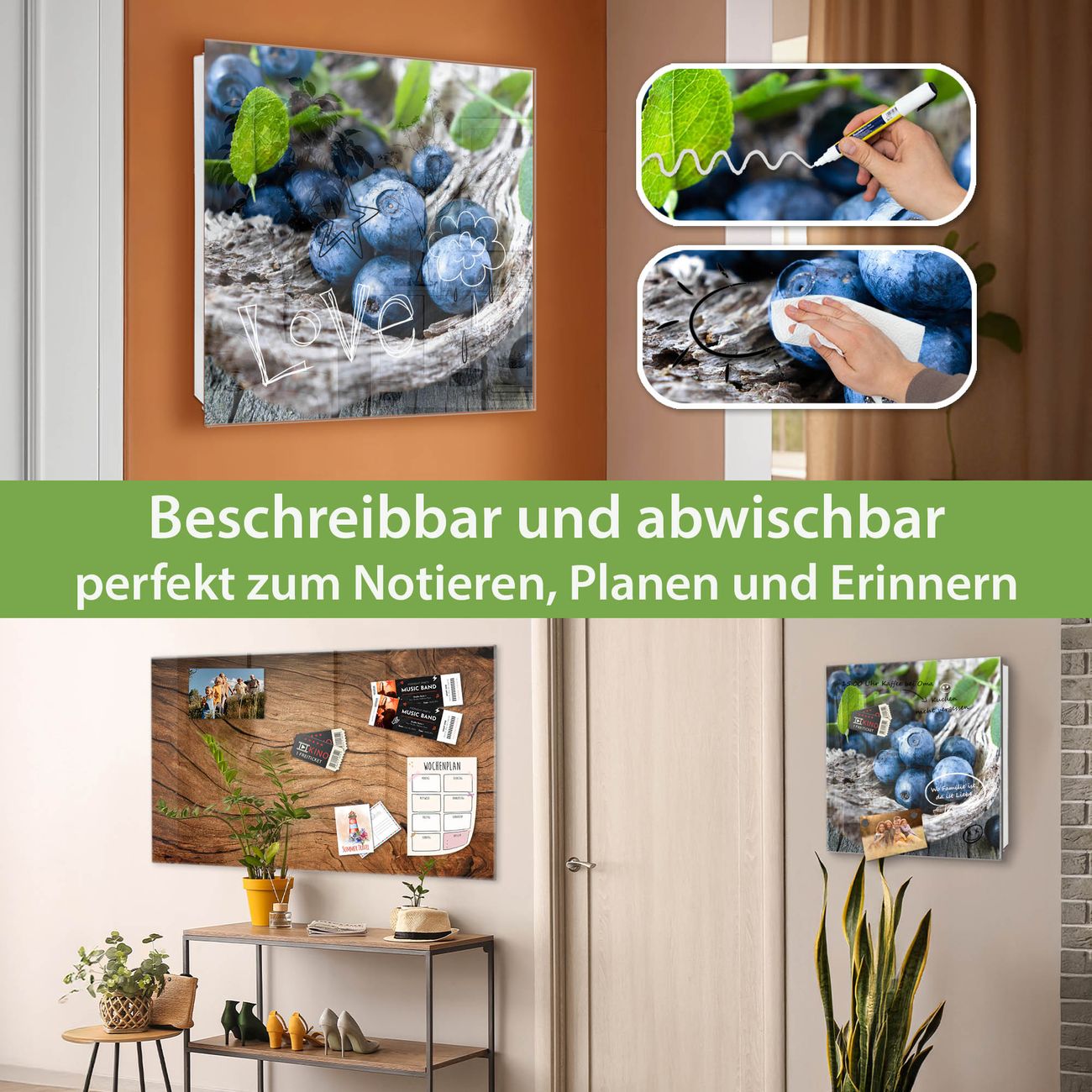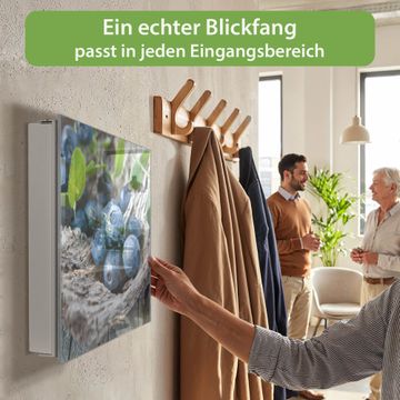 Bringe Ordnung und Eleganz in deinen Eingangsbereich mit dem banjado Schlüsselkasten Motiv Motiv Blaubeeren. Die moderne Schlüsselbox kombiniert funktionales Design mit hochwertiger Verarbeitung und wird so zu einem echten Hingucker in Flur, Büro oder Ferienwohnung. ✅ Stilvolle Schlüsselaufbewahrung mit Glasfront im Motiv Motiv Blaubeeren Der Design-Schlüsselkasten Motiv Motiv Blaubeeren bietet Platz für bis zu 50 Schlüssel, die auf 5 stabilen Reihen mit je 10 Haken übersichtlich verstaut werden. Mit seinen kompakten Maßen von 30 x 30 x 5 cm passt die Schlüsselbox perfekt auch in kleinere Räume. Der weiß lackierte Stahlkorpus mit rechts angeschlagenem Türscharnier harmoniert mit der Glasfront und fügt sich nahtlos in jedes Wohnambiente ein. Ob als Schlüsselorganizer für Zuhause oder als praktische Lösung für Büros, Praxen und Gewerbe, der banjado Schlüsselkasten sorgt für Ordnung und Übersicht. Dank der magnetischen, mit Kreidestiften beschreibbaren Glasfront kannst du Notizen anheften oder Termine direkt auf der Oberfläche festhalten. Die Schlüsselbox Motiv Motiv Blaubeeren zur Wandmontage wird inklusive Befestigungsmaterial geliefert und ist schnell angebracht. So hast du deine Schlüssel jederzeit griffbereit und zugleich stilvoll verstaut. Mit diesem banjado Schlüsselkasten Motiv Motiv Blaubeeren kombinierst du praktische Aufbewahrung mit stilvollem Wohndesign. Ob privat oder geschäftlich, die Schlüsselbox sorgt für mehr Ordnung, Übersicht und ein wohnliches Ambiente.Vorteile im Überblick
