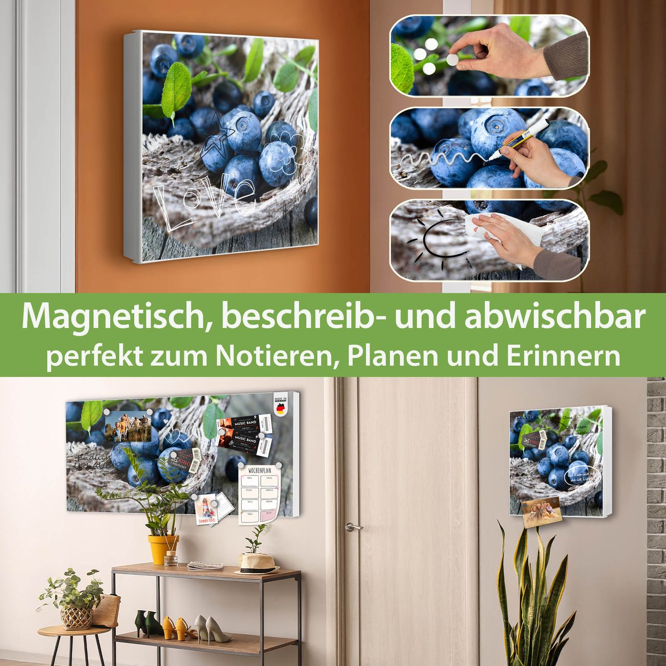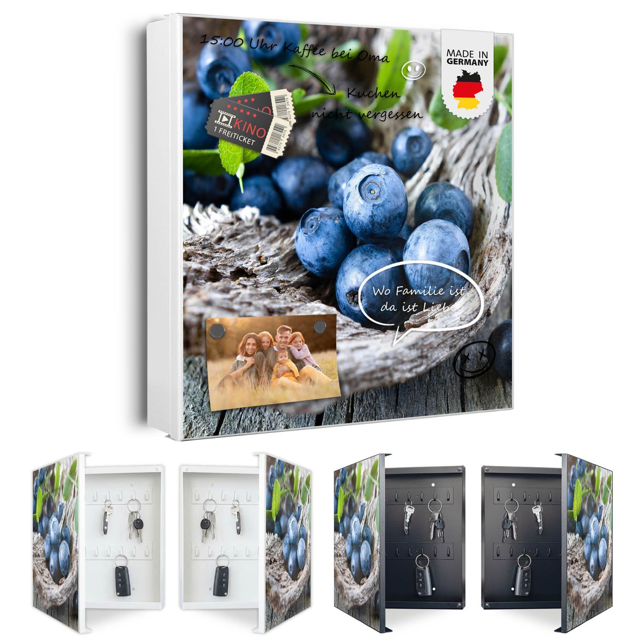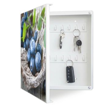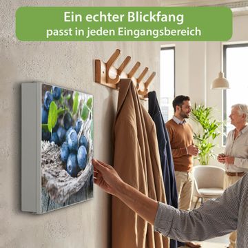 Bringe Ordnung und Eleganz in deinen Eingangsbereich mit dem banjado Schlüsselkasten Motiv Motiv Blaubeeren. Die moderne Schlüsselbox kombiniert funktionales Design mit hochwertiger Verarbeitung und wird so zu einem echten Hingucker in Flur, Büro oder Ferienwohnung. ✅ Stilvolle Schlüsselaufbewahrung mit Motiv Motiv Blaubeeren Der Design-Schlüsselkasten Motiv Motiv Blaubeeren bietet Platz für bis zu 32 Schlüssel, die auf 4 stabilen Reihen mit je 8 Haken übersichtlich verstaut werden. Mit seinen kompakten Maßen von 30 x 30 x 5 cm passt die Schlüsselbox perfekt auch in kleinere Räume. Der weiß lackierte Stahlkorpus mit links angeschlagenem Türscharnier harmoniert mit gedruckten Folie auf der Front und fügt sich nahtlos in jedes Wohnambiente ein. Ob als Schlüsselorganizer für Zuhause oder als praktische Lösung für Büros, Praxen und Gewerbe, der banjado Schlüsselkasten sorgt für Ordnung und Übersicht. Dank der magnetischen, mit Kreidestiften beschreibbaren Folie auf der Front kannst du Notizen anheften oder Termine direkt auf der Oberfläche festhalten. Die Schlüsselbox Motiv Motiv Blaubeeren zur Wandmontage wird inklusive Befestigungsmaterial geliefert und ist schnell angebracht. So hast du deine Schlüssel jederzeit griffbereit und zugleich stilvoll verstaut. Mit diesem banjado Schlüsselkasten Motiv Motiv Blaubeeren kombinierst du praktische Aufbewahrung mit stilvollem Wohndesign. Ob privat oder geschäftlich, die Schlüsselbox sorgt für mehr Ordnung, Übersicht und ein wohnliches Ambiente.Vorteile im Überblick