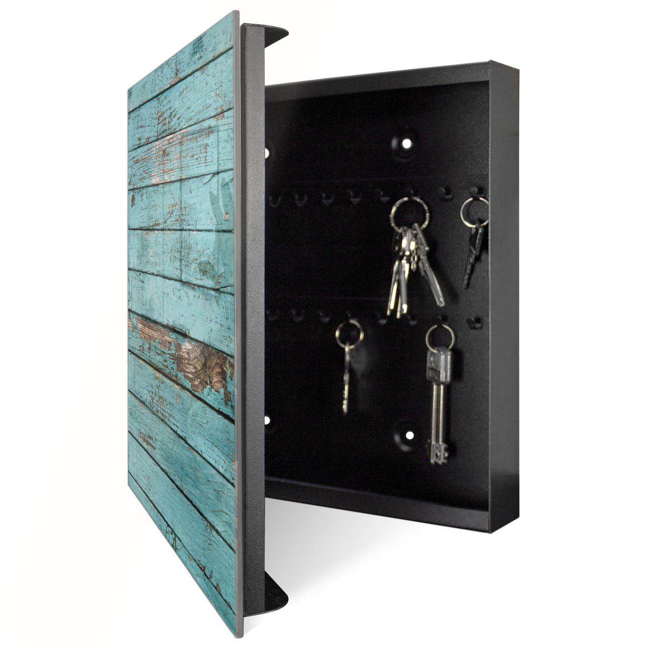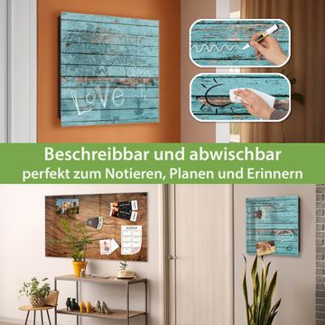 Bringe Ordnung und Eleganz in deinen Eingangsbereich mit dem banjado Schlüsselkasten Motiv Motiv Blaue Holzlatten. Die moderne Schlüsselbox kombiniert funktionales Design mit hochwertiger Verarbeitung und wird so zu einem echten Hingucker in Flur, Büro oder Ferienwohnung. ✅ Stilvolle Schlüsselaufbewahrung mit Glasfront im Motiv Motiv Blaue Holzlatten Der Design-Schlüsselkasten Motiv Motiv Blaue Holzlatten bietet Platz für bis zu 50 Schlüssel, die auf 5 stabilen Reihen mit je 10 Haken übersichtlich verstaut werden. Mit seinen kompakten Maßen von 30 x 30 x 5 cm passt die Schlüsselbox perfekt auch in kleinere Räume. Der schwarz lackierte Stahlkorpus mit rechts angeschlagenem Türscharnier harmoniert mit der Glasfront und fügt sich nahtlos in jedes Wohnambiente ein. Ob als Schlüsselorganizer für Zuhause oder als praktische Lösung für Büros, Praxen und Gewerbe, der banjado Schlüsselkasten sorgt für Ordnung und Übersicht. Dank der magnetischen, mit Kreidestiften beschreibbaren Glasfront kannst du Notizen anheften oder Termine direkt auf der Oberfläche festhalten. Die Schlüsselbox Motiv Motiv Blaue Holzlatten zur Wandmontage wird inklusive Befestigungsmaterial geliefert und ist schnell angebracht. So hast du deine Schlüssel jederzeit griffbereit und zugleich stilvoll verstaut. Mit diesem banjado Schlüsselkasten Motiv Motiv Blaue Holzlatten kombinierst du praktische Aufbewahrung mit stilvollem Wohndesign. Ob privat oder geschäftlich, die Schlüsselbox sorgt für mehr Ordnung, Übersicht und ein wohnliches Ambiente.Vorteile im Überblick