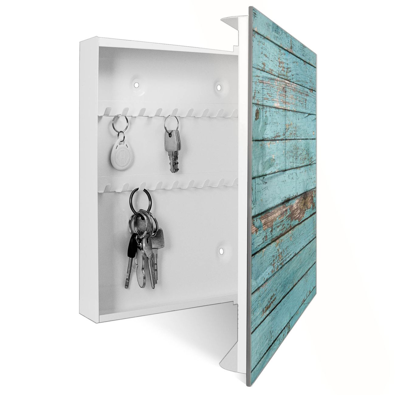 Bringe Ordnung und Eleganz in deinen Eingangsbereich mit dem banjado Schlüsselkasten Motiv Motiv Blaue Holzlatten. Die moderne Schlüsselbox kombiniert funktionales Design mit hochwertiger Verarbeitung und wird so zu einem echten Hingucker in Flur, Büro oder Ferienwohnung. ✅ Stilvolle Schlüsselaufbewahrung mit Glasfront im Motiv Motiv Blaue Holzlatten Der Design-Schlüsselkasten Motiv Motiv Blaue Holzlatten bietet Platz für bis zu 50 Schlüssel, die auf 5 stabilen Reihen mit je 10 Haken übersichtlich verstaut werden. Mit seinen kompakten Maßen von 30 x 30 x 5 cm passt die Schlüsselbox perfekt auch in kleinere Räume. Der weiß lackierte Stahlkorpus mit rechts angeschlagenem Türscharnier harmoniert mit der Glasfront und fügt sich nahtlos in jedes Wohnambiente ein. Ob als Schlüsselorganizer für Zuhause oder als praktische Lösung für Büros, Praxen und Gewerbe, der banjado Schlüsselkasten sorgt für Ordnung und Übersicht. Dank der magnetischen, mit Kreidestiften beschreibbaren Glasfront kannst du Notizen anheften oder Termine direkt auf der Oberfläche festhalten. Die Schlüsselbox Motiv Motiv Blaue Holzlatten zur Wandmontage wird inklusive Befestigungsmaterial geliefert und ist schnell angebracht. So hast du deine Schlüssel jederzeit griffbereit und zugleich stilvoll verstaut. Mit diesem banjado Schlüsselkasten Motiv Motiv Blaue Holzlatten kombinierst du praktische Aufbewahrung mit stilvollem Wohndesign. Ob privat oder geschäftlich, die Schlüsselbox sorgt für mehr Ordnung, Übersicht und ein wohnliches Ambiente.Vorteile im Überblick