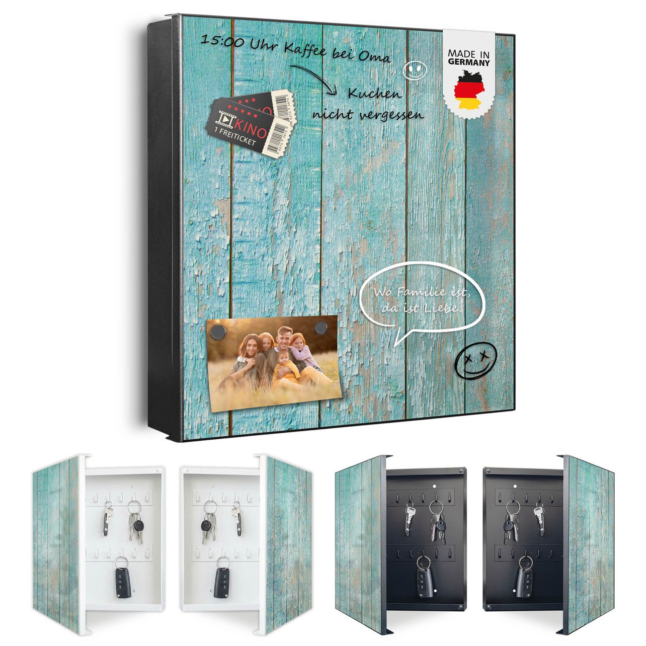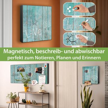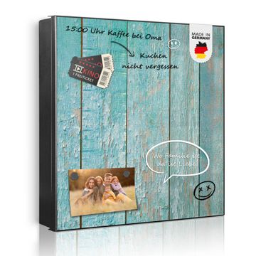 Bringe Ordnung und Eleganz in deinen Eingangsbereich mit dem banjado Schlüsselkasten Motiv Motiv Blaue Planken. Die moderne Schlüsselbox kombiniert funktionales Design mit hochwertiger Verarbeitung und wird so zu einem echten Hingucker in Flur, Büro oder Ferienwohnung. ✅ Stilvolle Schlüsselaufbewahrung mit Motiv Motiv Blaue Planken Der Design-Schlüsselkasten Motiv Motiv Blaue Planken bietet Platz für bis zu 32 Schlüssel, die auf 4 stabilen Reihen mit je 8 Haken übersichtlich verstaut werden. Mit seinen kompakten Maßen von 30 x 30 x 5 cm passt die Schlüsselbox perfekt auch in kleinere Räume. Der schwarz lackierte Stahlkorpus mit rechts angeschlagenem Türscharnier harmoniert mit gedruckten Folie auf der Front und fügt sich nahtlos in jedes Wohnambiente ein. Ob als Schlüsselorganizer für Zuhause oder als praktische Lösung für Büros, Praxen und Gewerbe, der banjado Schlüsselkasten sorgt für Ordnung und Übersicht. Dank der magnetischen, mit Kreidestiften beschreibbaren Folie auf der Front kannst du Notizen anheften oder Termine direkt auf der Oberfläche festhalten. Die Schlüsselbox Motiv Motiv Blaue Planken zur Wandmontage wird inklusive Befestigungsmaterial geliefert und ist schnell angebracht. So hast du deine Schlüssel jederzeit griffbereit und zugleich stilvoll verstaut. Mit diesem banjado Schlüsselkasten Motiv Motiv Blaue Planken kombinierst du praktische Aufbewahrung mit stilvollem Wohndesign. Ob privat oder geschäftlich, die Schlüsselbox sorgt für mehr Ordnung, Übersicht und ein wohnliches Ambiente.Vorteile im Überblick