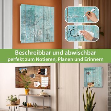 Bringe Ordnung und Eleganz in deinen Eingangsbereich mit dem banjado Schlüsselkasten Motiv Motiv Blaue Planken. Die moderne Schlüsselbox kombiniert funktionales Design mit hochwertiger Verarbeitung und wird so zu einem echten Hingucker in Flur, Büro oder Ferienwohnung. ✅ Stilvolle Schlüsselaufbewahrung mit Glasfront im Motiv Motiv Blaue Planken Der Design-Schlüsselkasten Motiv Motiv Blaue Planken bietet Platz für bis zu 50 Schlüssel, die auf 5 stabilen Reihen mit je 10 Haken übersichtlich verstaut werden. Mit seinen kompakten Maßen von 30 x 30 x 5 cm passt die Schlüsselbox perfekt auch in kleinere Räume. Der weiß lackierte Stahlkorpus mit rechts angeschlagenem Türscharnier harmoniert mit der Glasfront und fügt sich nahtlos in jedes Wohnambiente ein. Ob als Schlüsselorganizer für Zuhause oder als praktische Lösung für Büros, Praxen und Gewerbe, der banjado Schlüsselkasten sorgt für Ordnung und Übersicht. Dank der magnetischen, mit Kreidestiften beschreibbaren Glasfront kannst du Notizen anheften oder Termine direkt auf der Oberfläche festhalten. Die Schlüsselbox Motiv Motiv Blaue Planken zur Wandmontage wird inklusive Befestigungsmaterial geliefert und ist schnell angebracht. So hast du deine Schlüssel jederzeit griffbereit und zugleich stilvoll verstaut. Mit diesem banjado Schlüsselkasten Motiv Motiv Blaue Planken kombinierst du praktische Aufbewahrung mit stilvollem Wohndesign. Ob privat oder geschäftlich, die Schlüsselbox sorgt für mehr Ordnung, Übersicht und ein wohnliches Ambiente.Vorteile im Überblick