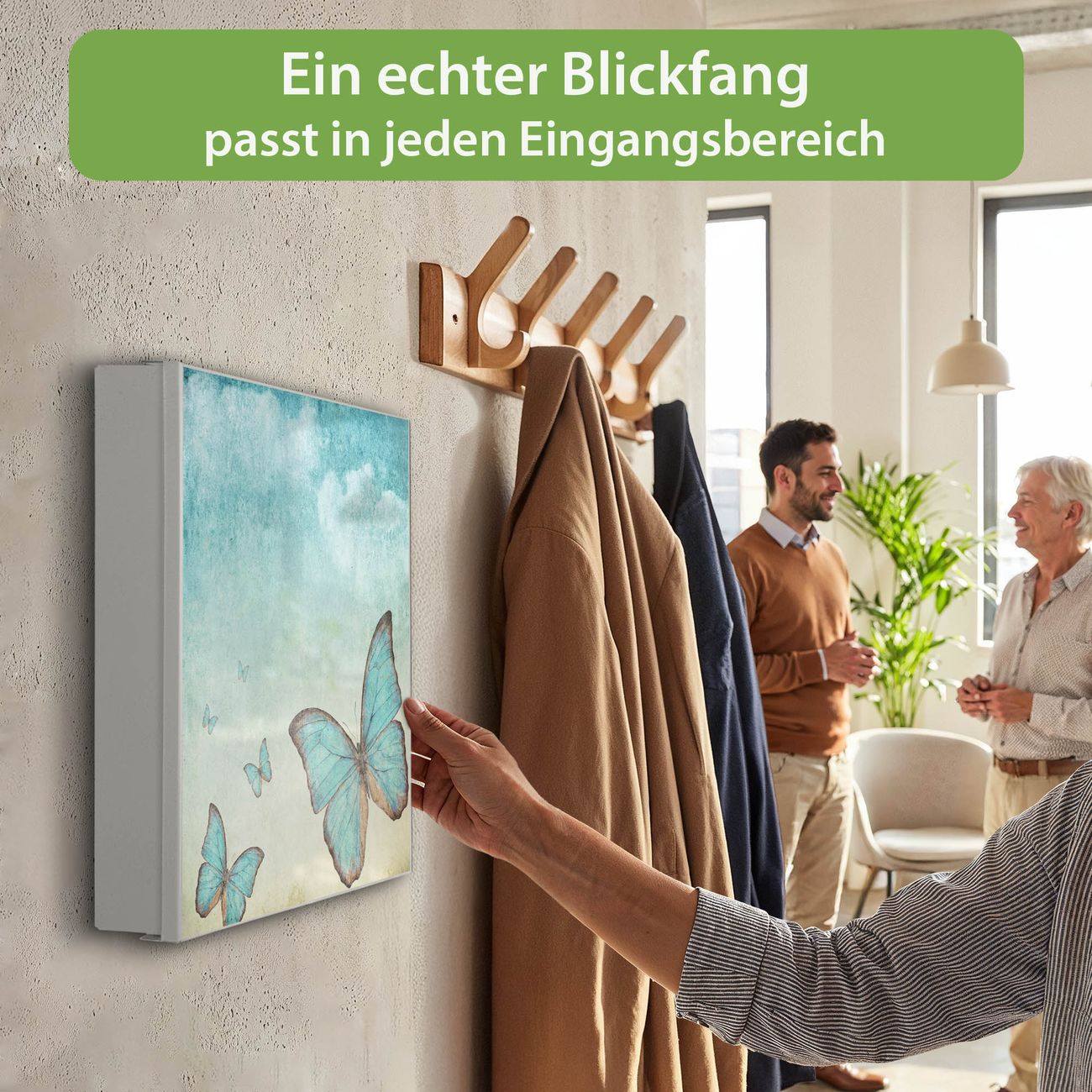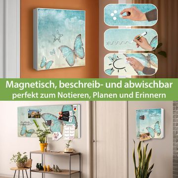 Bringe Ordnung und Eleganz in deinen Eingangsbereich mit dem banjado Schlüsselkasten Motiv Motiv Blaue Schmetterlinge. Die moderne Schlüsselbox kombiniert funktionales Design mit hochwertiger Verarbeitung und wird so zu einem echten Hingucker in Flur, Büro oder Ferienwohnung. ✅ Stilvolle Schlüsselaufbewahrung mit Motiv Motiv Blaue Schmetterlinge Der Design-Schlüsselkasten Motiv Motiv Blaue Schmetterlinge bietet Platz für bis zu 32 Schlüssel, die auf 4 stabilen Reihen mit je 8 Haken übersichtlich verstaut werden. Mit seinen kompakten Maßen von 30 x 30 x 5 cm passt die Schlüsselbox perfekt auch in kleinere Räume. Der weiß lackierte Stahlkorpus mit links angeschlagenem Türscharnier harmoniert mit gedruckten Folie auf der Front und fügt sich nahtlos in jedes Wohnambiente ein. Ob als Schlüsselorganizer für Zuhause oder als praktische Lösung für Büros, Praxen und Gewerbe, der banjado Schlüsselkasten sorgt für Ordnung und Übersicht. Dank der magnetischen, mit Kreidestiften beschreibbaren Folie auf der Front kannst du Notizen anheften oder Termine direkt auf der Oberfläche festhalten. Die Schlüsselbox Motiv Motiv Blaue Schmetterlinge zur Wandmontage wird inklusive Befestigungsmaterial geliefert und ist schnell angebracht. So hast du deine Schlüssel jederzeit griffbereit und zugleich stilvoll verstaut. Mit diesem banjado Schlüsselkasten Motiv Motiv Blaue Schmetterlinge kombinierst du praktische Aufbewahrung mit stilvollem Wohndesign. Ob privat oder geschäftlich, die Schlüsselbox sorgt für mehr Ordnung, Übersicht und ein wohnliches Ambiente.Vorteile im Überblick