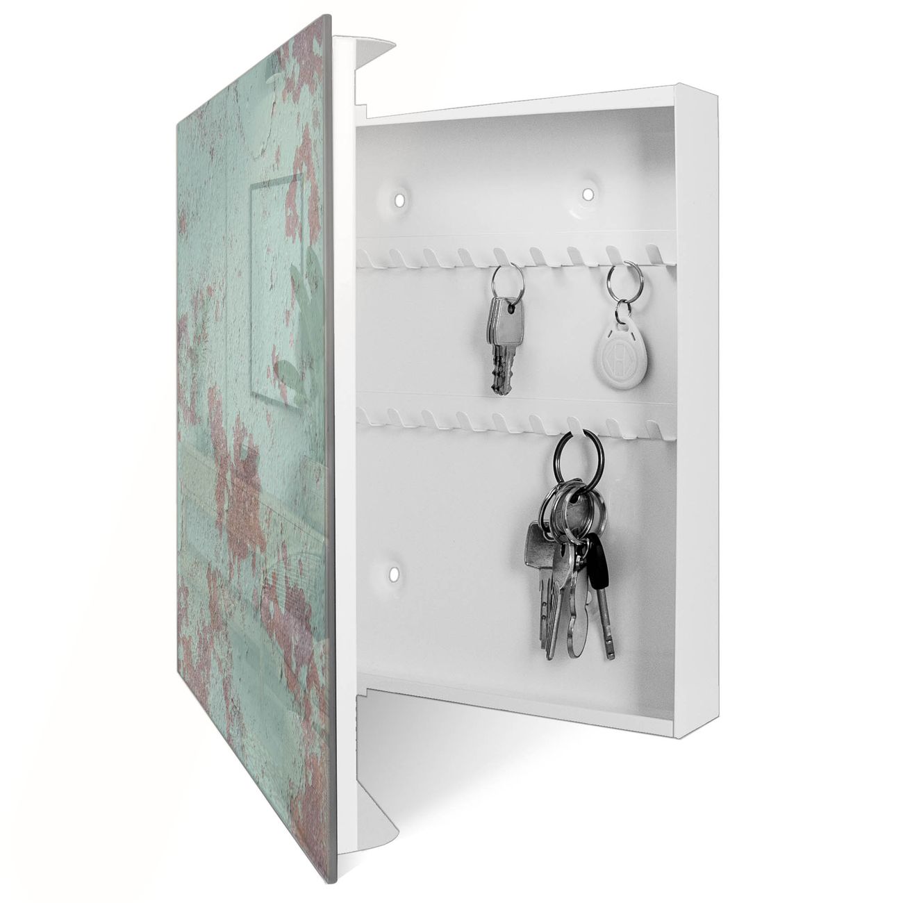 Bringe Ordnung und Eleganz in deinen Eingangsbereich mit dem banjado Schlüsselkasten Motiv Motiv Blaue Struktur. Die moderne Schlüsselbox kombiniert funktionales Design mit hochwertiger Verarbeitung und wird so zu einem echten Hingucker in Flur, Büro oder Ferienwohnung. ✅ Stilvolle Schlüsselaufbewahrung mit Glasfront im Motiv Motiv Blaue Struktur Der Design-Schlüsselkasten Motiv Motiv Blaue Struktur bietet Platz für bis zu 50 Schlüssel, die auf 5 stabilen Reihen mit je 10 Haken übersichtlich verstaut werden. Mit seinen kompakten Maßen von 30 x 30 x 5 cm passt die Schlüsselbox perfekt auch in kleinere Räume. Der weiß lackierte Stahlkorpus mit rechts angeschlagenem Türscharnier harmoniert mit der Glasfront und fügt sich nahtlos in jedes Wohnambiente ein. Ob als Schlüsselorganizer für Zuhause oder als praktische Lösung für Büros, Praxen und Gewerbe, der banjado Schlüsselkasten sorgt für Ordnung und Übersicht. Dank der magnetischen, mit Kreidestiften beschreibbaren Glasfront kannst du Notizen anheften oder Termine direkt auf der Oberfläche festhalten. Die Schlüsselbox Motiv Motiv Blaue Struktur zur Wandmontage wird inklusive Befestigungsmaterial geliefert und ist schnell angebracht. So hast du deine Schlüssel jederzeit griffbereit und zugleich stilvoll verstaut. Mit diesem banjado Schlüsselkasten Motiv Motiv Blaue Struktur kombinierst du praktische Aufbewahrung mit stilvollem Wohndesign. Ob privat oder geschäftlich, die Schlüsselbox sorgt für mehr Ordnung, Übersicht und ein wohnliches Ambiente.Vorteile im Überblick
