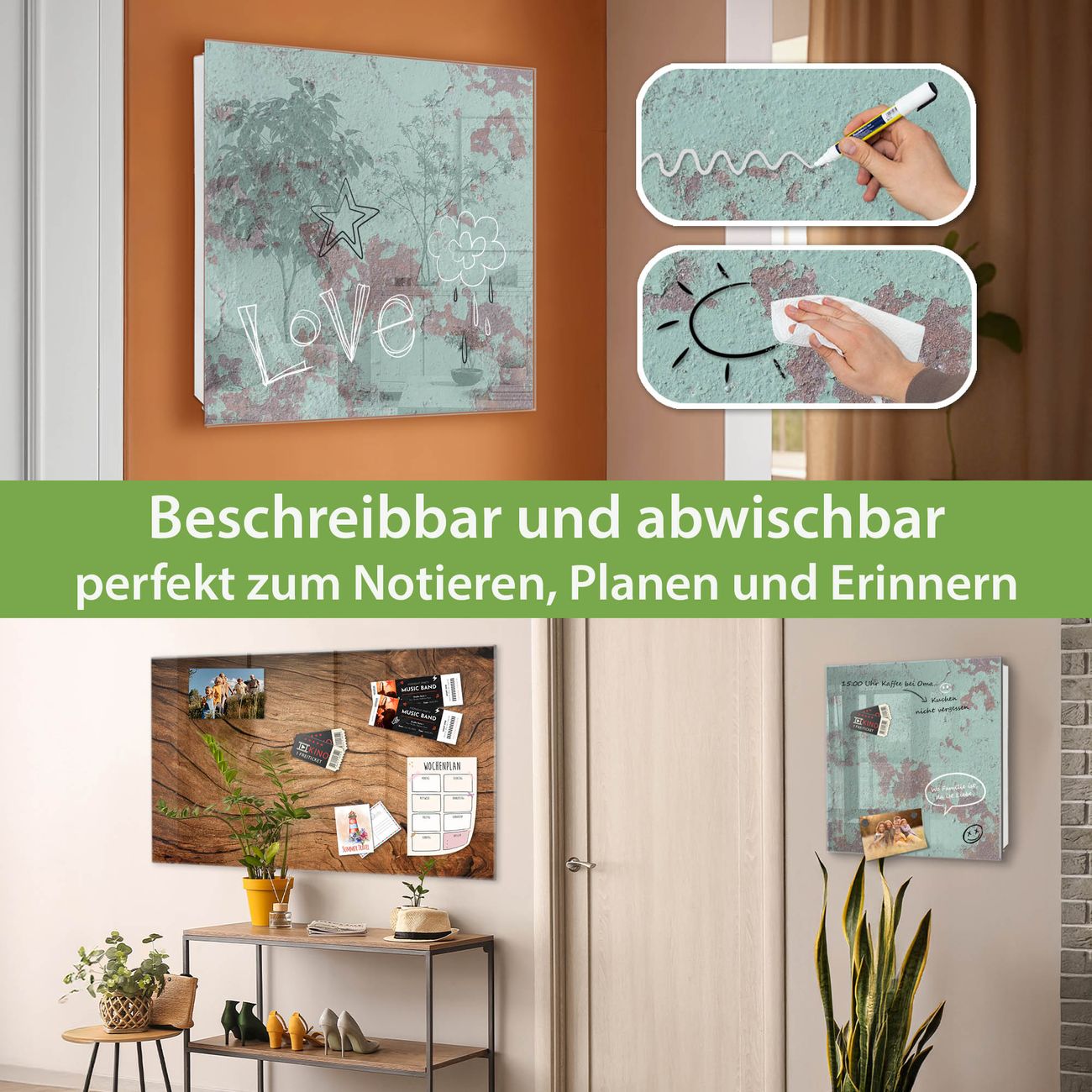 ✅ Magnetisch und mit Kreidestift beschreibbar, gehärtetes Glas, links angeschlagene TürOrdnung und Design in einem