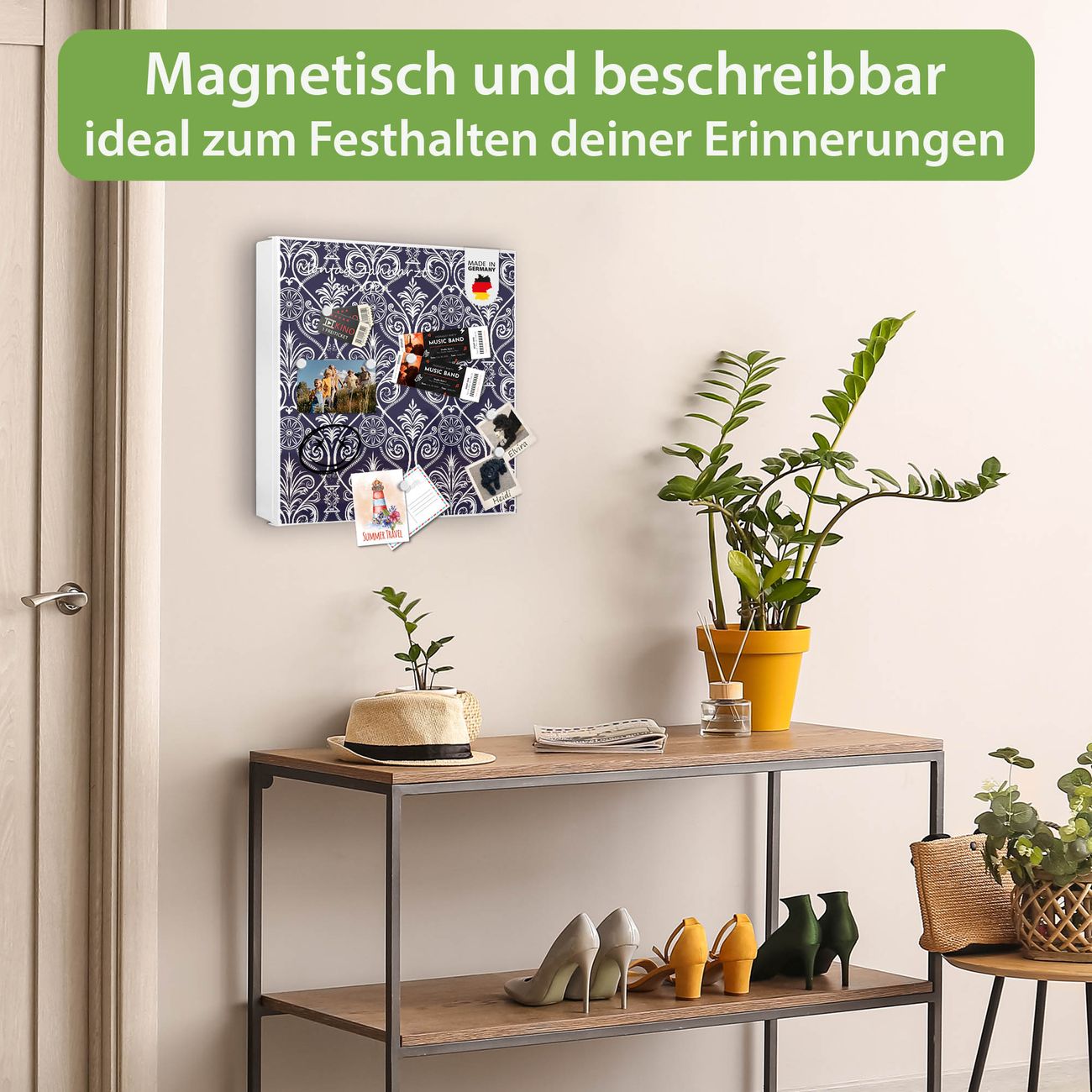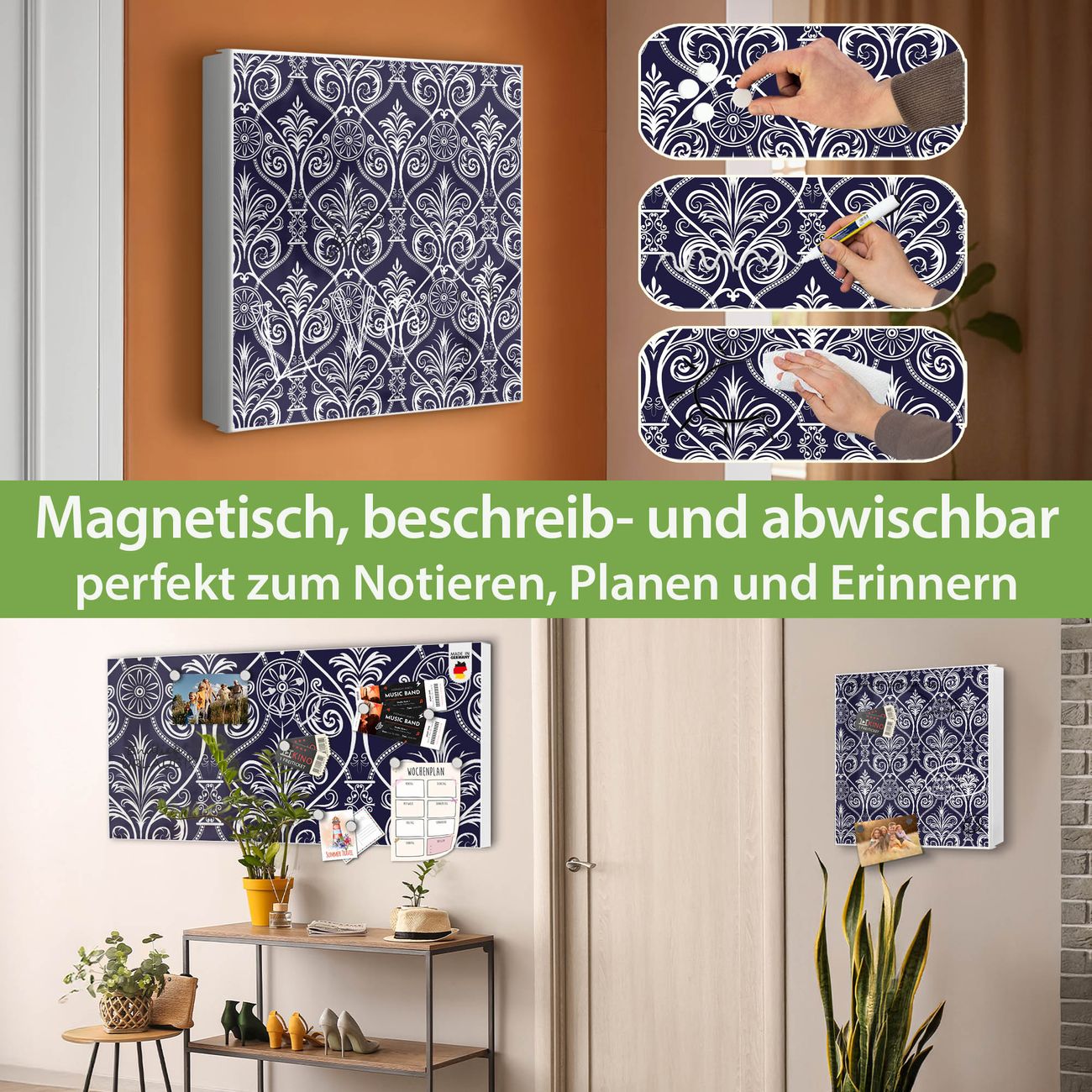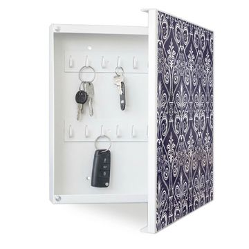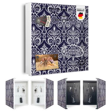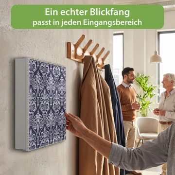 Bringe Ordnung und Eleganz in deinen Eingangsbereich mit dem banjado Schlüsselkasten Motiv Motiv Blaue Tapete. Die moderne Schlüsselbox kombiniert funktionales Design mit hochwertiger Verarbeitung und wird so zu einem echten Hingucker in Flur, Büro oder Ferienwohnung. ✅ Stilvolle Schlüsselaufbewahrung mit Motiv Motiv Blaue Tapete Der Design-Schlüsselkasten Motiv Motiv Blaue Tapete bietet Platz für bis zu 32 Schlüssel, die auf 4 stabilen Reihen mit je 8 Haken übersichtlich verstaut werden. Mit seinen kompakten Maßen von 30 x 30 x 5 cm passt die Schlüsselbox perfekt auch in kleinere Räume. Der weiß lackierte Stahlkorpus mit rechts angeschlagenem Türscharnier harmoniert mit gedruckten Folie auf der Front und fügt sich nahtlos in jedes Wohnambiente ein. Ob als Schlüsselorganizer für Zuhause oder als praktische Lösung für Büros, Praxen und Gewerbe, der banjado Schlüsselkasten sorgt für Ordnung und Übersicht. Dank der magnetischen, mit Kreidestiften beschreibbaren Folie auf der Front kannst du Notizen anheften oder Termine direkt auf der Oberfläche festhalten. Die Schlüsselbox Motiv Motiv Blaue Tapete zur Wandmontage wird inklusive Befestigungsmaterial geliefert und ist schnell angebracht. So hast du deine Schlüssel jederzeit griffbereit und zugleich stilvoll verstaut. Mit diesem banjado Schlüsselkasten Motiv Motiv Blaue Tapete kombinierst du praktische Aufbewahrung mit stilvollem Wohndesign. Ob privat oder geschäftlich, die Schlüsselbox sorgt für mehr Ordnung, Übersicht und ein wohnliches Ambiente.Vorteile im Überblick