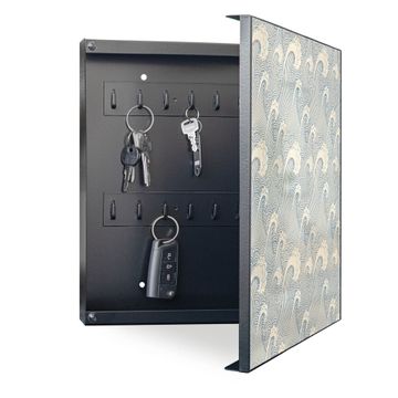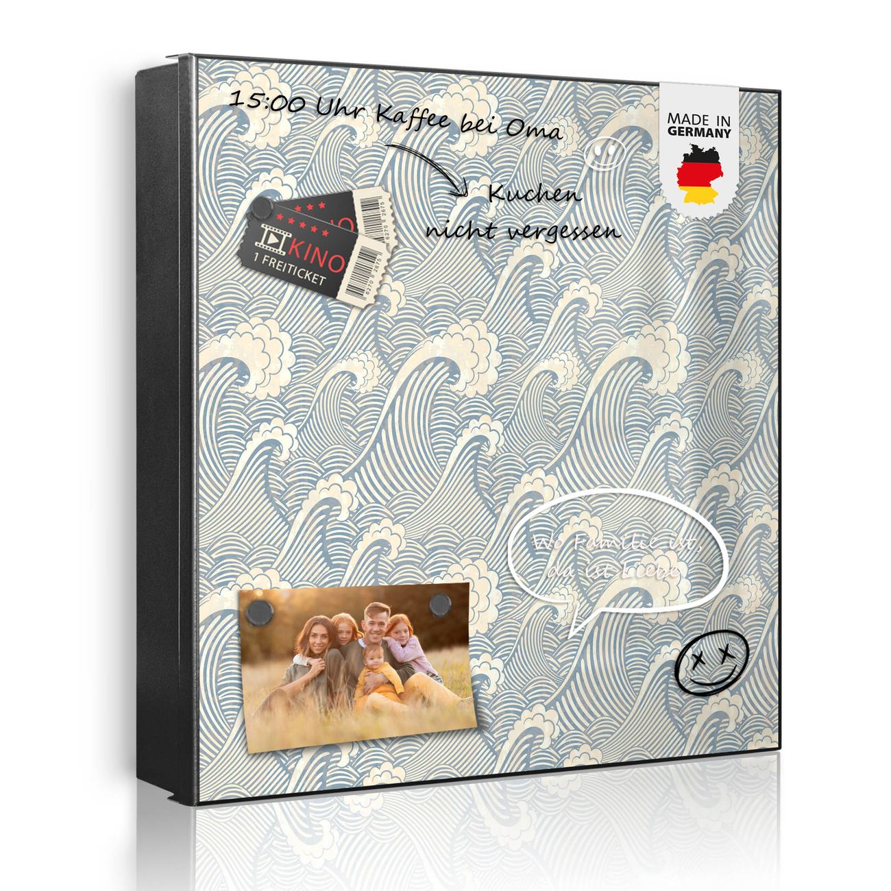 Bringe Ordnung und Eleganz in deinen Eingangsbereich mit dem banjado Schlüsselkasten Motiv Motiv Blaue Wellen . Die moderne Schlüsselbox kombiniert funktionales Design mit hochwertiger Verarbeitung und wird so zu einem echten Hingucker in Flur, Büro oder Ferienwohnung. ✅ Stilvolle Schlüsselaufbewahrung mit Motiv Motiv Blaue Wellen Der Design-Schlüsselkasten Motiv Motiv Blaue Wellen bietet Platz für bis zu 32 Schlüssel, die auf 4 stabilen Reihen mit je 8 Haken übersichtlich verstaut werden. Mit seinen kompakten Maßen von 30 x 30 x 5 cm passt die Schlüsselbox perfekt auch in kleinere Räume. Der schwarz lackierte Stahlkorpus mit rechts angeschlagenem Türscharnier harmoniert mit gedruckten Folie auf der Front und fügt sich nahtlos in jedes Wohnambiente ein. Ob als Schlüsselorganizer für Zuhause oder als praktische Lösung für Büros, Praxen und Gewerbe, der banjado Schlüsselkasten sorgt für Ordnung und Übersicht. Dank der magnetischen, mit Kreidestiften beschreibbaren Folie auf der Front kannst du Notizen anheften oder Termine direkt auf der Oberfläche festhalten. Die Schlüsselbox Motiv Motiv Blaue Wellen zur Wandmontage wird inklusive Befestigungsmaterial geliefert und ist schnell angebracht. So hast du deine Schlüssel jederzeit griffbereit und zugleich stilvoll verstaut. Mit diesem banjado Schlüsselkasten Motiv Motiv Blaue Wellen kombinierst du praktische Aufbewahrung mit stilvollem Wohndesign. Ob privat oder geschäftlich, die Schlüsselbox sorgt für mehr Ordnung, Übersicht und ein wohnliches Ambiente.Vorteile im Überblick