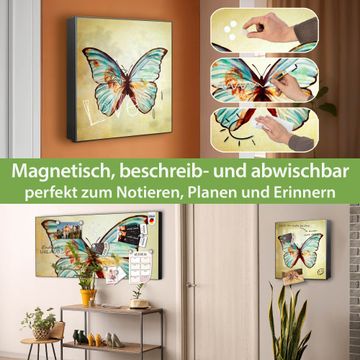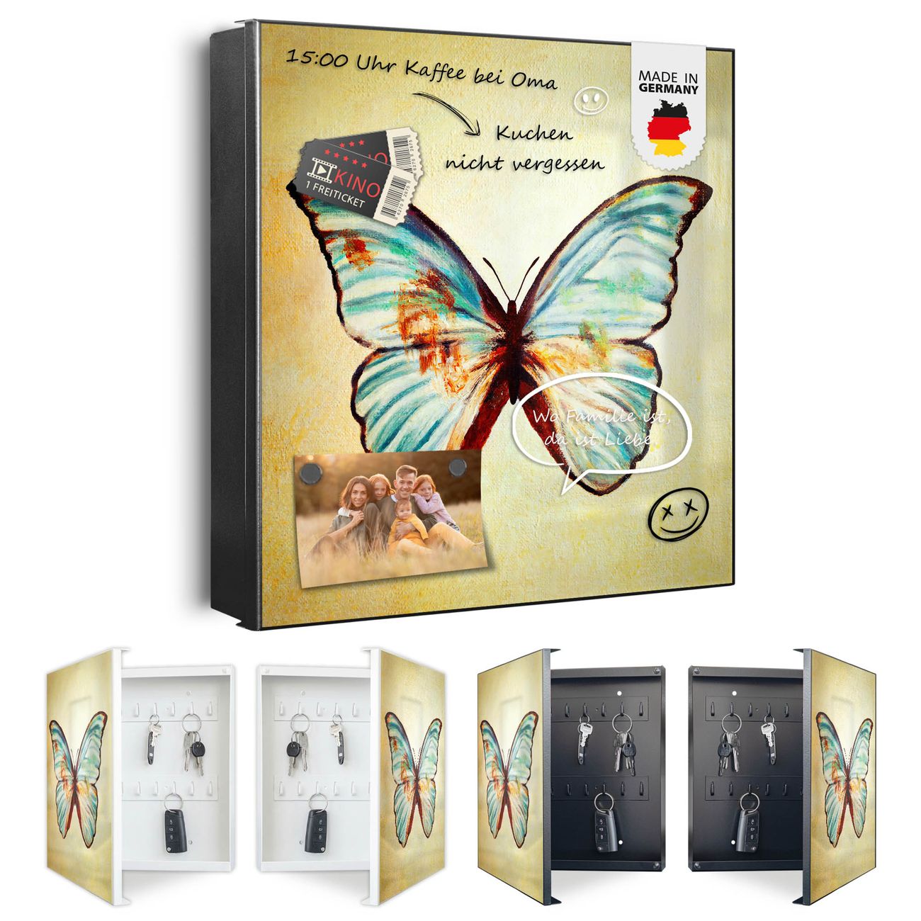 Bringe Ordnung und Eleganz in deinen Eingangsbereich mit dem banjado Schlüsselkasten Motiv Motiv Blauer Falter. Die moderne Schlüsselbox kombiniert funktionales Design mit hochwertiger Verarbeitung und wird so zu einem echten Hingucker in Flur, Büro oder Ferienwohnung. ✅ Stilvolle Schlüsselaufbewahrung mit Motiv Motiv Blauer Falter Der Design-Schlüsselkasten Motiv Motiv Blauer Falter bietet Platz für bis zu 32 Schlüssel, die auf 4 stabilen Reihen mit je 8 Haken übersichtlich verstaut werden. Mit seinen kompakten Maßen von 30 x 30 x 5 cm passt die Schlüsselbox perfekt auch in kleinere Räume. Der schwarz lackierte Stahlkorpus mit rechts angeschlagenem Türscharnier harmoniert mit gedruckten Folie auf der Front und fügt sich nahtlos in jedes Wohnambiente ein. Ob als Schlüsselorganizer für Zuhause oder als praktische Lösung für Büros, Praxen und Gewerbe, der banjado Schlüsselkasten sorgt für Ordnung und Übersicht. Dank der magnetischen, mit Kreidestiften beschreibbaren Folie auf der Front kannst du Notizen anheften oder Termine direkt auf der Oberfläche festhalten. Die Schlüsselbox Motiv Motiv Blauer Falter zur Wandmontage wird inklusive Befestigungsmaterial geliefert und ist schnell angebracht. So hast du deine Schlüssel jederzeit griffbereit und zugleich stilvoll verstaut. Mit diesem banjado Schlüsselkasten Motiv Motiv Blauer Falter kombinierst du praktische Aufbewahrung mit stilvollem Wohndesign. Ob privat oder geschäftlich, die Schlüsselbox sorgt für mehr Ordnung, Übersicht und ein wohnliches Ambiente.Vorteile im Überblick