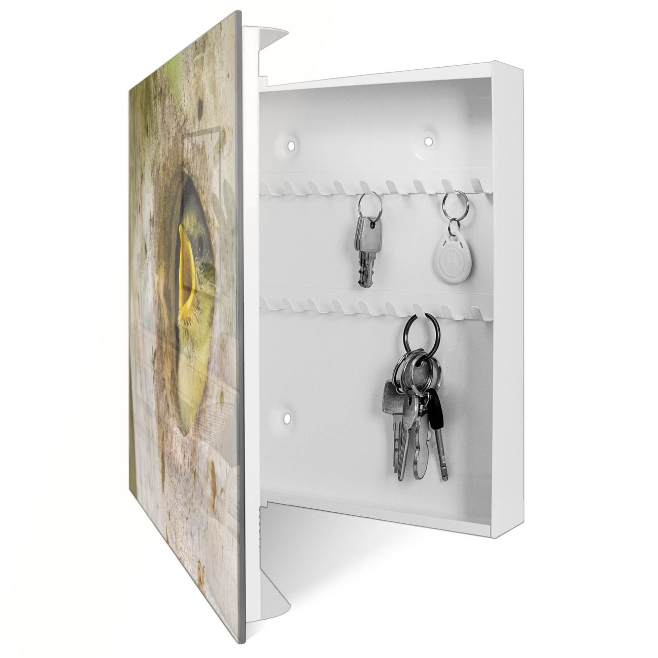 Bringe Ordnung und Eleganz in deinen Eingangsbereich mit dem banjado Schlüsselkasten Motiv Motiv Blaumeise. Die moderne Schlüsselbox kombiniert funktionales Design mit hochwertiger Verarbeitung und wird so zu einem echten Hingucker in Flur, Büro oder Ferienwohnung. ✅ Stilvolle Schlüsselaufbewahrung mit Glasfront im Motiv Motiv Blaumeise Der Design-Schlüsselkasten Motiv Motiv Blaumeise bietet Platz für bis zu 50 Schlüssel, die auf 5 stabilen Reihen mit je 10 Haken übersichtlich verstaut werden. Mit seinen kompakten Maßen von 30 x 30 x 5 cm passt die Schlüsselbox perfekt auch in kleinere Räume. Der weiß lackierte Stahlkorpus mit rechts angeschlagenem Türscharnier harmoniert mit der Glasfront und fügt sich nahtlos in jedes Wohnambiente ein. Ob als Schlüsselorganizer für Zuhause oder als praktische Lösung für Büros, Praxen und Gewerbe, der banjado Schlüsselkasten sorgt für Ordnung und Übersicht. Dank der magnetischen, mit Kreidestiften beschreibbaren Glasfront kannst du Notizen anheften oder Termine direkt auf der Oberfläche festhalten. Die Schlüsselbox Motiv Motiv Blaumeise zur Wandmontage wird inklusive Befestigungsmaterial geliefert und ist schnell angebracht. So hast du deine Schlüssel jederzeit griffbereit und zugleich stilvoll verstaut. Mit diesem banjado Schlüsselkasten Motiv Motiv Blaumeise kombinierst du praktische Aufbewahrung mit stilvollem Wohndesign. Ob privat oder geschäftlich, die Schlüsselbox sorgt für mehr Ordnung, Übersicht und ein wohnliches Ambiente.Vorteile im Überblick
