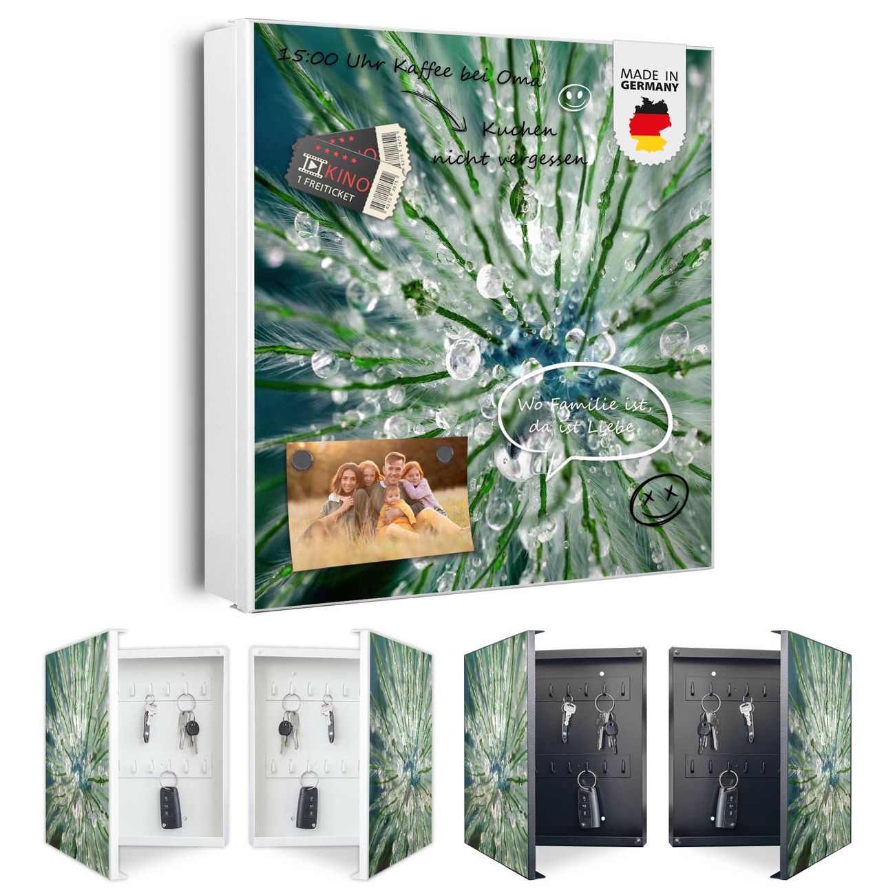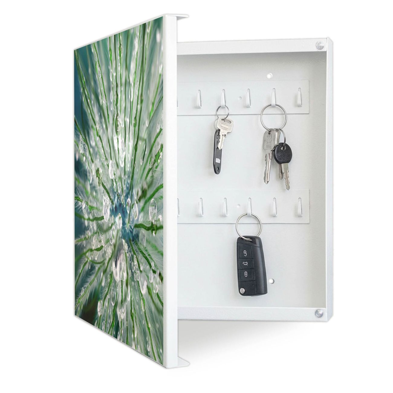 Bringe Ordnung und Eleganz in deinen Eingangsbereich mit dem banjado Schlüsselkasten Motiv Motiv Blüte Mit Tautropfen. Die moderne Schlüsselbox kombiniert funktionales Design mit hochwertiger Verarbeitung und wird so zu einem echten Hingucker in Flur, Büro oder Ferienwohnung. ✅ Stilvolle Schlüsselaufbewahrung mit Motiv Motiv Blüte Mit Tautropfen Der Design-Schlüsselkasten Motiv Motiv Blüte Mit Tautropfen bietet Platz für bis zu 32 Schlüssel, die auf 4 stabilen Reihen mit je 8 Haken übersichtlich verstaut werden. Mit seinen kompakten Maßen von 30 x 30 x 5 cm passt die Schlüsselbox perfekt auch in kleinere Räume. Der weiß lackierte Stahlkorpus mit links angeschlagenem Türscharnier harmoniert mit gedruckten Folie auf der Front und fügt sich nahtlos in jedes Wohnambiente ein. Ob als Schlüsselorganizer für Zuhause oder als praktische Lösung für Büros, Praxen und Gewerbe, der banjado Schlüsselkasten sorgt für Ordnung und Übersicht. Dank der magnetischen, mit Kreidestiften beschreibbaren Folie auf der Front kannst du Notizen anheften oder Termine direkt auf der Oberfläche festhalten. Die Schlüsselbox Motiv Motiv Blüte Mit Tautropfen zur Wandmontage wird inklusive Befestigungsmaterial geliefert und ist schnell angebracht. So hast du deine Schlüssel jederzeit griffbereit und zugleich stilvoll verstaut. Mit diesem banjado Schlüsselkasten Motiv Motiv Blüte Mit Tautropfen kombinierst du praktische Aufbewahrung mit stilvollem Wohndesign. Ob privat oder geschäftlich, die Schlüsselbox sorgt für mehr Ordnung, Übersicht und ein wohnliches Ambiente.Vorteile im Überblick