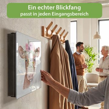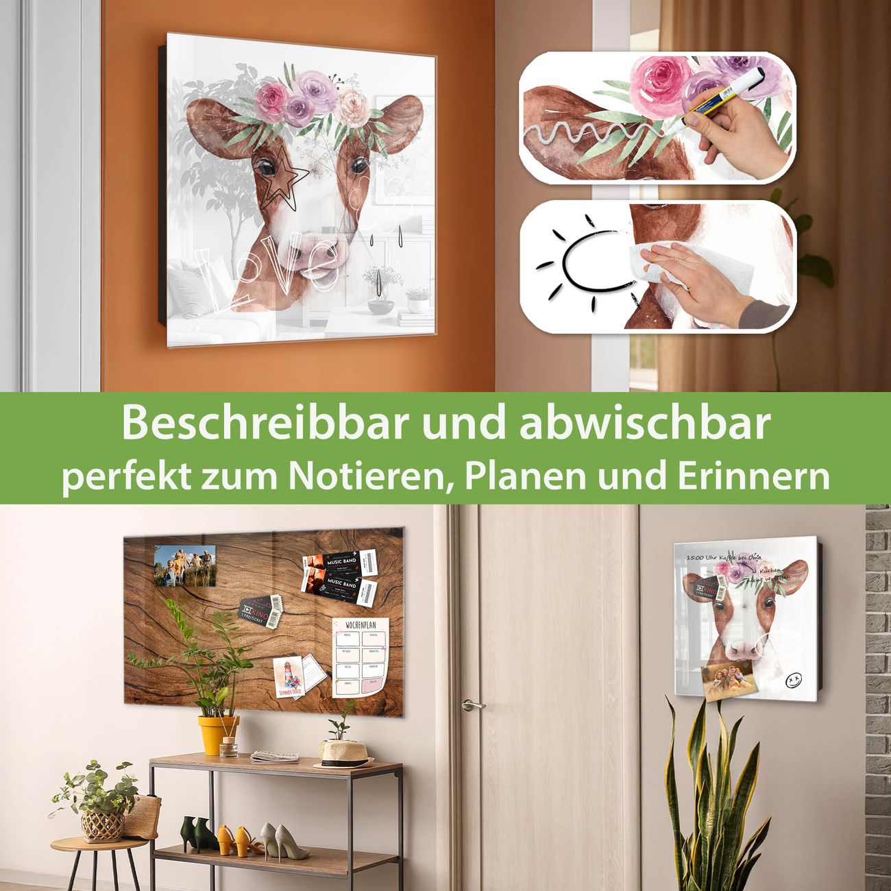 Bringe Ordnung und Eleganz in deinen Eingangsbereich mit dem banjado Schlüsselkasten Motiv Motiv Blumenkronen-Kuh. Die moderne Schlüsselbox kombiniert funktionales Design mit hochwertiger Verarbeitung und wird so zu einem echten Hingucker in Flur, Büro oder Ferienwohnung. ✅ Stilvolle Schlüsselaufbewahrung mit Glasfront im Motiv Motiv Blumenkronen-Kuh Der Design-Schlüsselkasten Motiv Motiv Blumenkronen-Kuh bietet Platz für bis zu 50 Schlüssel, die auf 5 stabilen Reihen mit je 10 Haken übersichtlich verstaut werden. Mit seinen kompakten Maßen von 30 x 30 x 5 cm passt die Schlüsselbox perfekt auch in kleinere Räume. Der schwarz lackierte Stahlkorpus mit rechts angeschlagenem Türscharnier harmoniert mit der Glasfront und fügt sich nahtlos in jedes Wohnambiente ein. Ob als Schlüsselorganizer für Zuhause oder als praktische Lösung für Büros, Praxen und Gewerbe, der banjado Schlüsselkasten sorgt für Ordnung und Übersicht. Dank der magnetischen, mit Kreidestiften beschreibbaren Glasfront kannst du Notizen anheften oder Termine direkt auf der Oberfläche festhalten. Die Schlüsselbox Motiv Motiv Blumenkronen-Kuh zur Wandmontage wird inklusive Befestigungsmaterial geliefert und ist schnell angebracht. So hast du deine Schlüssel jederzeit griffbereit und zugleich stilvoll verstaut. Mit diesem banjado Schlüsselkasten Motiv Motiv Blumenkronen-Kuh kombinierst du praktische Aufbewahrung mit stilvollem Wohndesign. Ob privat oder geschäftlich, die Schlüsselbox sorgt für mehr Ordnung, Übersicht und ein wohnliches Ambiente.Vorteile im Überblick
