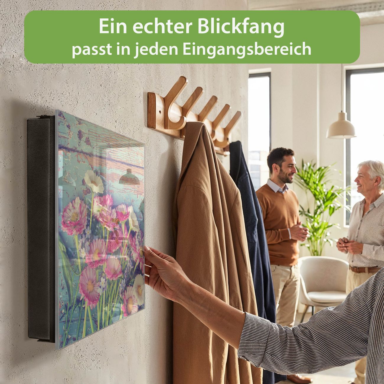 Bringe Ordnung und Eleganz in deinen Eingangsbereich mit dem banjado Schlüsselkasten Motiv Motiv Blumenpfücken. Die moderne Schlüsselbox kombiniert funktionales Design mit hochwertiger Verarbeitung und wird so zu einem echten Hingucker in Flur, Büro oder Ferienwohnung. ✅ Stilvolle Schlüsselaufbewahrung mit Glasfront im Motiv Motiv Blumenpfücken Der Design-Schlüsselkasten Motiv Motiv Blumenpfücken bietet Platz für bis zu 50 Schlüssel, die auf 5 stabilen Reihen mit je 10 Haken übersichtlich verstaut werden. Mit seinen kompakten Maßen von 30 x 30 x 5 cm passt die Schlüsselbox perfekt auch in kleinere Räume. Der schwarz lackierte Stahlkorpus mit rechts angeschlagenem Türscharnier harmoniert mit der Glasfront und fügt sich nahtlos in jedes Wohnambiente ein. Ob als Schlüsselorganizer für Zuhause oder als praktische Lösung für Büros, Praxen und Gewerbe, der banjado Schlüsselkasten sorgt für Ordnung und Übersicht. Dank der magnetischen, mit Kreidestiften beschreibbaren Glasfront kannst du Notizen anheften oder Termine direkt auf der Oberfläche festhalten. Die Schlüsselbox Motiv Motiv Blumenpfücken zur Wandmontage wird inklusive Befestigungsmaterial geliefert und ist schnell angebracht. So hast du deine Schlüssel jederzeit griffbereit und zugleich stilvoll verstaut. Mit diesem banjado Schlüsselkasten Motiv Motiv Blumenpfücken kombinierst du praktische Aufbewahrung mit stilvollem Wohndesign. Ob privat oder geschäftlich, die Schlüsselbox sorgt für mehr Ordnung, Übersicht und ein wohnliches Ambiente.Vorteile im Überblick