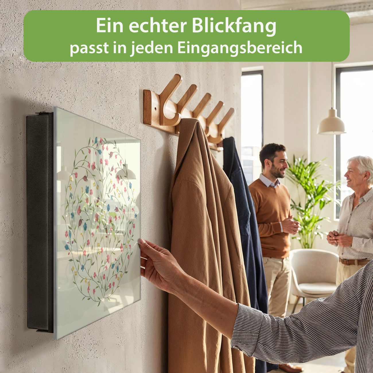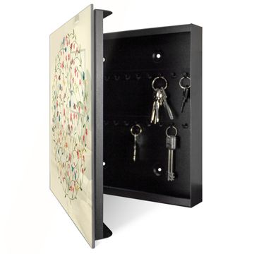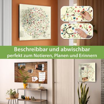 Bringe Ordnung und Eleganz in deinen Eingangsbereich mit dem banjado Schlüsselkasten Motiv Motiv Blumenreigen. Die moderne Schlüsselbox kombiniert funktionales Design mit hochwertiger Verarbeitung und wird so zu einem echten Hingucker in Flur, Büro oder Ferienwohnung. ✅ Stilvolle Schlüsselaufbewahrung mit Glasfront im Motiv Motiv Blumenreigen Der Design-Schlüsselkasten Motiv Motiv Blumenreigen bietet Platz für bis zu 50 Schlüssel, die auf 5 stabilen Reihen mit je 10 Haken übersichtlich verstaut werden. Mit seinen kompakten Maßen von 30 x 30 x 5 cm passt die Schlüsselbox perfekt auch in kleinere Räume. Der schwarz lackierte Stahlkorpus mit rechts angeschlagenem Türscharnier harmoniert mit der Glasfront und fügt sich nahtlos in jedes Wohnambiente ein. Ob als Schlüsselorganizer für Zuhause oder als praktische Lösung für Büros, Praxen und Gewerbe, der banjado Schlüsselkasten sorgt für Ordnung und Übersicht. Dank der magnetischen, mit Kreidestiften beschreibbaren Glasfront kannst du Notizen anheften oder Termine direkt auf der Oberfläche festhalten. Die Schlüsselbox Motiv Motiv Blumenreigen zur Wandmontage wird inklusive Befestigungsmaterial geliefert und ist schnell angebracht. So hast du deine Schlüssel jederzeit griffbereit und zugleich stilvoll verstaut. Mit diesem banjado Schlüsselkasten Motiv Motiv Blumenreigen kombinierst du praktische Aufbewahrung mit stilvollem Wohndesign. Ob privat oder geschäftlich, die Schlüsselbox sorgt für mehr Ordnung, Übersicht und ein wohnliches Ambiente.Vorteile im Überblick